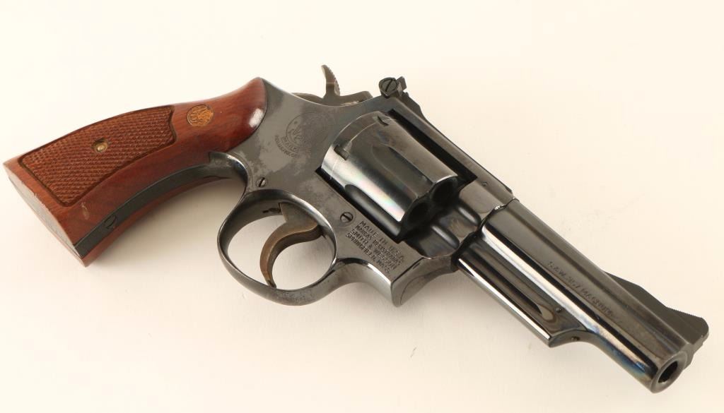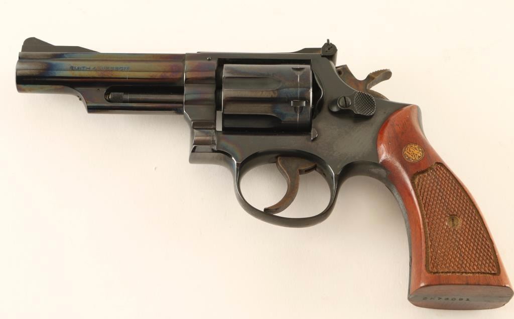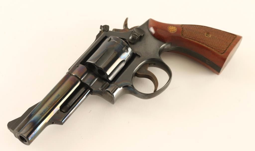 'Combat Magnum' Medium frame double-action revolver chambered in .357 Magnum circa 1967-1977. Features a blued finish, pinned 4" barrel with serrated top rib, shrouded ejector rod, ramped patridge front sight, adjustable micrometer click rear sight, fluted & recessed six-shot cylinder, .265" service trigger, .375" semi-target hammer and two-piece checkered walnut Magna grips with gold S&W medallions. Revolver exhibits approximately 98% of it's original finish showing a faint drag line on the cylinder, minimal handling marks and what appear to be dried oil on fair amount of the metal surfaces. Action is crisp with solid lock-up, bore is pristine, and wood grips are near fine with a couple minor losses. Condition: will clean to excellent. ***Modern Firearm***