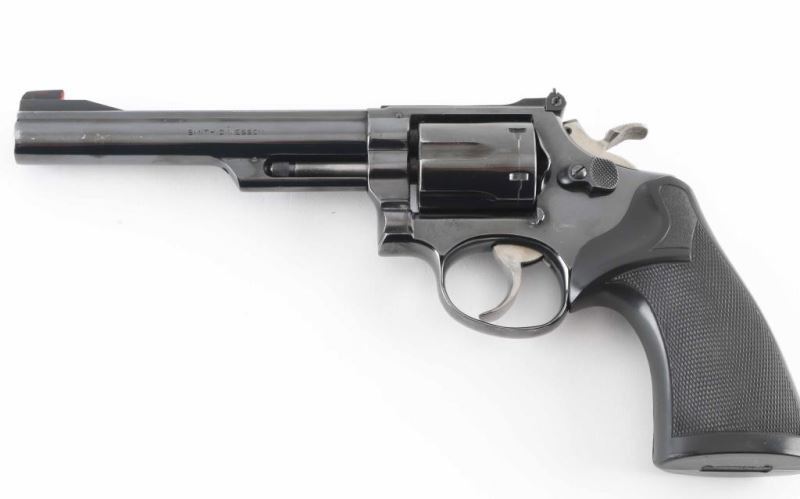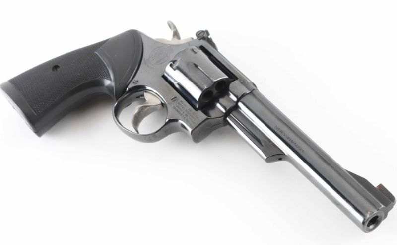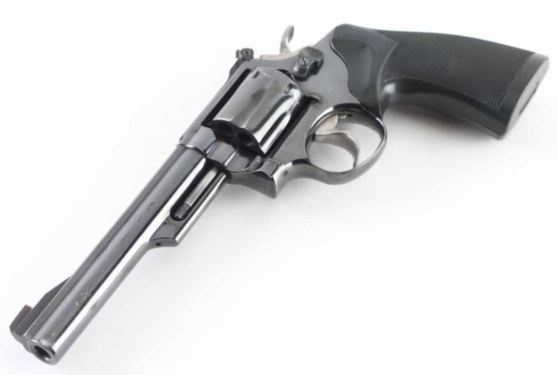 Medium frame double action revolver features pinned barrel & recessed cylinder for cartridge rims, blued finish, checkered black rubber Pachmayr grip, 6" barrel, adjustable sights (Partridge type front blade), smooth polished wide trigger, case colored checkered wide spur hammer. Bore and charge holes are very good condition. Retains 85% blue with losses at muzzle, cylinder drag line, scratches on sides and on barrel, small pits or dings to edges of barrel top rib. Grips are very good condition. Action is smooth, lock-up is good. Condition is NRA Very Good *** Modern Firearm ***