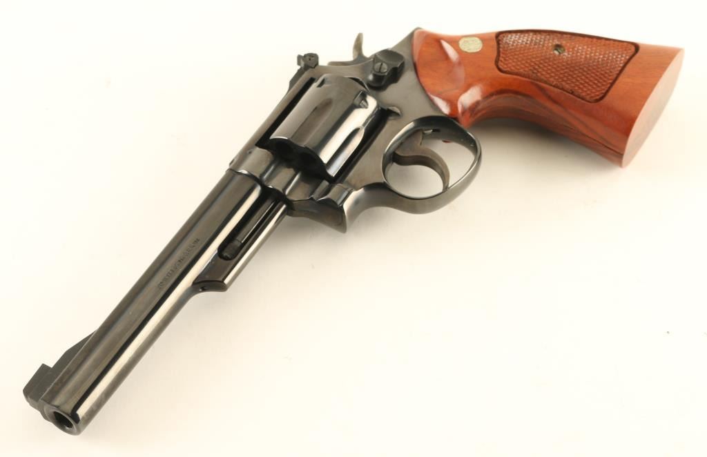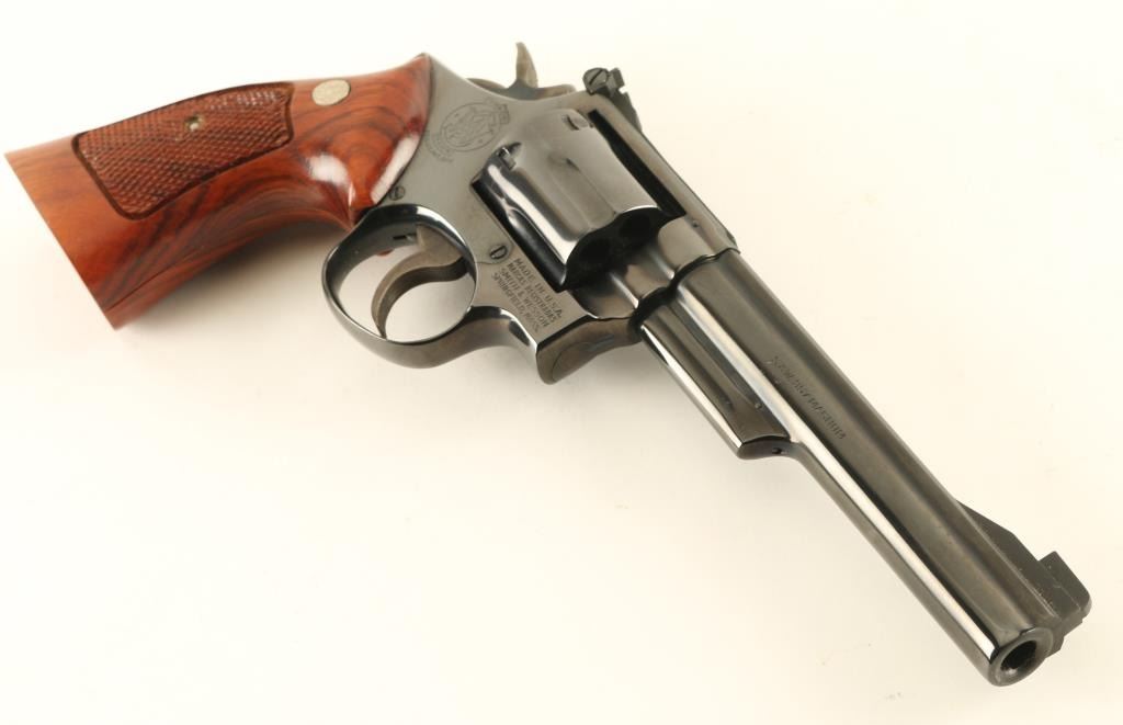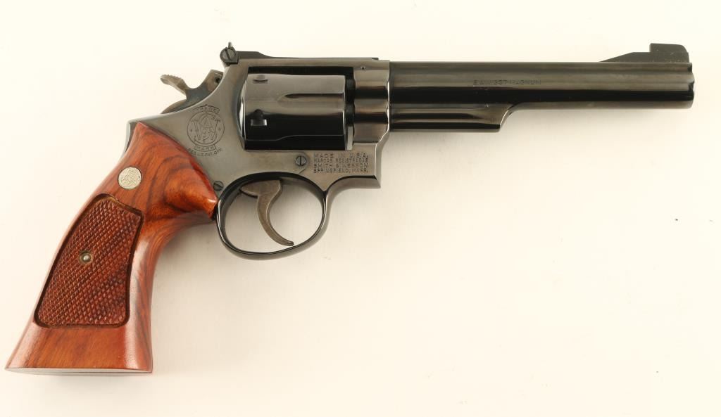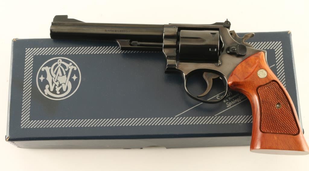 Double/single action revolver manufactured circa 1975. Pinned barrel & recessed cylinder for cartridge rims. Features blued finish, checkered wood target style grips with S&W medallions, 6" barrel, adjustable sights with Partridge front blade, case colored grooved narrow trigger, case colored checkered medium width spur hammer. Bore and charge holes are excellent. Overall condition is like new with few signs of handling. Action is smooth with tight lock-up. Includes blue/silver factory cardboard box, factory paperwork & screwdriver. Condition is NRA Excellent - like new *** Modern Firearm ***