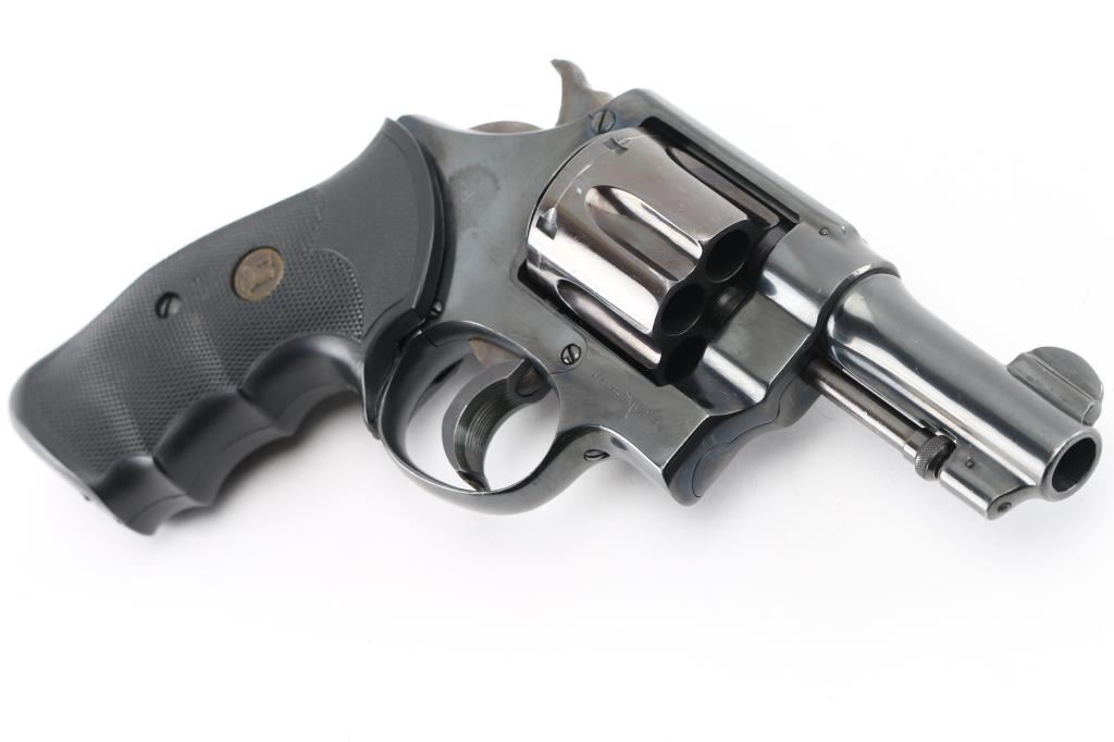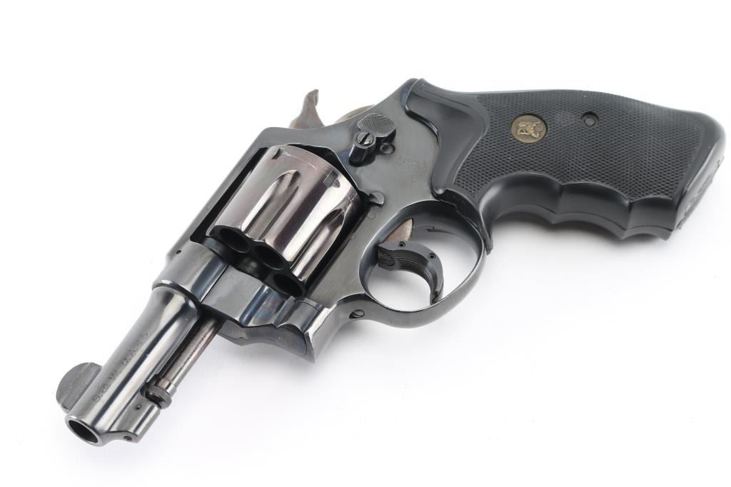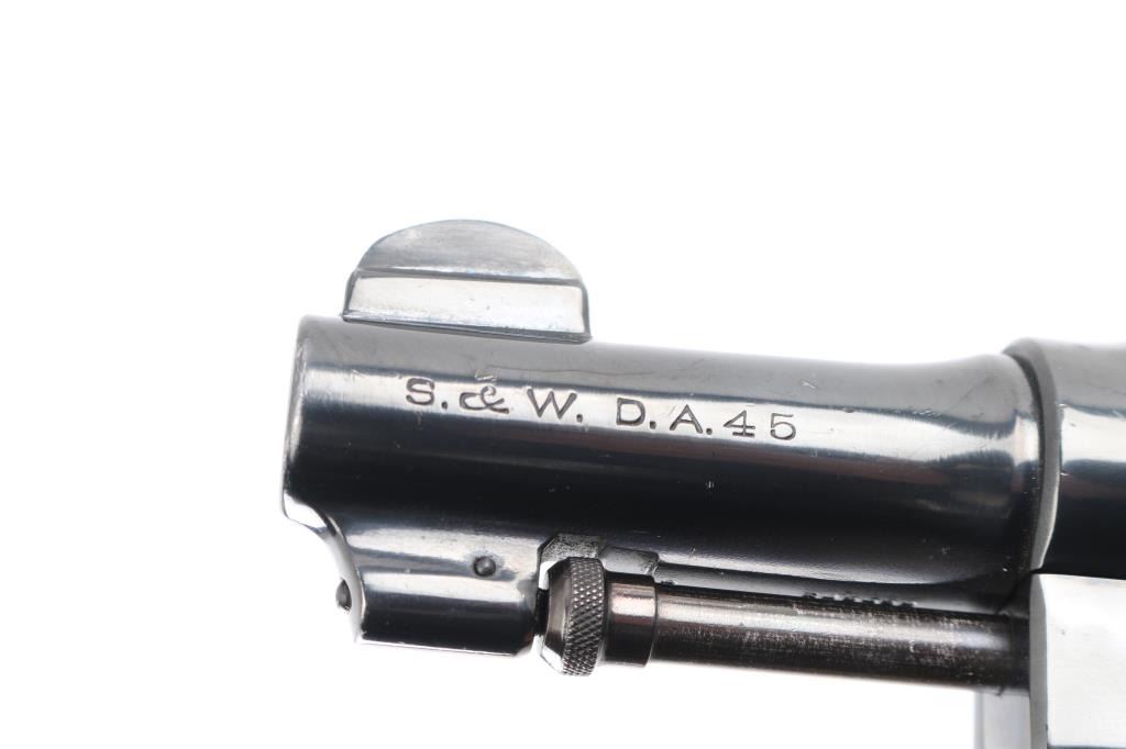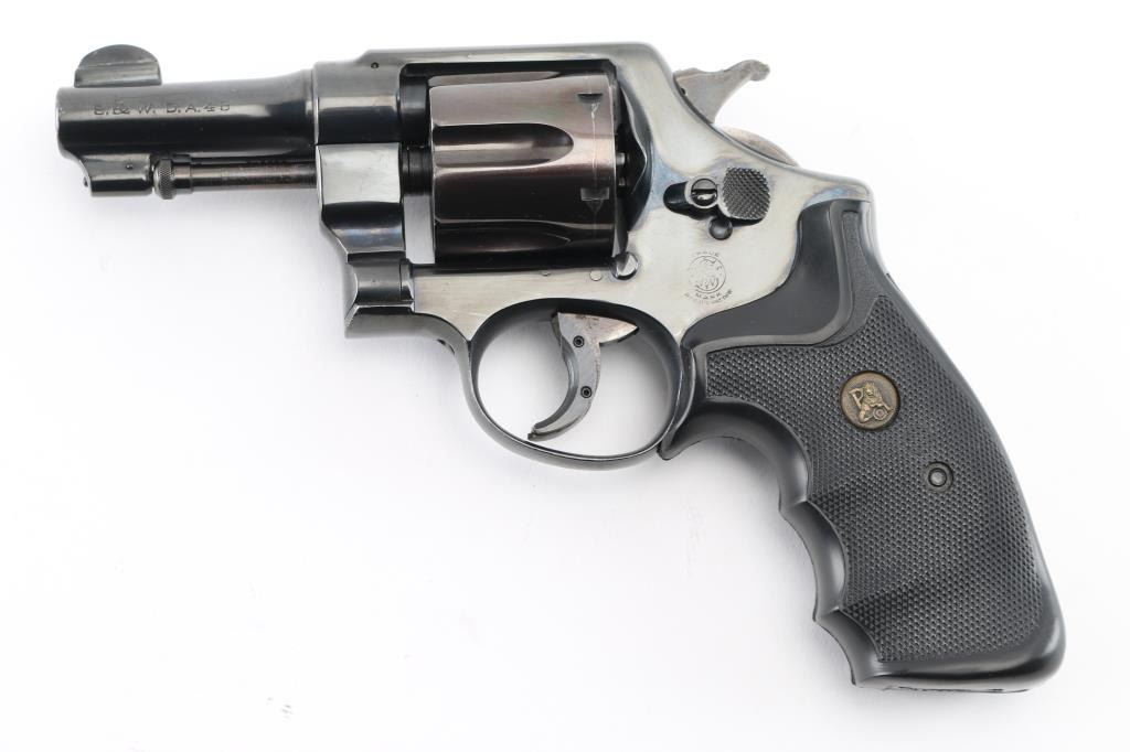 Revolver. S/A, D/A. 6rd capacity. .45 Hand Ejector. N Frame, square butt. Blued finish. 3 1/4" round, pinned barrel. Brazilian Contract. 25,000 Model 1917's were made for the Brazilian Government and stamped with the Brazilian crest on the sideplate dated 1937. Small S&W trademark is found on the frame's left side with "Made in the U.S.A. on the right. Patent dated on top of the barrel, and "S&W D.A. 45" on the barrels left side. . Checkered hammer spur, and checkered black rubber finger grooved Pachmayr grips.. A number of these revolvers have made their way back to the U.S. (No visible import marks) Wide serrated trigger extension added. Revolver has been refinished, probably by Brazil. Bore and cylinders appear excellent/bright. Action is crisp/tight. Grips are very good. Reblued metal finish is about 95% with minor edge wear/scratches, light tracking on the cylinder, which is plum colored. Some light pitting on sides of grip straps only visible when grips removed. NRA Condition-Very Good/Refinished. C&R Firearm.