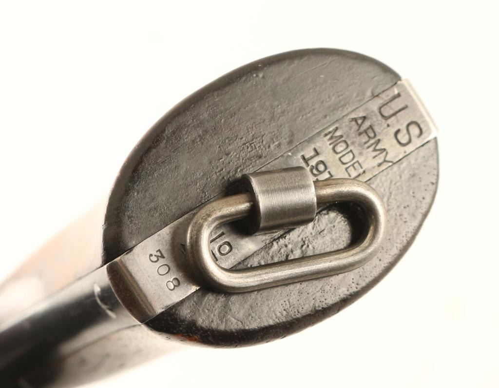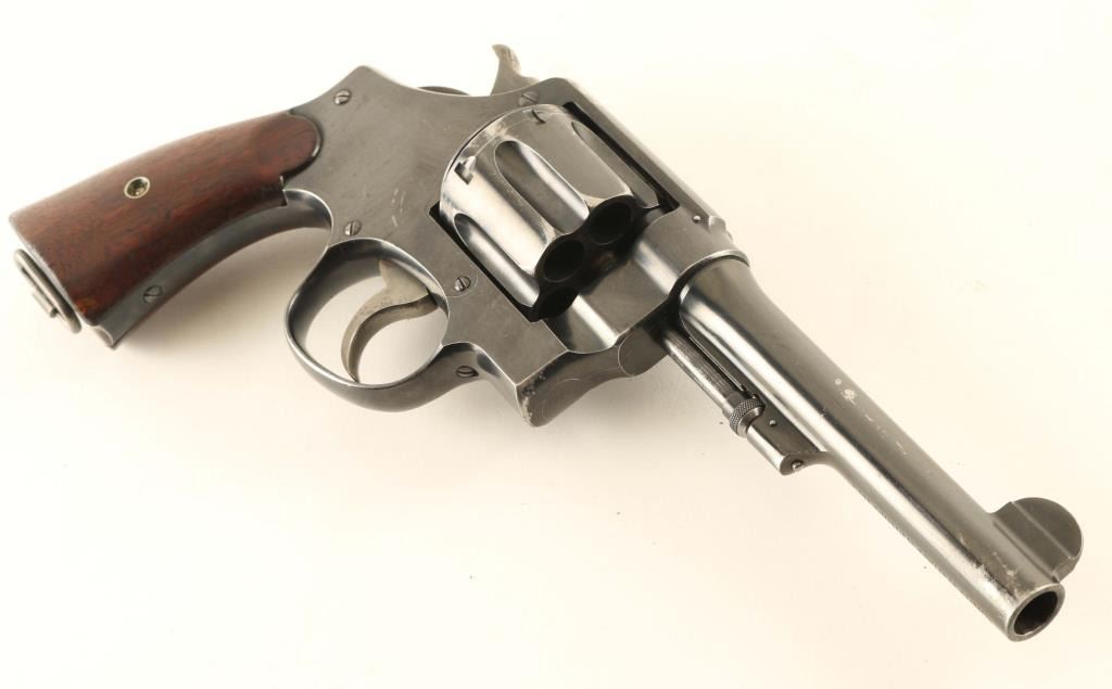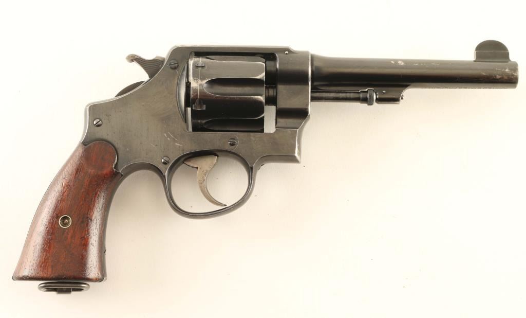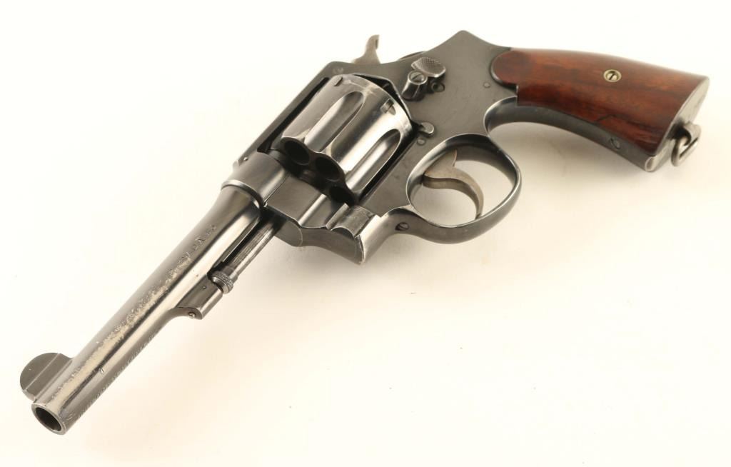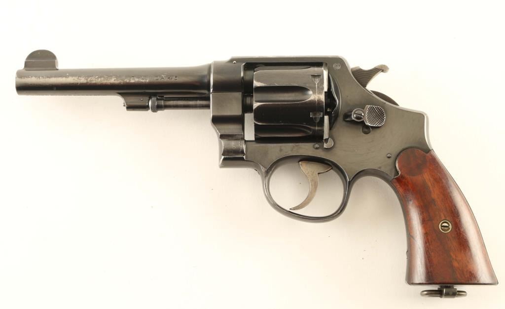 US military revolver features approx 5.5" barrel, fixed sights, six shot swing-out cylinder, single/double action, lanyard ring at butt. Intended for use with half or full moon clips. Bore is fair to good condition, mostly bright with strong rifling, a band of light pitting near muzzle. Cylinder charge holes appear smooth and bright. Retains 70% blued finish with bare metal on ridges and high spots, holster wear at muzzle, bluing loss at top strap where patina was removed. Case color on hammer & trigger an even medium brownish gray. Hammer has visible machine marks forming tiny curved ridges. Grips are very good condition smooth walnut. Markings include "UNITED STATES PROPERTY" under barrel, "US ARMY MODEL 1917" on grip bottom, "GHS" in circle on frame left. No Smith & Wesson logo on frame. Serial numbers on cylinder & barrel match frame. Condition is NRA Good *** C&R Firearm ***