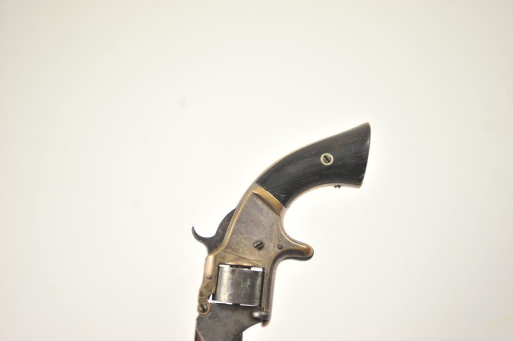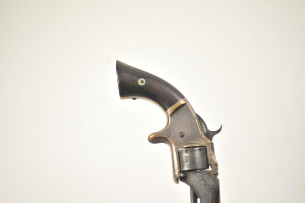 Smith & Wesson 1st model 2nd issue 7 shot revolver in .22 caliber, S/N 72569. The frame spring is missing. Fair to good overall. Minor pitting and good address. (Antique) Est.: $150-$300