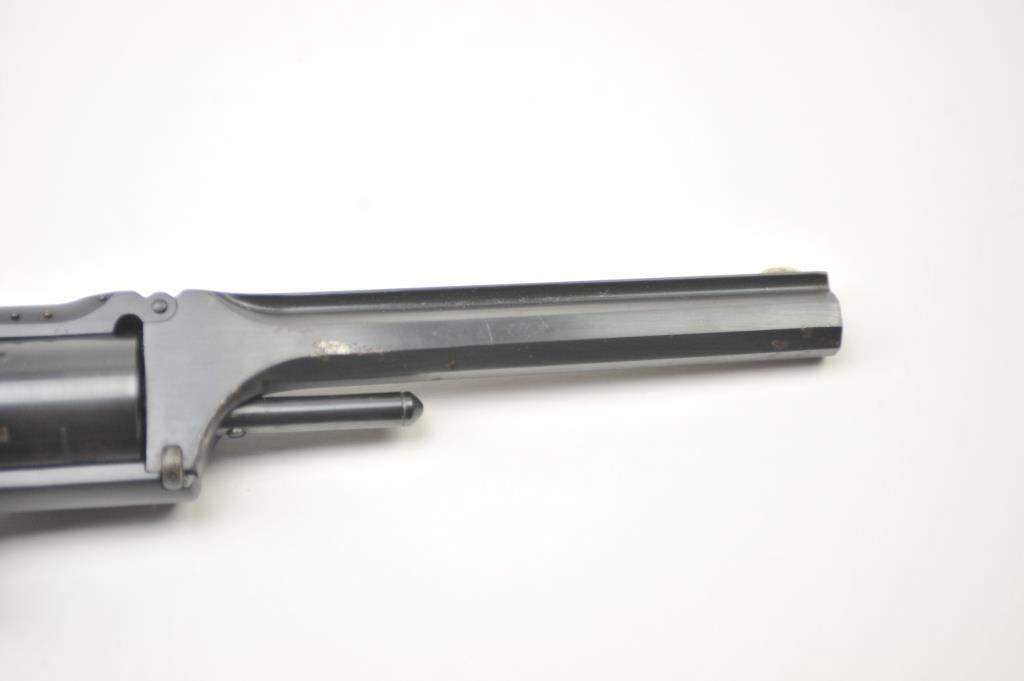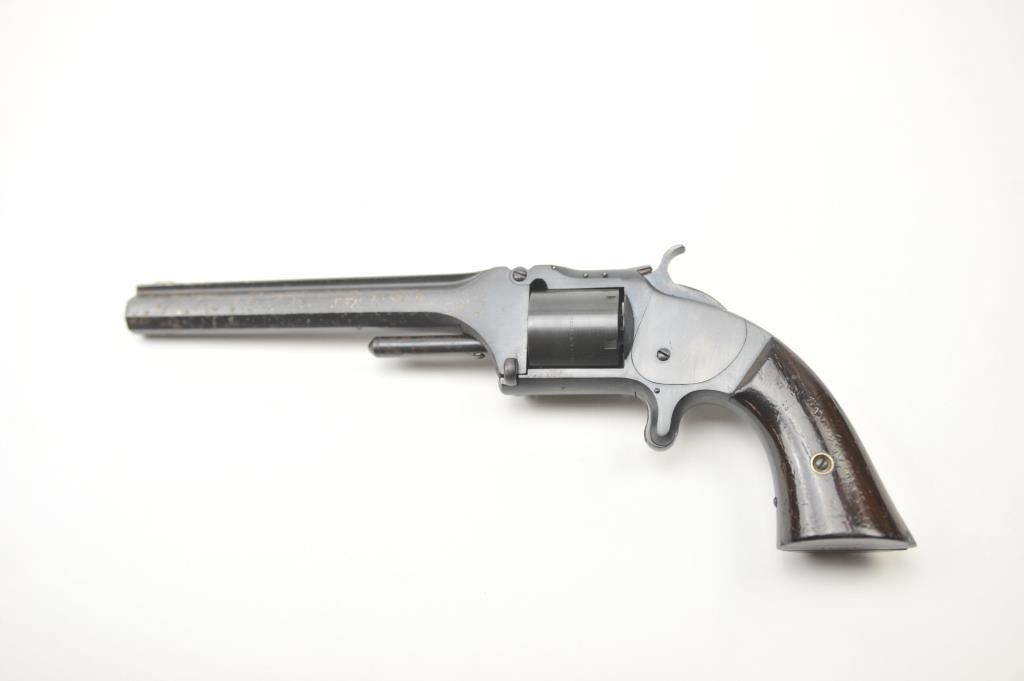 Smith & Wesson #2 Army .32 caliber rimfire revolver, Serial #68384. This pistol shows an old re-finish of which 75-85% remains, good markings, and good edges. The grips have also been re-finished with small lossesat the left heel. The patent dates on the cylinder are good, the action is tight and works well. There is some minor pitting and mottling to the finish on the left side probably from a holster. Est.: $300-$600.(Antique).