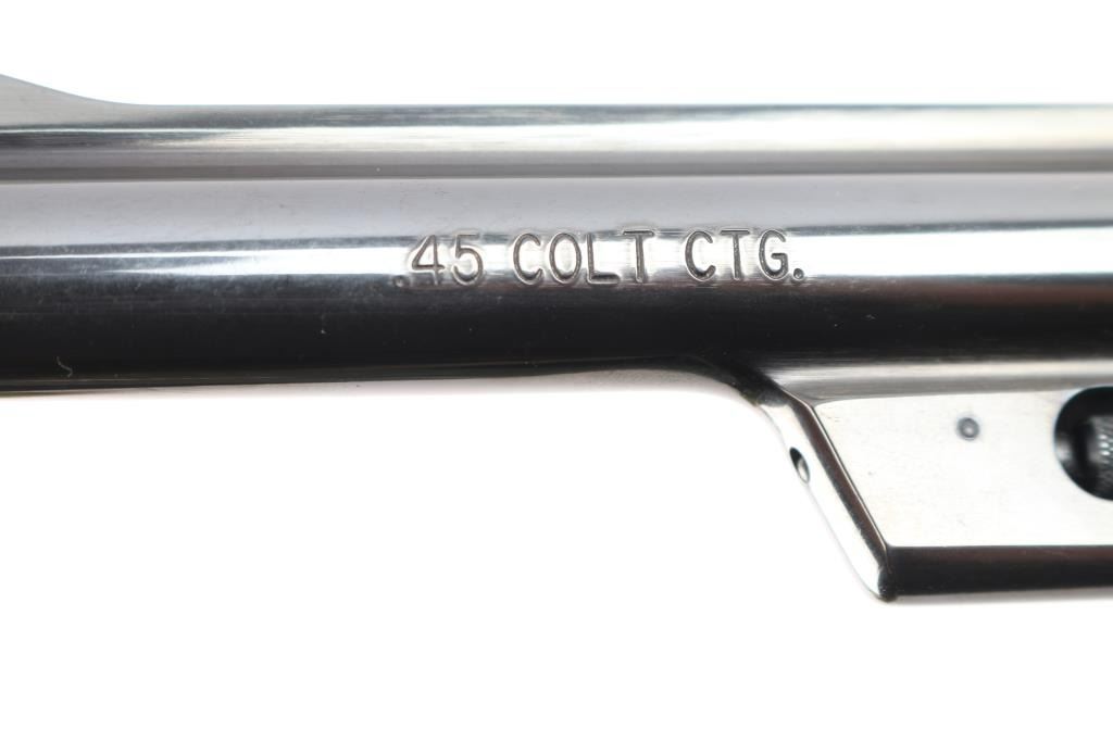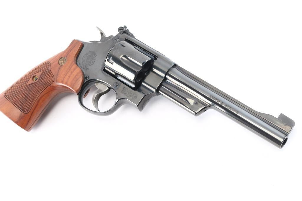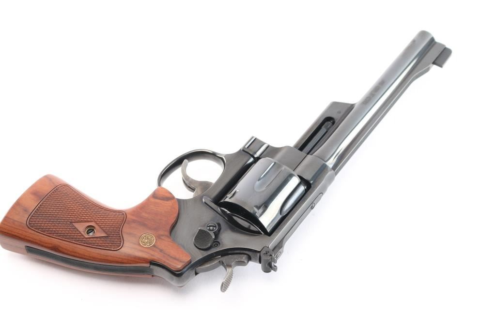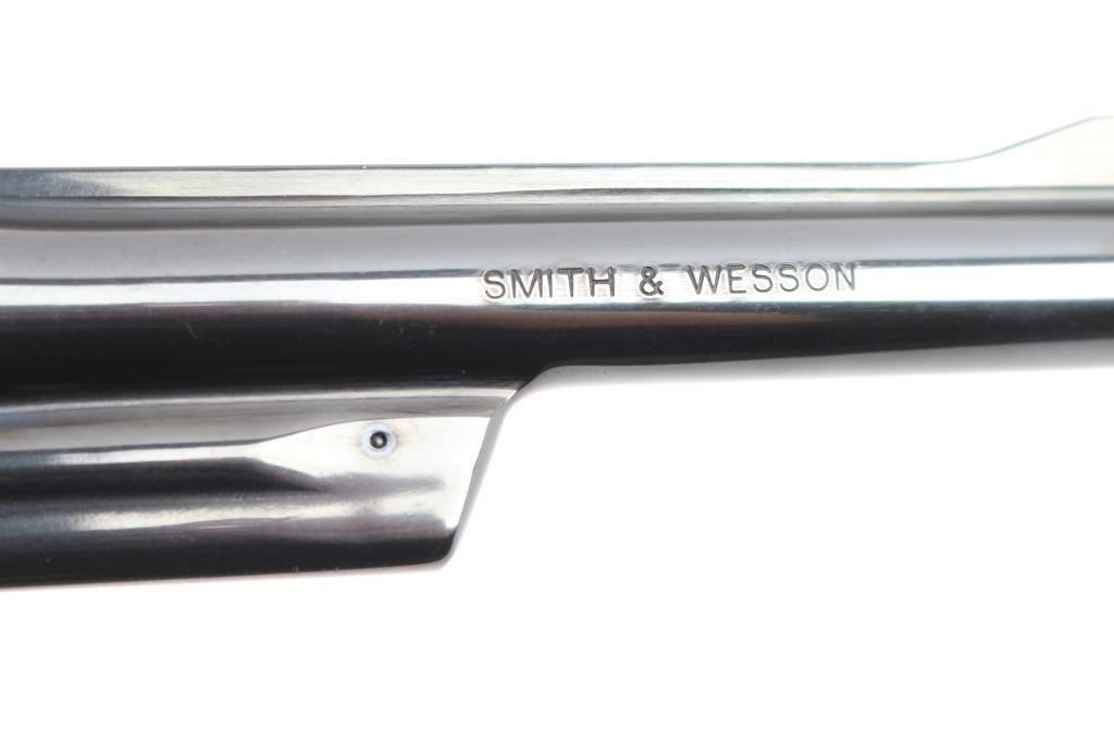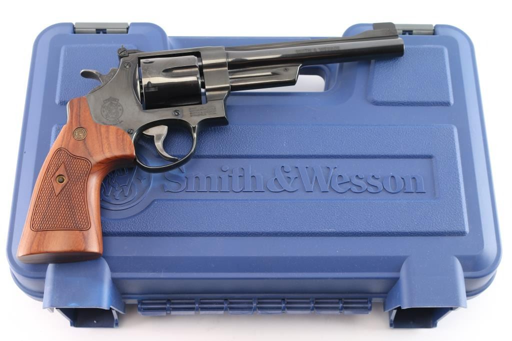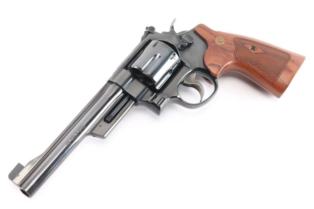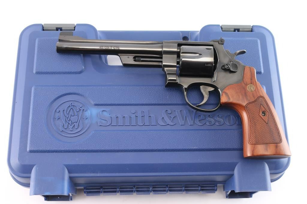 The 1955 Model .45 Target Heavy Barrel Large frame double action six shot revolver chambered in .45 LC. Manufactured circa 1995. Features a blued finish, 6 " heavy barrel with serrated wide sighting rib, raised ramp pinned blade, adjustable square notch rear sight with white outline, fluted six-shot cylinder, shrouded ejector rod, case colored serrated .500" target trigger and .500" checkered target hammer, three screw square butt N target frame and 10 groove front and back straps, checkered walnut target grips with S&W medallions. Bore is excellent/bright. Retains approximately 99% finish, slight drag line on cylinder. Action is smooth with tight lockup, grips are excellent. Includes S&W blue plastic hard case with matching label, cable lock, manual and internal lock keys. Revolver is like new.