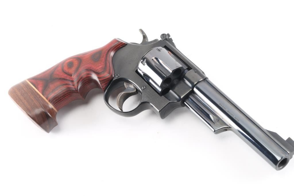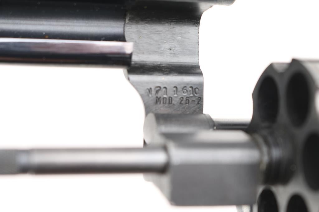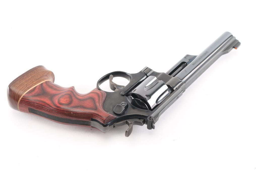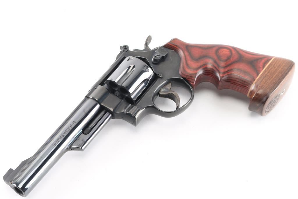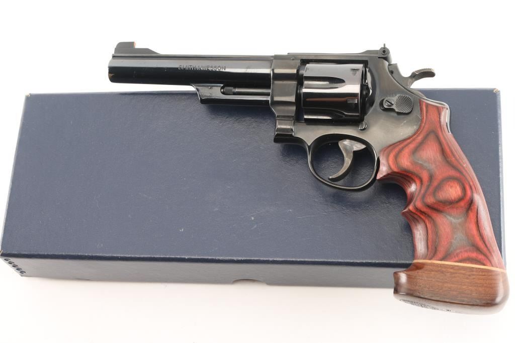 The 1955 model .45 Target Heavy Barrel Large frame double action revolver chambered in .45 Automatic, circa 1961. Features a blued finish, pinned 6 1/2" heavy barrel with serrated wide sighting rib, raised ramp Patridge front sight with red painted dot, micrometer click white box rear sight, fluted six-shot cylinder, shrouded ejector rod, case colored serrated .500" wide target trigger and .500" wide checkered target hammer, three screw square butt N target frame and a smooth finger groove rosewood/walnut HOGUE Mono Big Butt Revolver Grip with ICORE stamp on bottom. Revolver exhibits approximately 98% of its original finish with rust and faint drag line on cylinder, minor scratches on frame. Action is smooth with tight lock-up, the bore is pristine and the wood grip is excellent. Includes the original shipping carton with factory cardboard box with cleaning tools, moon clips, manual and presentation case. NRA Condition is good+.***C&R Firearm***