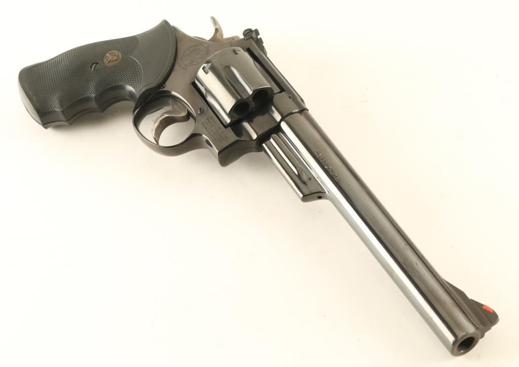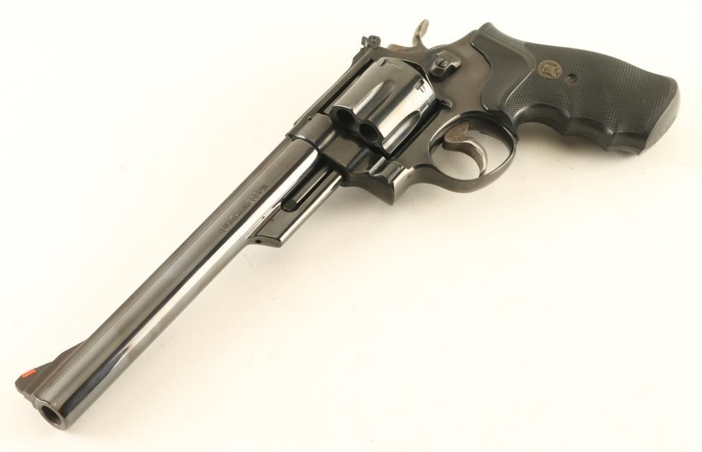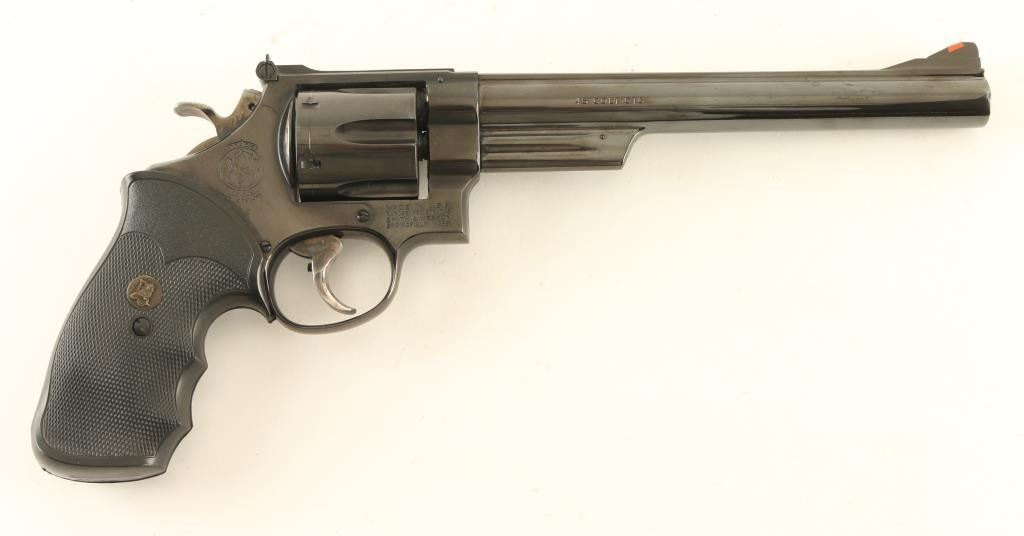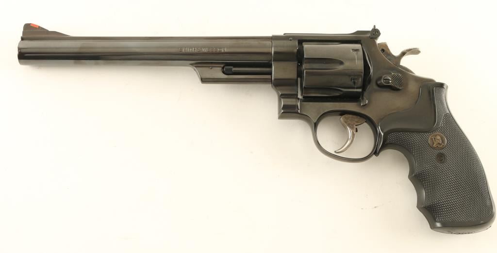 'The 1955 Model .45 Target Heavy Barrel' double/single action revolver manufactured circa 1980 to 1983. Features blued finish, Pachmayr Gripper rubber finger groove grips, 8-3/8" pinned barrel, adjustable sights (orange ramp front, white outline rear), case colored grooved wide trigger, case colored checkered wide spur hammer. Bore and charge holes are very good condition. Retains 95% blue with bare metal showing at edges of muzzle & cylinder drag line. Grips are excellent condition. Action is smooth, lock-up is good. Condition is NRA Very Good ++ *** Modern Firearm ***