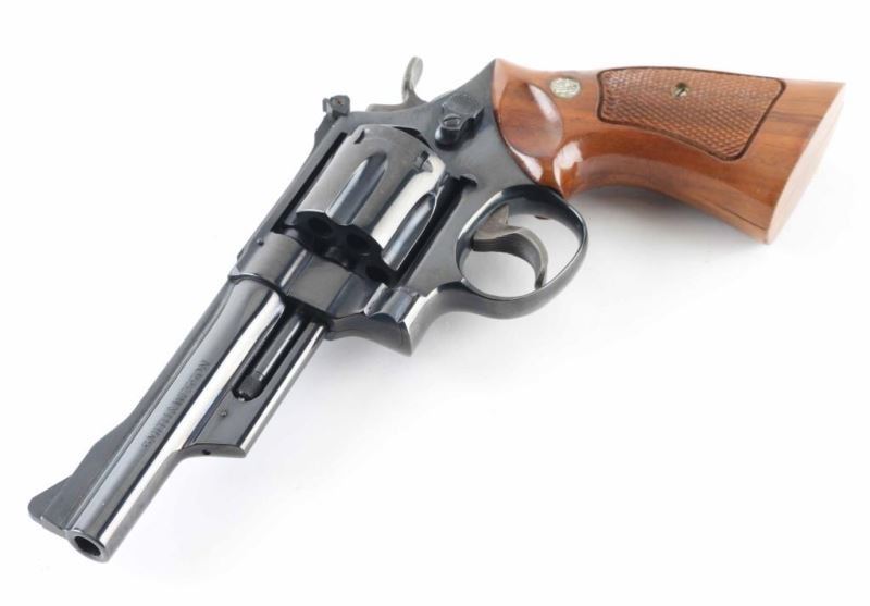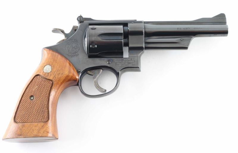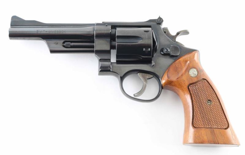 Revolver. Double/Single-Action. 6-rd capacity. The original .357 introduced in 1935. Model 27-2 1961-Cylinder stop changed, eliminate triggerguard screw. Wide hammer spur. 5" ribbed, pinned barrel with front blade, and micro click rear sights. Wide hammer spur. Serrated backstrap, top strap, and fore strap. Blued finish. Checkered walnut Magna grips with S&W Medallions. Serrated wide trigger. Action is crisp/tight. Cylinders/bore are excellent. Blued finish is 98%, with some tracking on the cylinder, and a couple of very minor scratches. Grips are excellent. NRA Condition-Excellent. Modern Firearm.