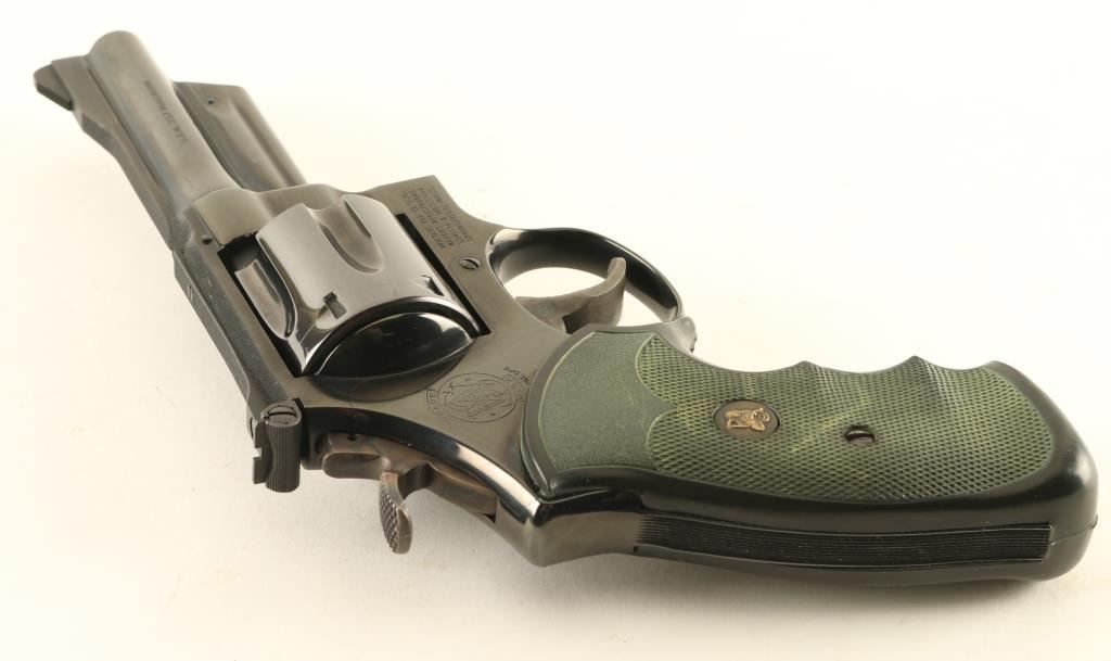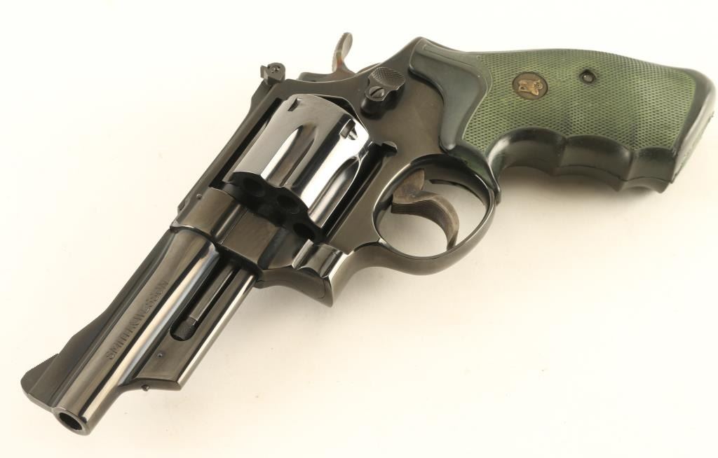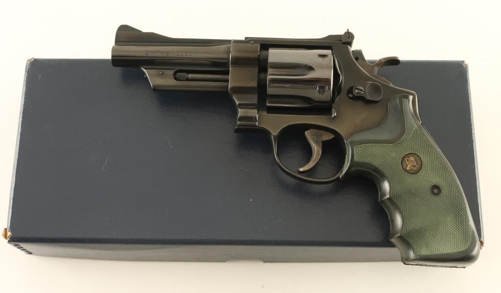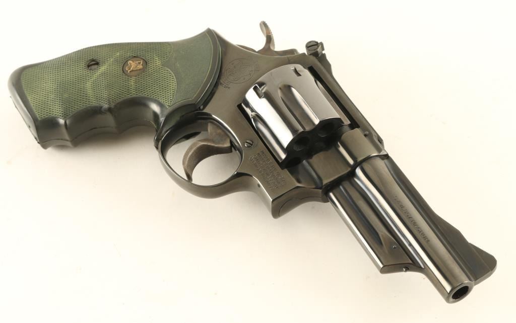 "Pinned & Recessed" double/single action revolver features blued finish, black/green camo rubber contoured Pachmayr Gripper grips, 4" barrel, black ramp front sight, plain black adjustable rear sight, wide grooved trigger, wide checkered spur hammer. Bore is excellent, cylinder charge holes appear smooth. Retains 95% blue with thin drag line on cylinder. Action is smooth with tight lock-up. Rear sight is incorrect length unit - functional but extends past the top strap contour. Includes factory papers and a plain blue cardboard box. Condition is NRA Excellent *** Modern Firearm ***