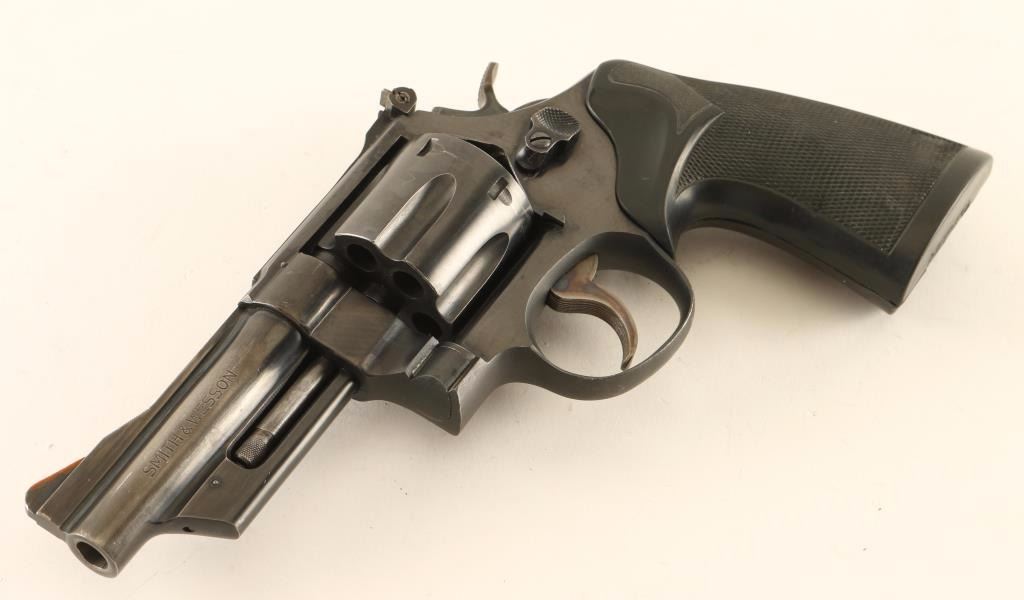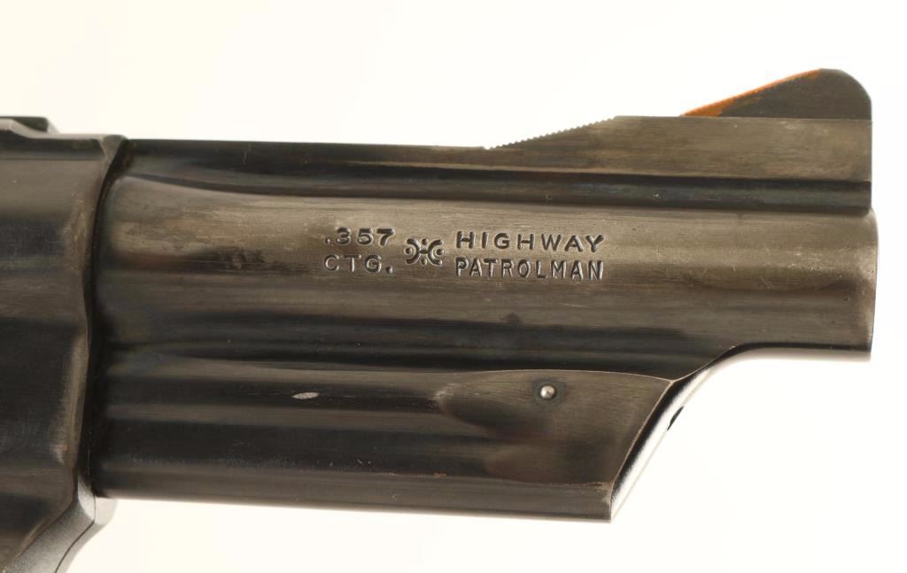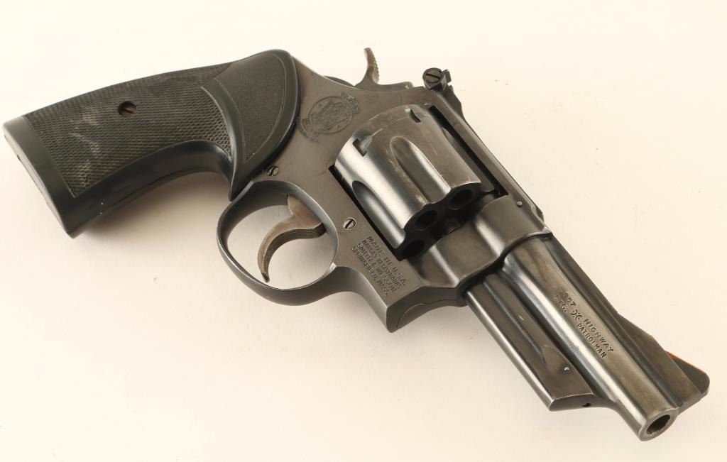 'Highway Patrolman' Large frame double-action revolver chambered in .357 Magnum, circa 1961-1986. Features a blued finish, pinned 4" barrel with smooth rib, shrouded ejector rod, raised ramp front sight which has been painted orange, adjustable micrometer click rear sight, fluted six-shot cylinder with recessed chambers, .265" serrated trigger, .400" semi-target hammer, and Pachmayr Presentation two-piece checkered black rubber grips. Revolver exhibits approximately 70% of it's original finish showing heavy holster wear, a drag line on the cylinder, and a small spot of light surface rust on the top of the backstrap. Action is smooth with good lock-up, bore is fair with light pin prick pitting throughout, and rubber grips are very good. Condition is good. ***Modern Firearm***