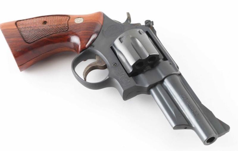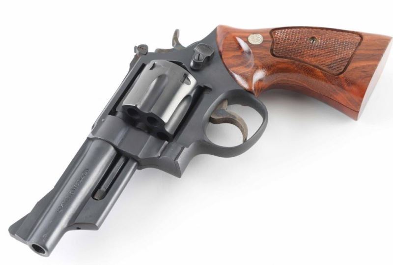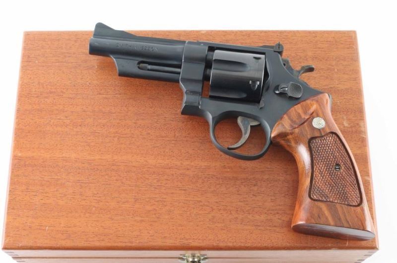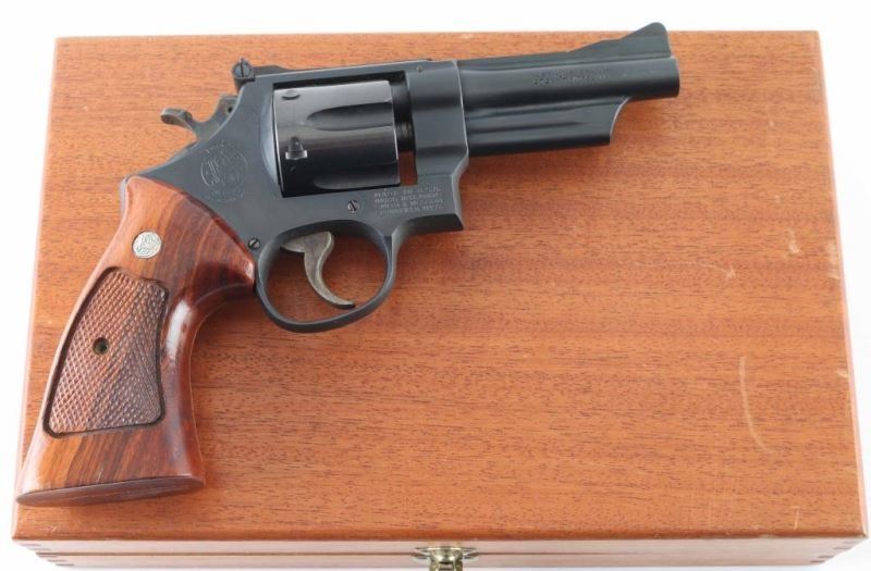 'The Highway Patrolman' double/single action revolver with pinned barrel & recessed cylinder for cartridge rims. Features service grade blued finish, checkered wood target grips with S&W medallions, 4" barrel, adjustable sights, case colored grooved narrow trigger, case colored checkered medium width spur hammer. Bore and charge holes are very good condition. Retains 95% blue with handling marks. Grips are very good condition. Action is smooth, lock-up is good. Includes hinged lid wood case with blue velvet lined plastic fitted inserts, with cleaning tools. Condition is NRA Excellent *** Modern Firearm ***