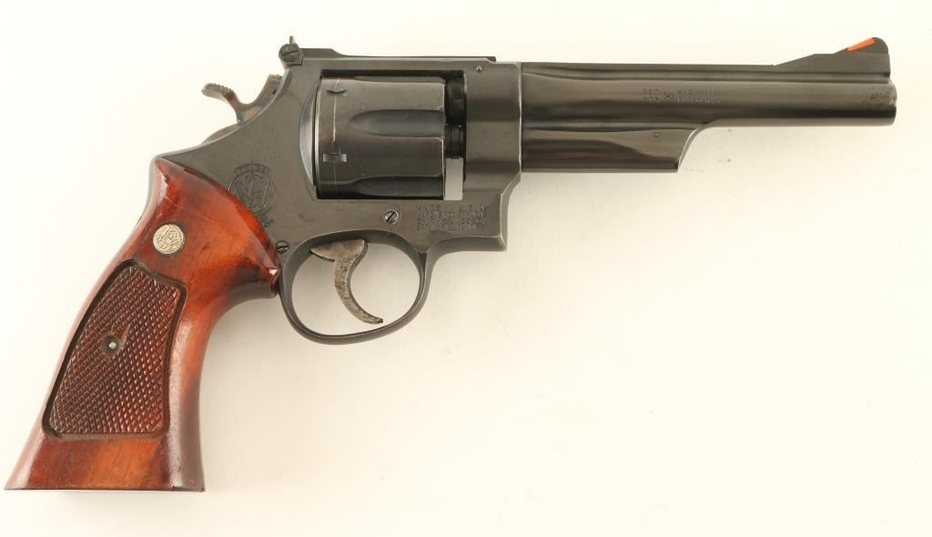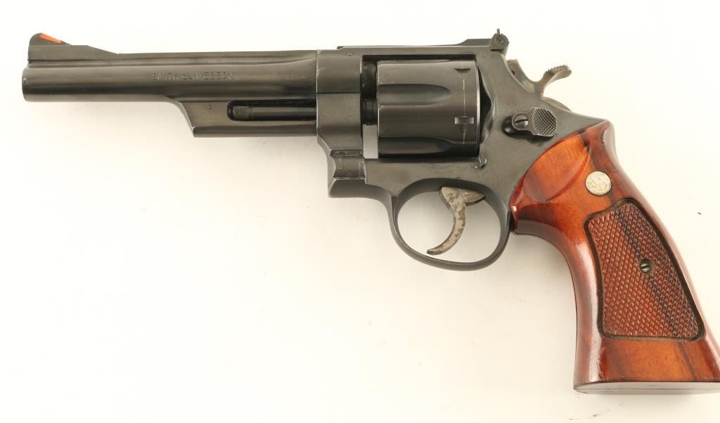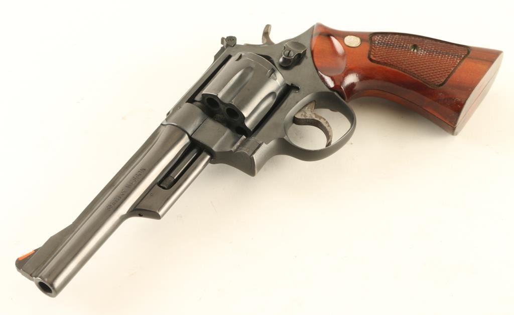 'The Highway Patrolman' double/single action revolver manufactured circa 1970. Pinned barrel & recessed cylinder for cartridge rims. Features service grade blued finish, checkered wood target style grips with S&W medallions, 6" barrel, adjustable sights (orange ramp front, white outline rear), case colored grooved narrow trigger, case colored checkered medium width spur hammer. Bore and charge holes are very good condition. Retains 90% blue with bare metal showing at edges of muzzle & cylinder drag line, small spots of patina in a few places. Small dent observed on topstrap. Grips are very good to excellent condition. Action is smooth, lock-up is good. Condition is NRA Very Good + *** Modern Firearm ***
