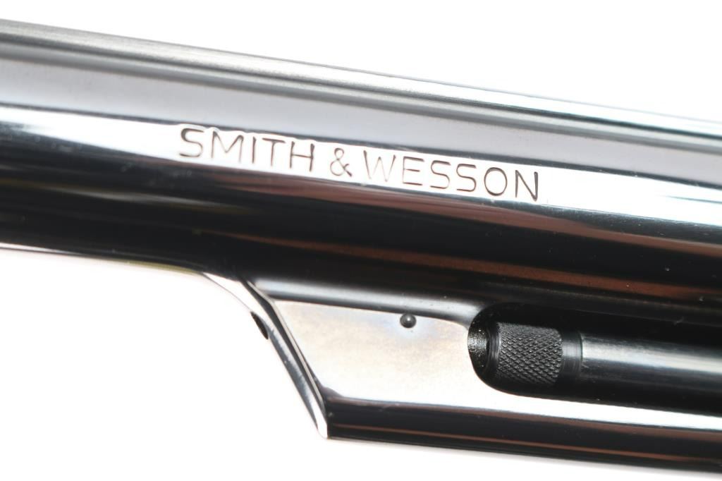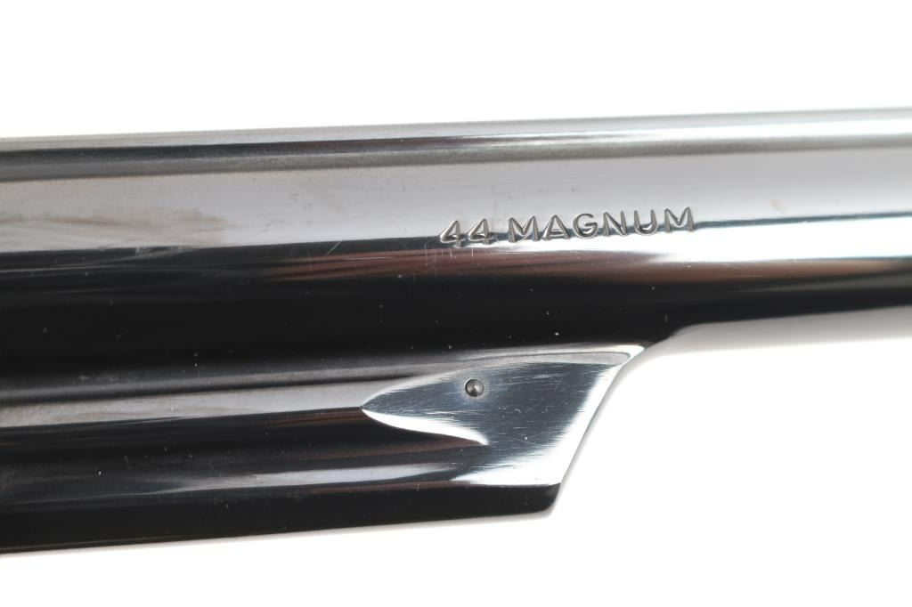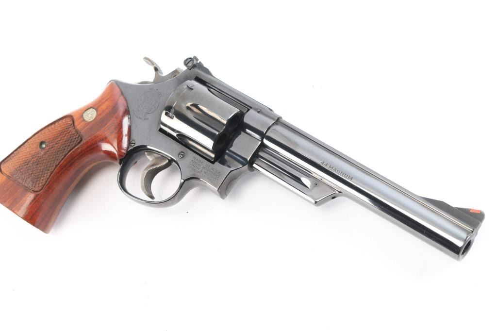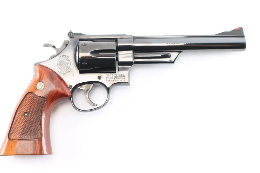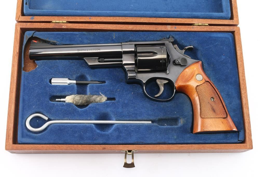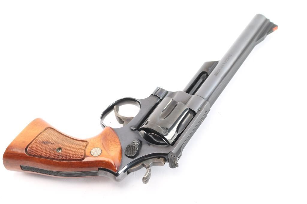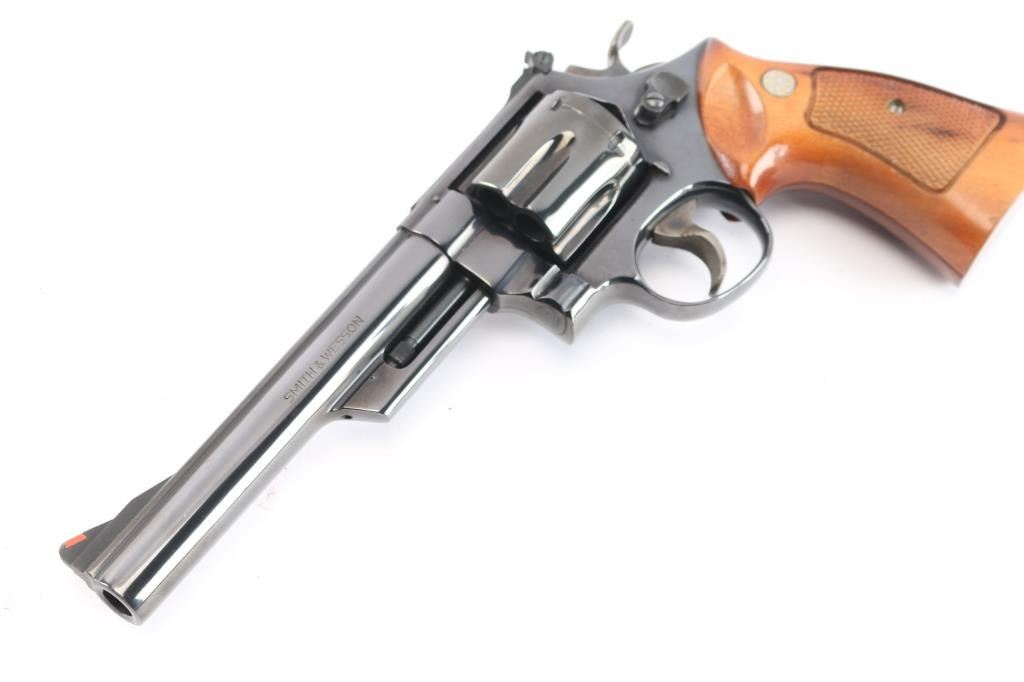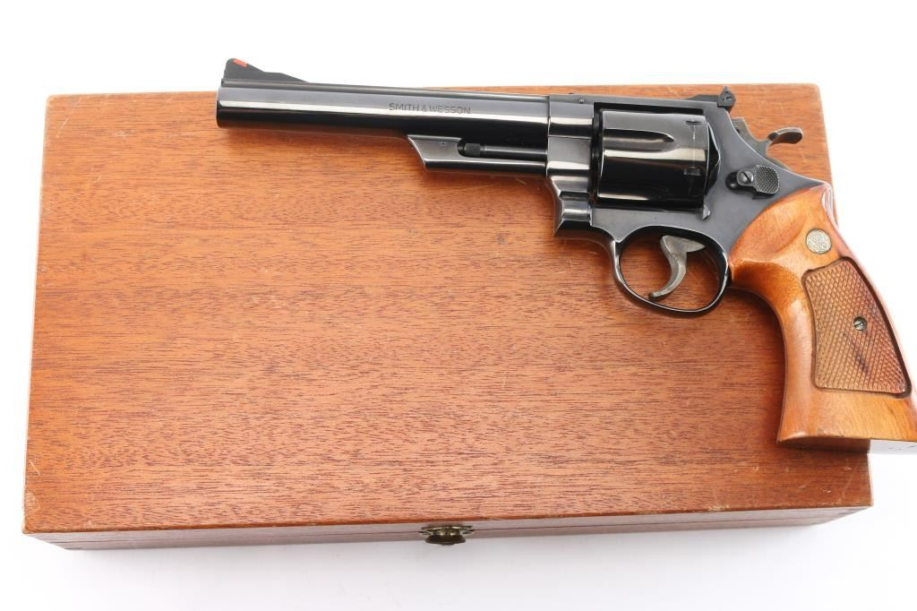 This is the model that Clint Eastwood's iconic character used in the Dirty Harry films. The Smith & Wesson Model 29-2 chambered in .44 Magnum, famous for its powerful reputation and making the gun a legend in pop culture, especially after the famous monologue in the first film. Double/Single-Action 6-shot revolver chambered for .44 Magnum cartridges. Manufactured 1977-78. Built on a N Target Frame with a Square Butt. It has a wide knurled hammer spur with a 6 1/2" ribbed, pinned barrel with ramped blade front sight with red insert and white outline micro click rear sights. Serrated backstrap. Blued finish. Checkered smooth wood grip panels with S&W medallions. Serrated wide trigger. Trigger and hammer are color case hardened. Retains approx. 98% finish with some small scuffs and drag line on the cylinder, wood grips are excellent with some small scratched on the bottom. Bore is excellent/bright, action is smooth with tight lock-up. Comes with wooden case with blue felt interior, cleaning gear and manual. Felt in case is poor with scratches on wood. Condition is NRA Excellent. ***Modern firearm***.