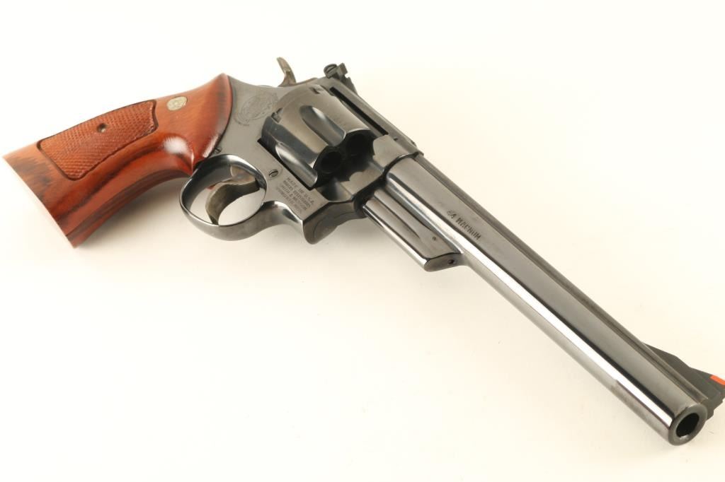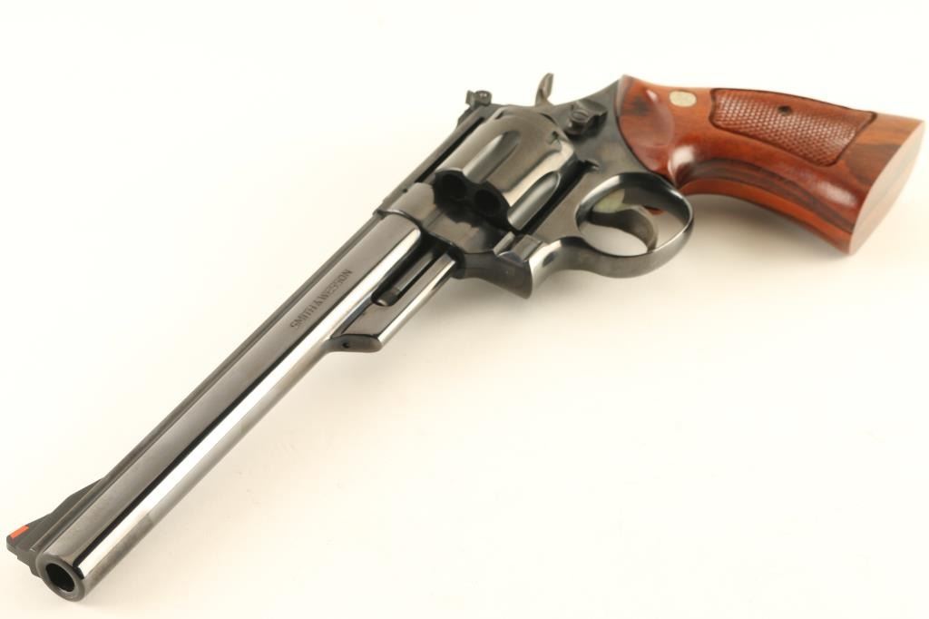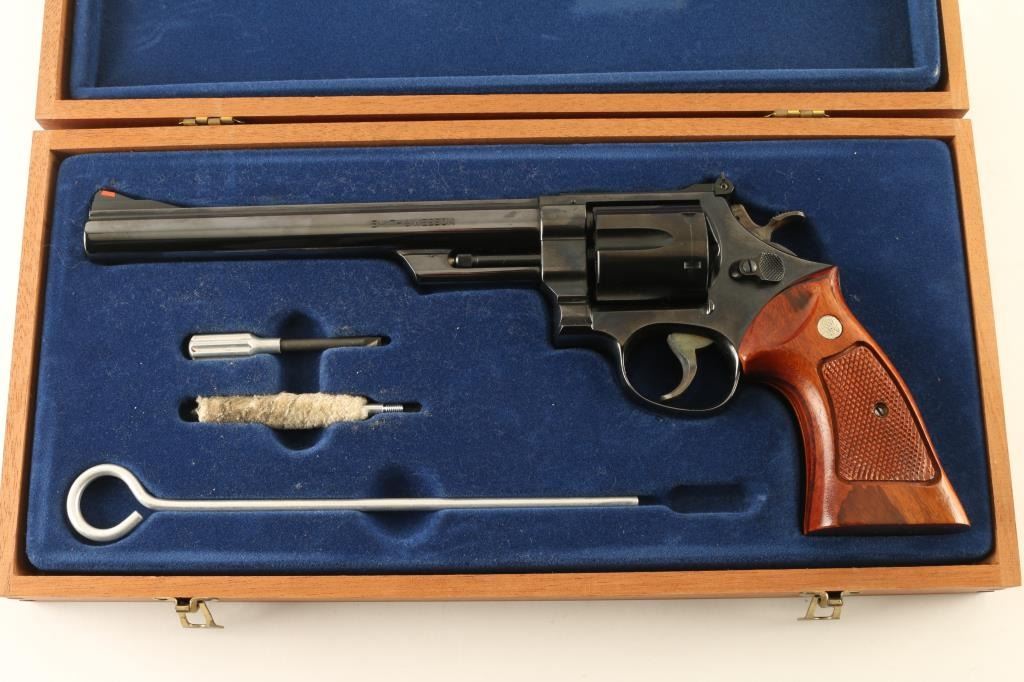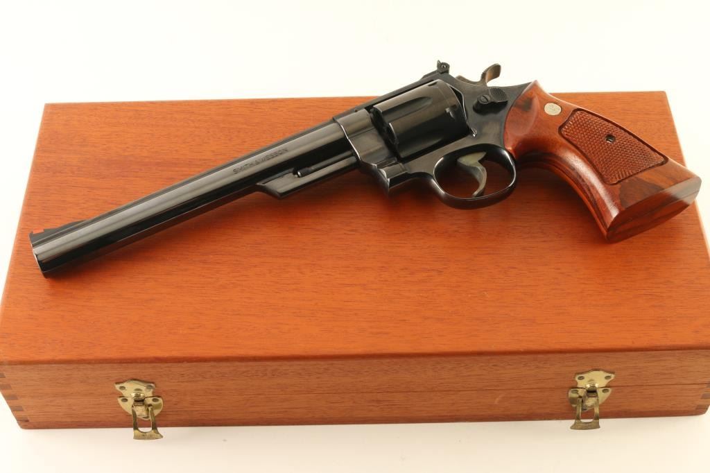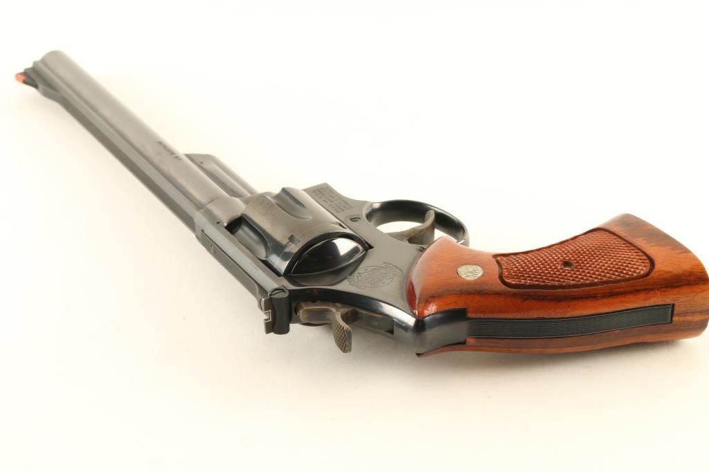 Large frame double/single action revolver features blued finish, checkered wood target grips with S&W medallions, 8-3/8" pinned barrel, adjustable sights (red ramp front, white outline rear), grooved wide target trigger, wide checkered spur target hammer. Bore and cylinder charge holes are very good to excellent condition. Retains 98% blue, with cylinder drag line, minor handling marks. Grips are excellent. Action is smooth with good lock-up. Includes wood storage box with hinged lid, plastic inset with shape of revolver,cleaning items. Box is very good condition with exception of one hinge missing it's pin, allowing hinge halves to separate. Condition is NRA Excellent *** Modern Firearm ***