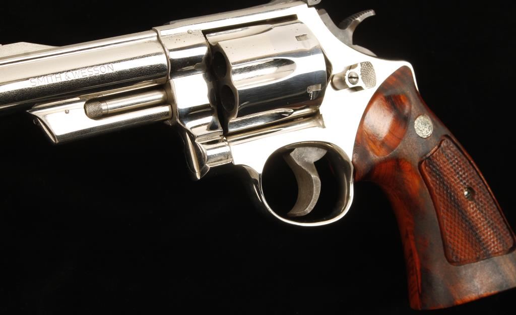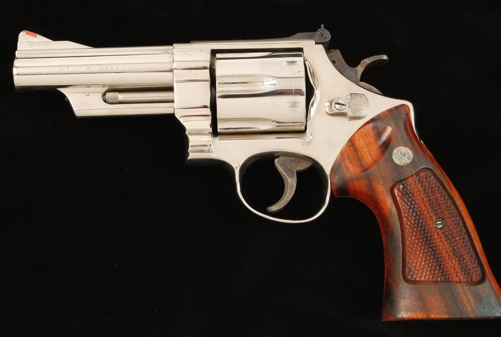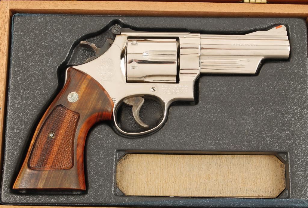 Nickel plated 6-shot double-action revolver with a 4" barrel, adjustable rear sight, target hammer, target trigger, wood grips with checkered panels and a wood display box. Pinned barrel and recessed chambers. Metal finish has a drag line, matte topstrap with serrated ribs, case colored hammer and trigger, freckling on the left side of the frame and one area of the cylinder. and grainy effect on the left side of the barrel. Bore is shiny with sharp rifling. Chambers are dirty but shiny. Wood grips are dark and need cleaning but with no marks. Action is flawless and lock-up is very tight. Condition is good to very good. *Modern Firearm*