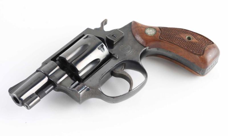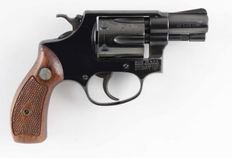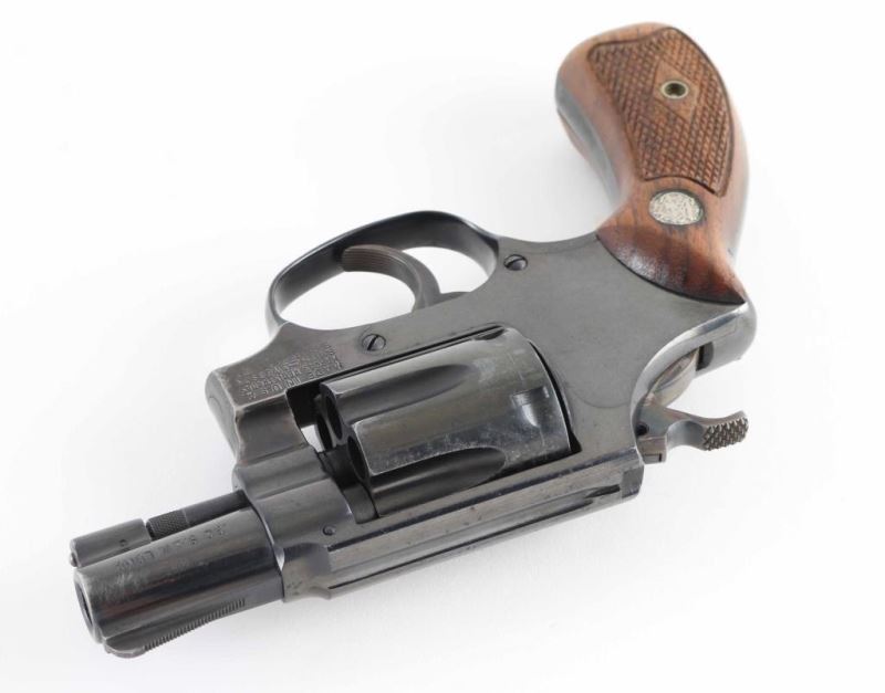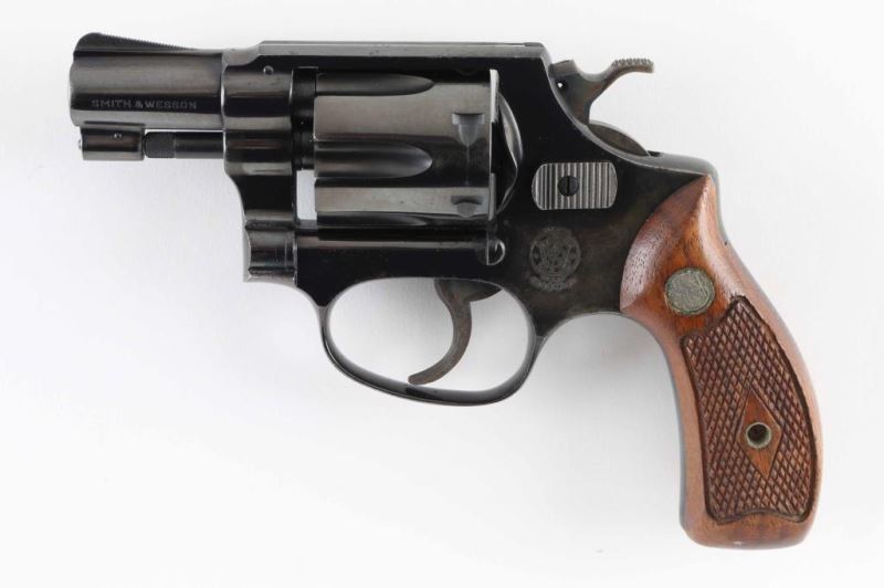 Vintage all machined construction small frame double action snub nose revolver. Features a blued finish, 1-7/8" pinned barrel with serrated ramp front sight, square notch rear sight, non-shrouded ejector rod, fluted six shot cylinder, serrated trigger, service hammer with knurled spur, three screw round butt J frame and two-piece checkered walnut Magna grips with silver S&W medallions. Bore and charge holes are very good. Retains 80% blue with partial finish loss to sides of frame & back strap, thinning or bare metal on edges. Grips are good condition with dings & dents. Action is smooth with good lock-up. Condition is NRA Very Good+ *** C&R Firearm ***