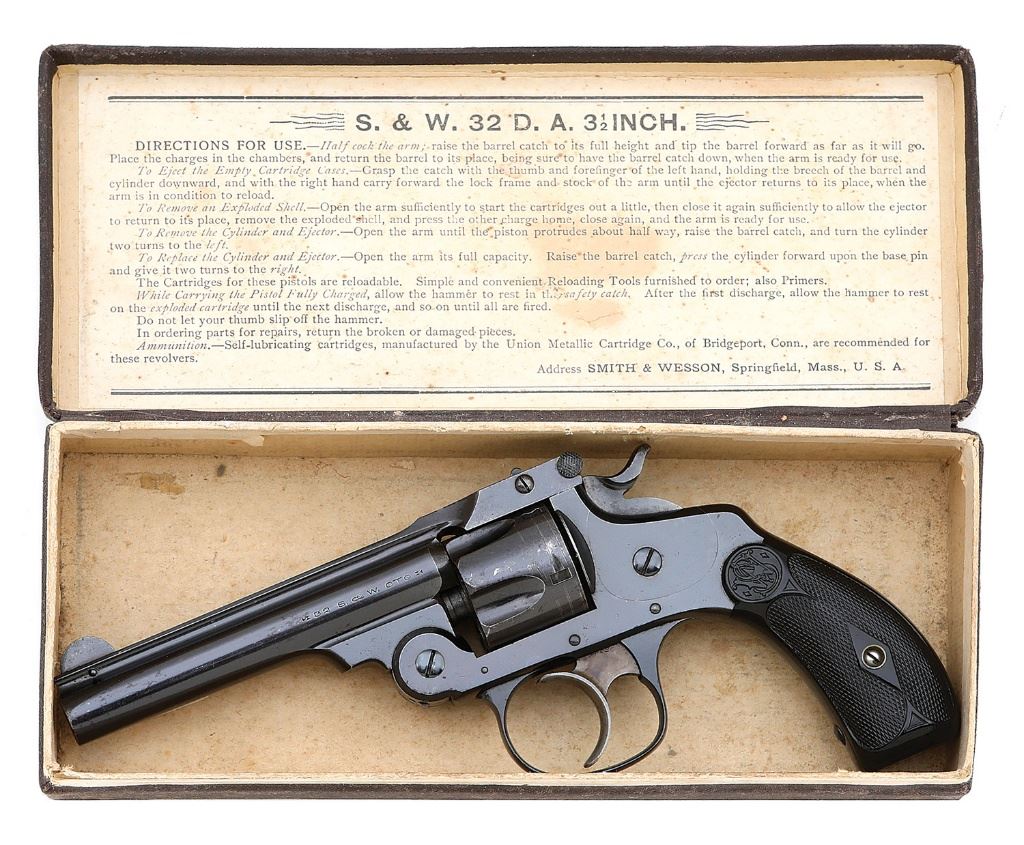 serial #242243, 32 S&W, 3 1/2" barrel with a bright excellent bore. The metal surfaces retain 97% original blue, showing only minimal handling wear throughout with light oxidation staining faintly visible in the areas of loss focused chiefly on the cylinder, with the hammer and trigger toning to a gunmetal patina and showing handsome muted case-hardened colors. The checkered hard rubber grips rate excellent showing little if any handling wear. Timing and lockup appear sound and ejector function remains robust. Included is the original hinged box, correctly end-labeled to the gun, remaining excellent overall showing only light soiling with minimal edge or corner wear. A lovely 32 DA with plenty of condition left. (26A10826-656) {C&R} [Dr. W. Lloyd Hudson Jr. Collection] (700/900)