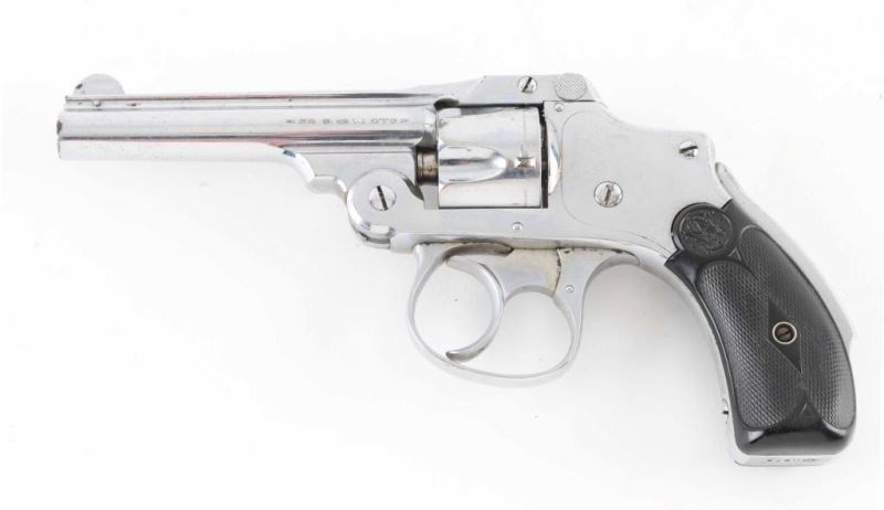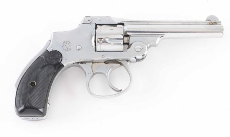 Sn 130978 Revolver. Double-Action. 5-rd Capacity. 2rd Model ,circa 1902-1909. "The Lemon Squeezer". Break-Top. #' ribbed barrel with pinned front blade. Rear sight is a notched portion of the barrel latch. Grip safety. Round butt. All markings are crisp/clear. Action is smooth tight. Bore and cylinders appears good, with good rifling. There is some slight pitting is the bore. Serial # matches the cylinder. Barrel locks up tight. Checkered hard rubber grips with S&W Monograms are very Good. Nickel finish is about 90% with edge wear/Scratches. NRA Condition-Very Good. C&R Firearm.