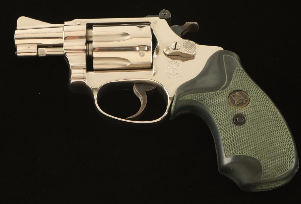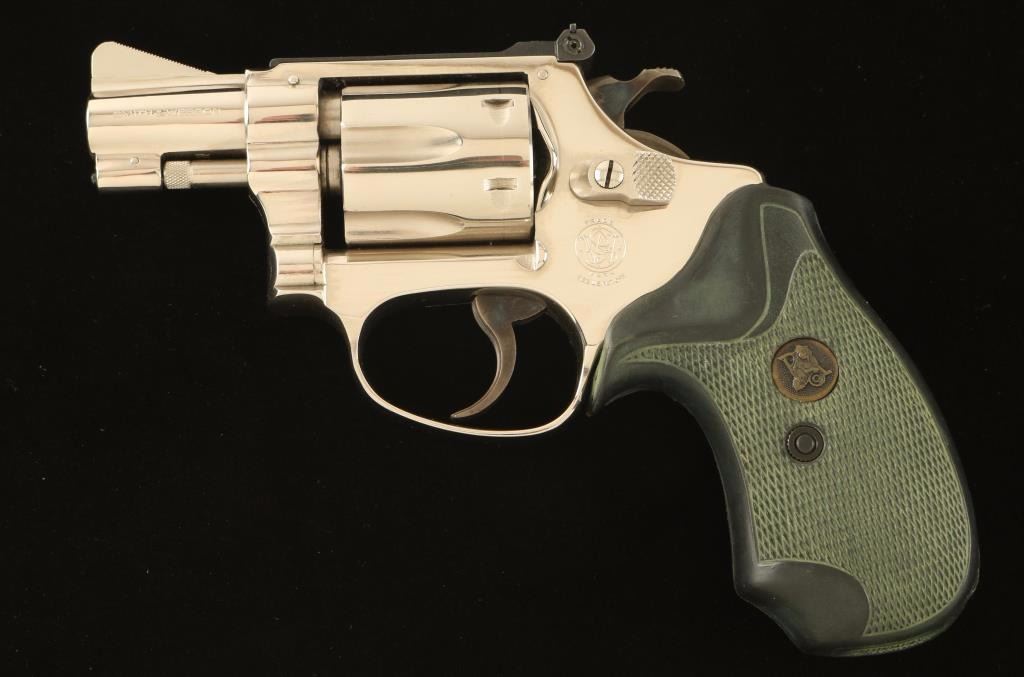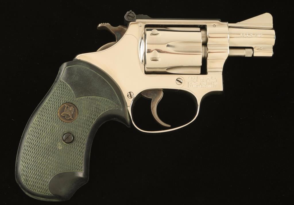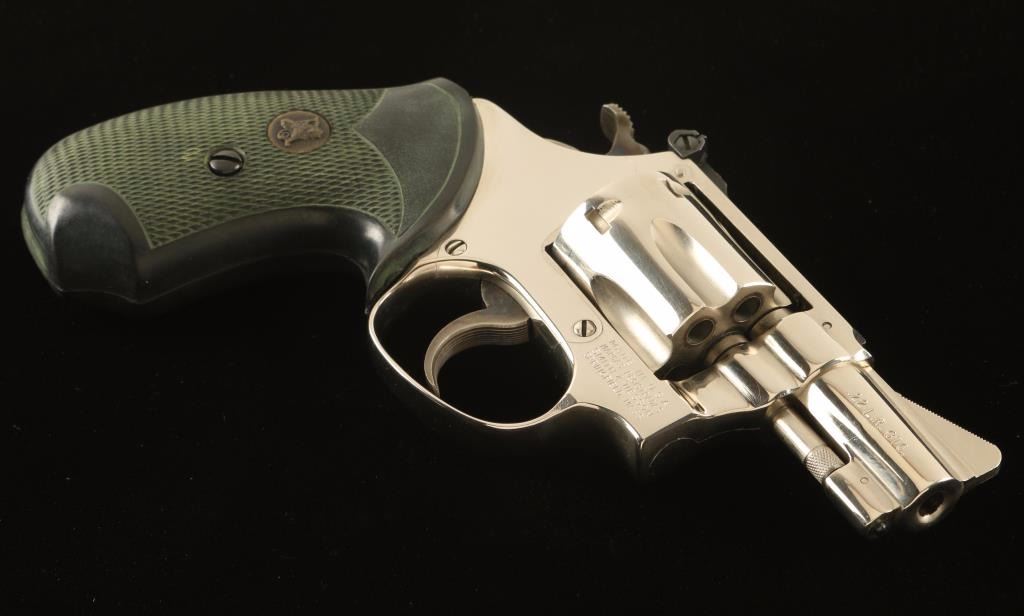 'Model of 1953 Kit Gun' Small frame snub-nosed double action revolver chambered in .22 Long Rifle, circa 1969-1982. Features a nickel plated finish, pinned 2" barrel with narrow rib, non-shrouded ejector rod, ramp front sight, micrometer click adjustable rear window sight, fluted six-shot cylinder with recessed chambers, .240" serrated trigger, .375" semi-target hammer, round-butt J frame and one-piece Pachmayr Presentation checkered black rubber wrap-around grips. Revolver exhibits approximately 99% of it's original nickel plated finish which shows a bright drag line on the cylinder and fine superficial scratches throughout. Action is smooth with tight lock-up, bore is pristine and rubber grips are very good. Condition is very good+++. ***Modern Firearm***