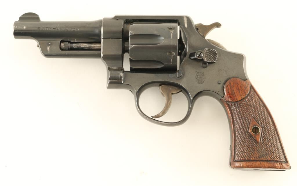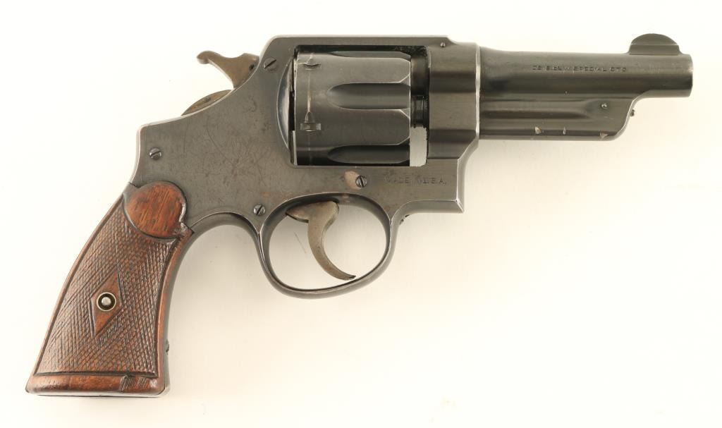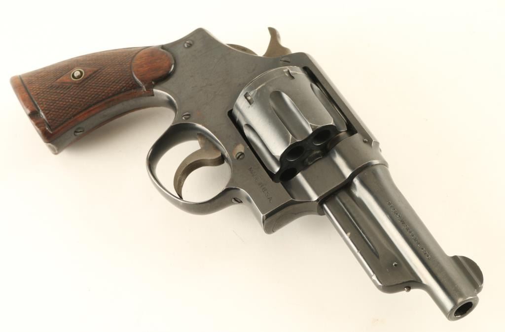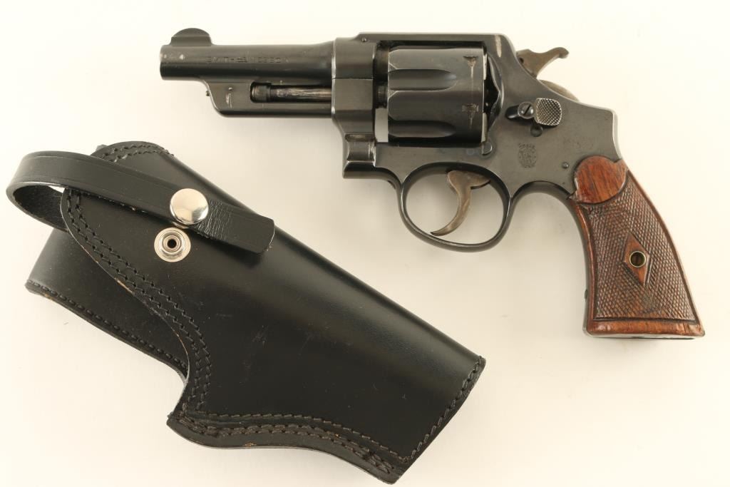 Large frame double/single action revolver features blued finish, checkered wood grips, 4" barrel, fixed sights. Bore appears very good to excellent, very slight bulge visible from outside just forward of frame that is not clearly visible in the bore. Retains 80% blue with heavy cylinder drag line, bare metal at sharp edges, many small scratches. Grips are older style, no medallions, in good condition with gouges near butt. Butt shows empty lanyard ring hole, with ring assembly missing. Action is smooth and lock-up is good. Includes very good condition black leather duty style holster marked "American Sales & Mfg Co". Condition is NRA Very Good *** C&R Firearm ***