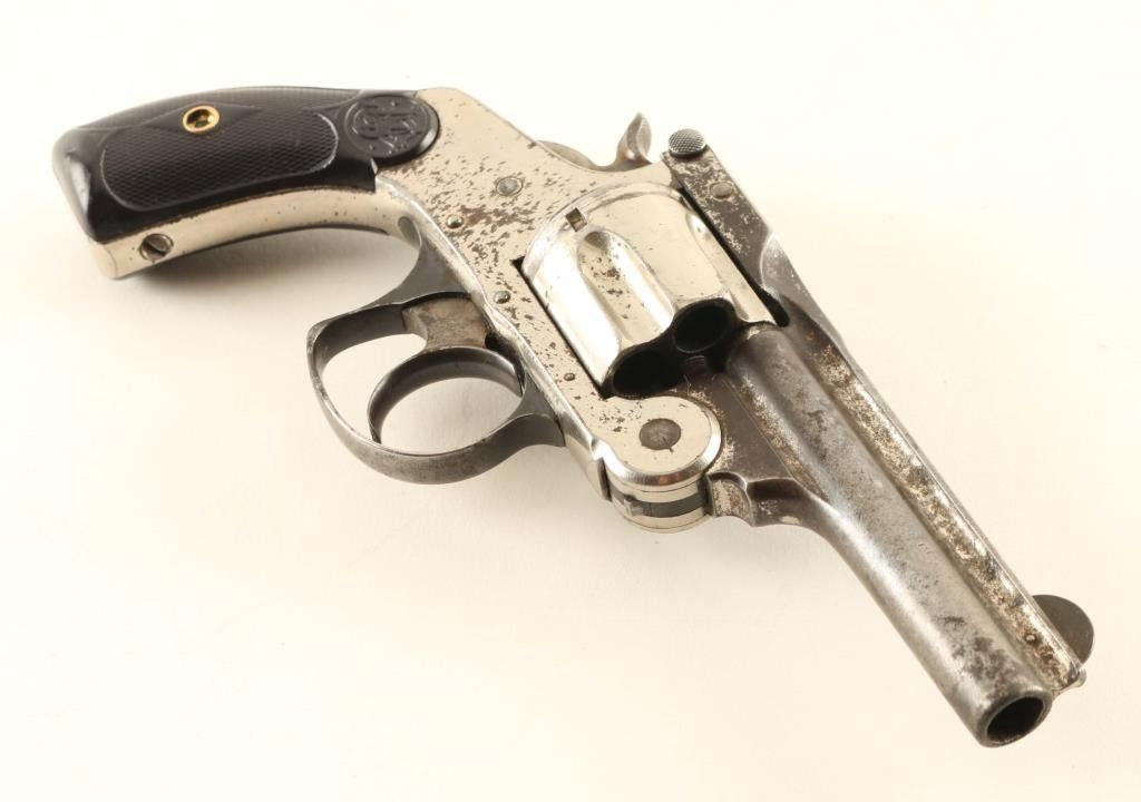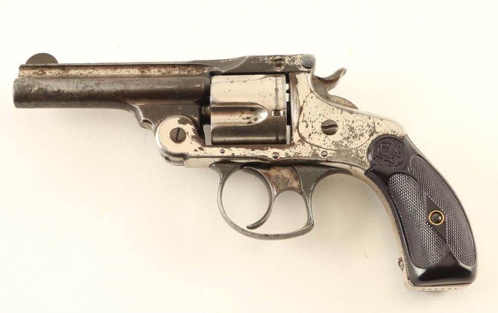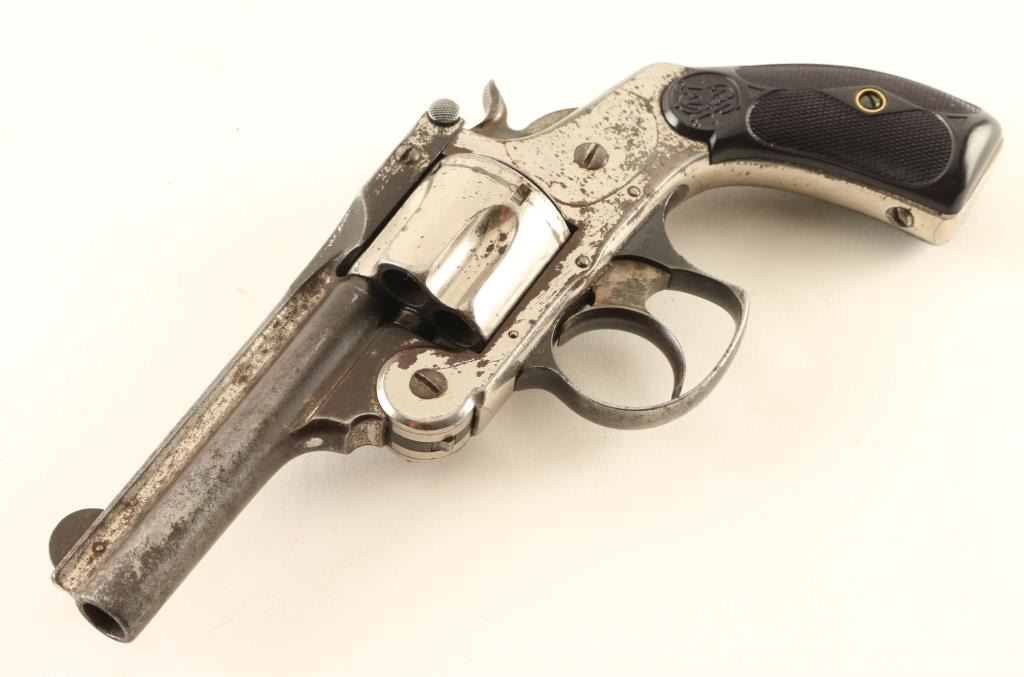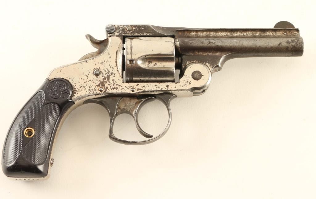 SN: 129578 Antique double action top-break revolver chambered in .38 Smith & Wesson, manufactured in Springfield, MA circa 1884-1895. Features a nickel plated finish, 3 1/4" ribbed barrel, pinned round blade front sight, 'v' notch rear sight cut into the top of the "T" shaped barrel latch, fluted five-shot cylinder, automatic extractor, smooth case hardened crescent trigger, blued recurve trigger guard, case hardened hammer with knurled wide spur, round butt frame and diamond checkered black synthetic grips with molded S&W insignias. Matching serial numbers are found on the frame, barrel latch and cylinder. Revolver retains approximately 65% of its original finish showing heavy wear on the barrel and scattered losses throughout. The action is sound with good lock-up, the bore is fair, the markings are good and the synthetic grips are good with the left panel appearing to be a reproduction. Condition is NRA Very Good. ***Antique Firearm***