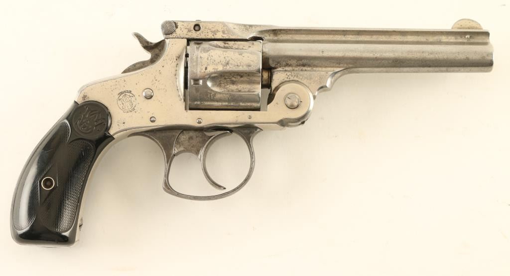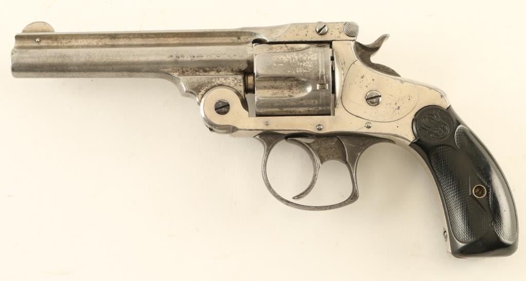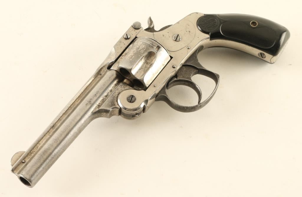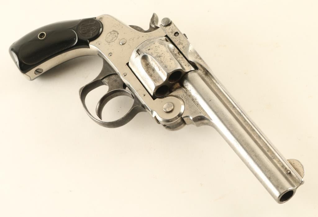 '4th Model' 1895-1909 break top double/single action revolver. Features nickel finish, checkered black gutta percha grips, 4" barrel, fixed sights. Bore is fair to good condition, slightly dark, some pitting or leading, strong rifling. Cylinder charge holes fair to good, smooth at rear with light pitting in forward section. Trigger & guard are blued, good condition. Hammer is dark colored, light pitting on sides. Nickeled surfaces show peeling & puckering, many small pits. Overall appearance is bright silver color with evidence of cleaning. Grips are very good. Double action operation is smooth with good lock-up. Single action operation has hammer interference with trigger. Condition is NRA Good *** C&R Firearm ***