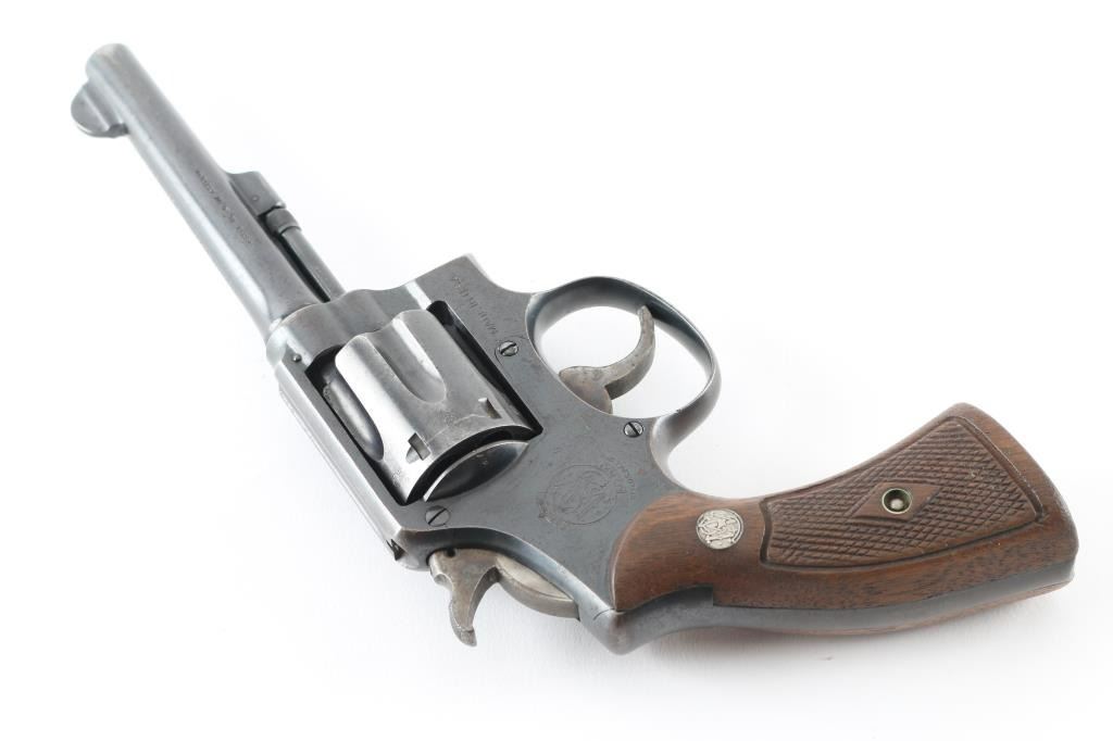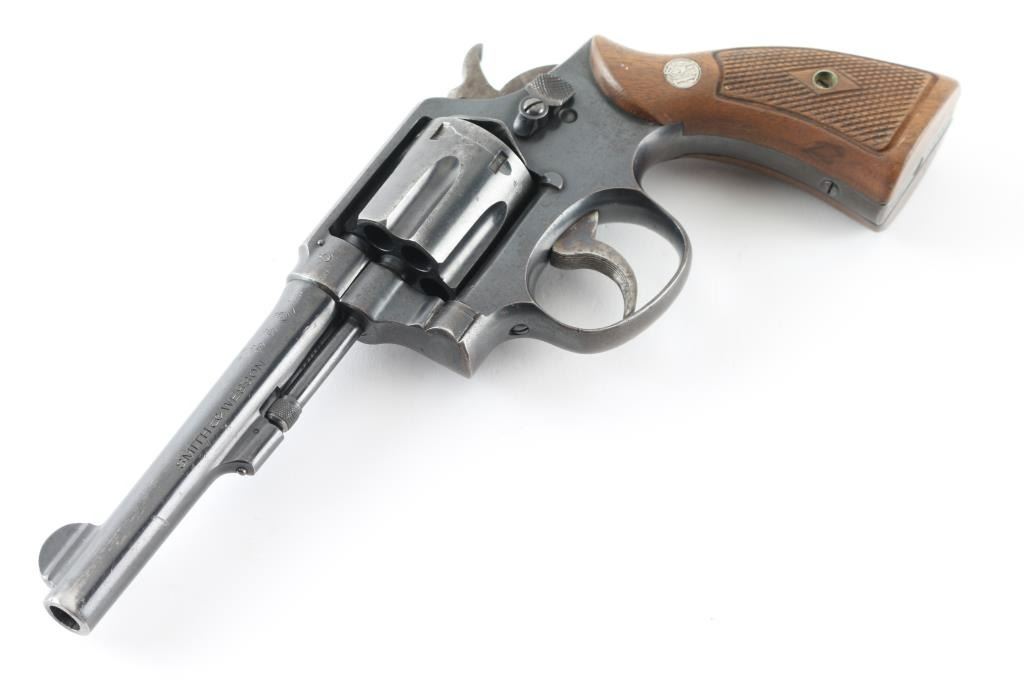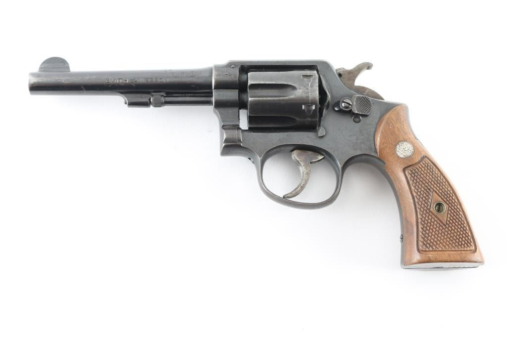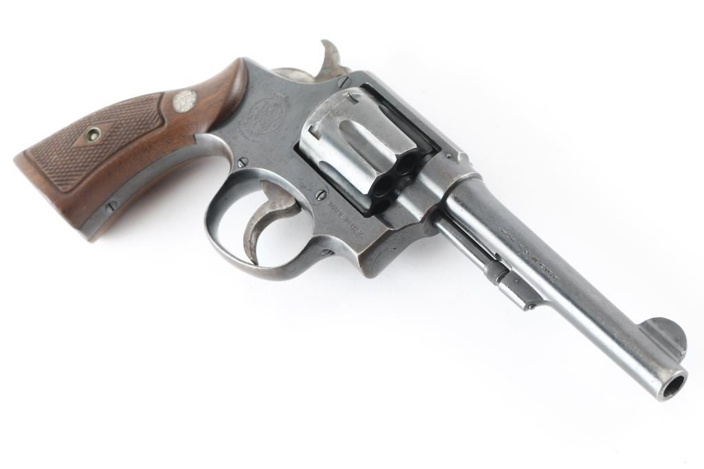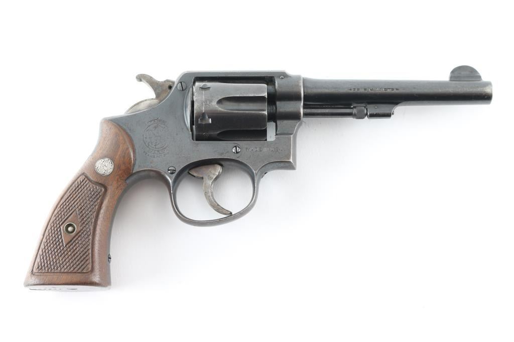 .38 Military & Police model of 1905, 4th change. Lend-Lease British marked WWII era medium frame double action service revolver chambered in .38 S&W. manufactured circa 1940-1945. No import marks observed. This revolver was provided by the United States government to the British Empire as aid under the Lend Lease program. Features a blued finish, pinned 5" barrel, forged round blade front sight, square notched rear sight, non-shrouded ejector rod, fluted six-shot cylinder, serrated case hardened trigger, case hardened hammer with knurled spur, five screw square butt K service frame with no lanyard ring, hole plugged, and two-piece checkered walnut grips, with S&W medallions. Matching serial number on heel, barrel, and cylinder. Standard markings with a number of British Department of Defense marks/proofs. Revolver retains approximately 80% of it's blued finish showing some high point edge wear, scattered handling marks/scuffs, tracking on the cylinder, and some finish loss on the straps, some very light pin-prick pitting on the frame. Action is crisp with very good lock-up, the bore is near excellent , Markings are clear and the wood grips are very good with minor blemishes. NRA Condition- Near Very Good. C&R Firearm