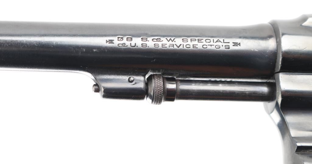 ‘Model of 1905’ Vintage medium frame double action revolver chambered in .38 Special, manufactured in Springfield, MA circa 1905-1906. Features a blued refinish, pinned 5" round tapered barrel, pinned blade front sight, square notched rear sight, fluted six-shot swing-out cylinder, non-shrouded ejector rod, smooth .265" trigger, .265" hammer with knurled spur, five screw round butt K service frame and later walnut Magna grips with silver S&W medallions. Matching serial numbers are observed on the frame, barrel, cylinder and extractor star. Revolver retains approximately 85% of its blued refinish showing moderate wear and a small amount of light surface rust. Action is smooth with good lock-up, the bore is excellent and the later wood grips are good with blemishes & small losses. Condition is NRA Good as refinished. ***Modern Firearm*** ***C&R Eligible***