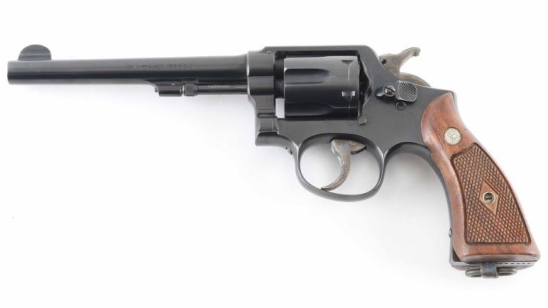 'Military & Police' Medium frame double action revolver. Features a blued finish, 6" barrel, forged half moon front sight, square notched rear sight, non-shrouded ejector rod, fluted six-shot cylinder, grooved .240" trigger, .240" hammer, five screw square butt K service frame with lanyard ring on butt, two-piece checkered walnut Magna grips with silver S&W medallions. Bore is very good condition. Revolver retains approximately 90% of it's original finish showing bare metal at muzzle and sharp edges, edges of cylinder flutes, scattered handling wear and a drag line on the cylinder. Action is smooth with good lock up. Grips are good to very good condition with nicks & scratches. Numbers on cylinder & barrel match frame. Condition is NRA Very Good++ *** C&R Firearm ***
