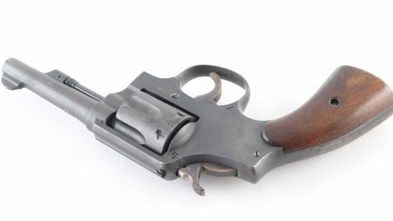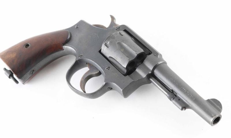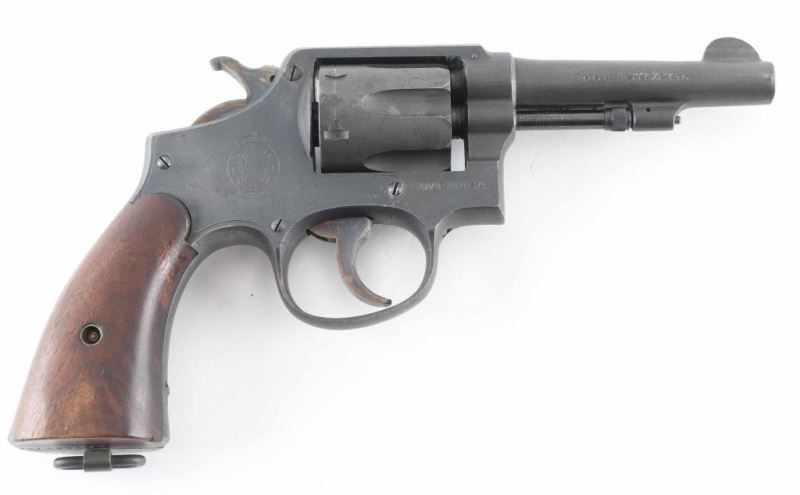 SN: V220798 'US NAVY' marked. This is an American made double action, 6 shot revolver chambered for .38 special ammo, circa 1942-1945. The Victory models were to commemorate the Allied victory over the Axis powers in WWII. It features a 4' round pinned barrel, 6 shot fluted cylinder and lanyard ring on butt. This one appears to have the sandblasted blued finish (similar to parkerizing). It has a blade front sight with machined square notch rear sight, smooth wood grips (no medallions) on a square butt frame with a serrated trigger and knurled hammer spur. This was not sent in to have the safety bar hammer block adjustment made. (No S on the sideplate or serial number) U.S. Navy on the top strap. Overall the finish held up well with signs of use and handling and a very light drag line on the cylinder and a little discoloration. The bore looks great. NRA Very Good C&R Firearm