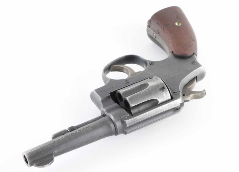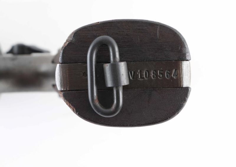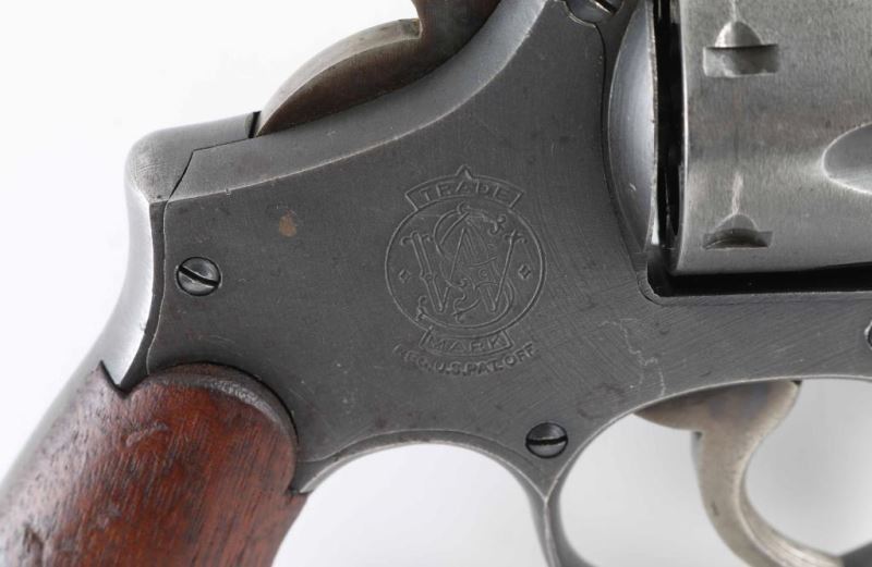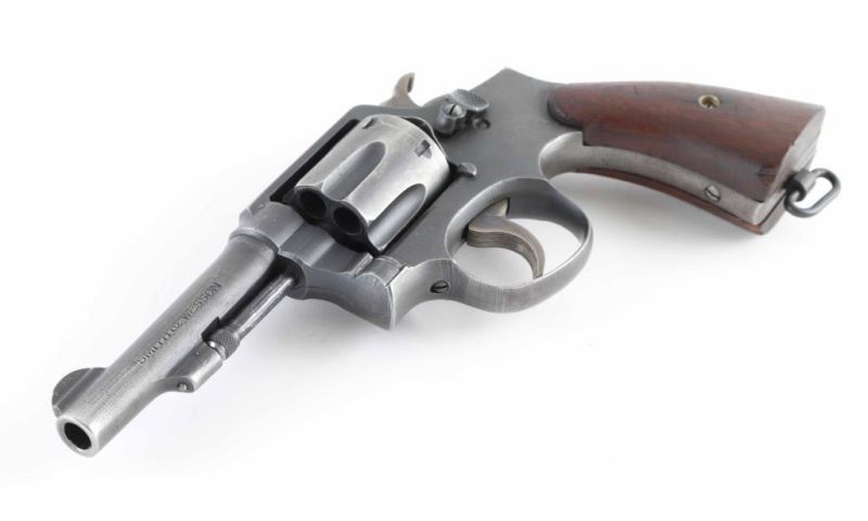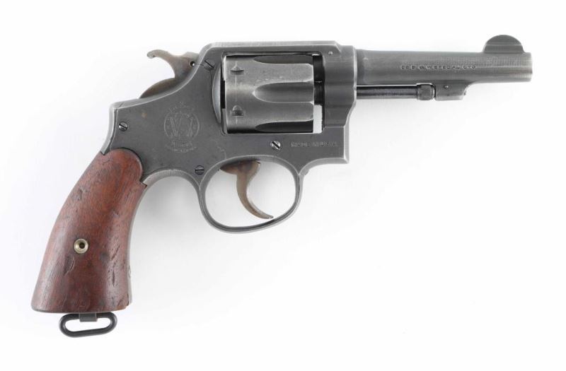 SN: V108564 US Military revolver features 4" barrel, fixed sights, swing out 6 shot cylinder, single/double action, lanyard ring in butt. Wartime "Victory Model" based on five screw K frame Military & Police. Bore is very good condition. Cylinder charge holes are bright and smooth. Metal finish is bead blast matte finish, appears parkerized medium gray, 90% coverage with thinning or bare metal at muzzle, high spots, where scratched. Trigger and hammer retain dull case color. Grips are smooth wood, very good condition with small scratches & dents. Action is heavy (feels like dried grease in action), a bit out of time, with good lock-up. Most markings are deep & even. Numbers on cylinder & barrel match frame. Condition is NRA Very Good+ *** C&R Firearm ***