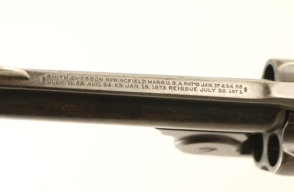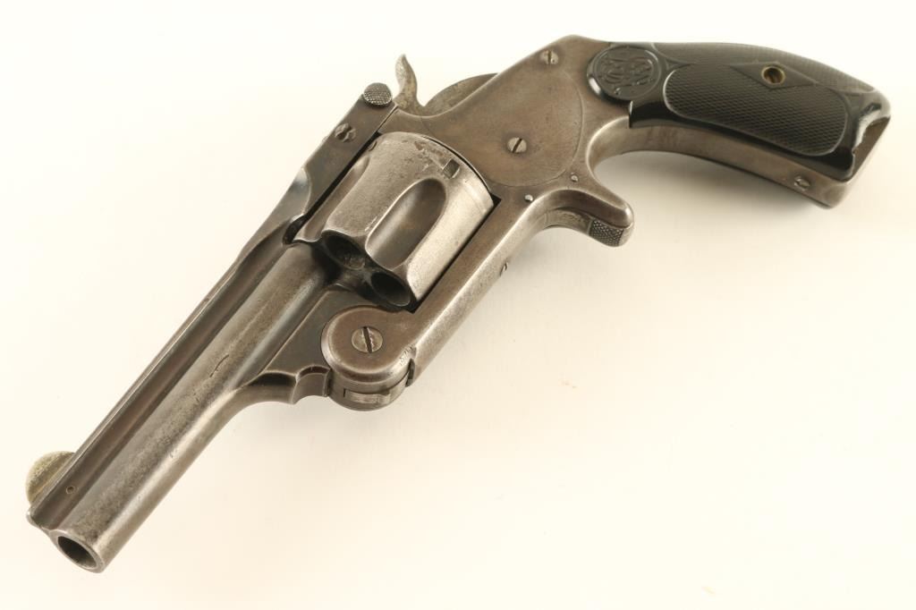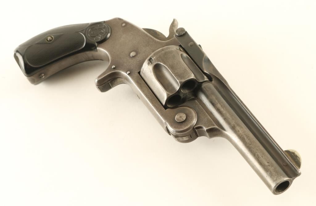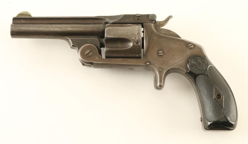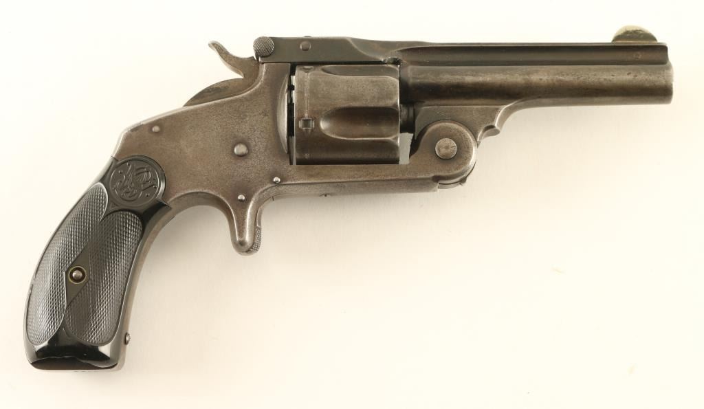 '2nd Model' revolver manufactured circa 1877-1891. Features blued finish, checkered black gutta percha grips with S&W logo, break top action with automatic ejection, 3.25" barrel with fixed sights. Bore is fair to good condition, evenly pitted with tiny shallow pits, strong rifling. Metal surfaces retain majority coverage of a faded gray color finish, slightly darker on barrel and protected areas. Grips are fair condition, serviceable, with chips missing on both panels at butt. Action is smooth, lock-up is fair. Two line barrel address is crisp with even depth letters. Condition is NRA Very Good *** Antique Firearm ***