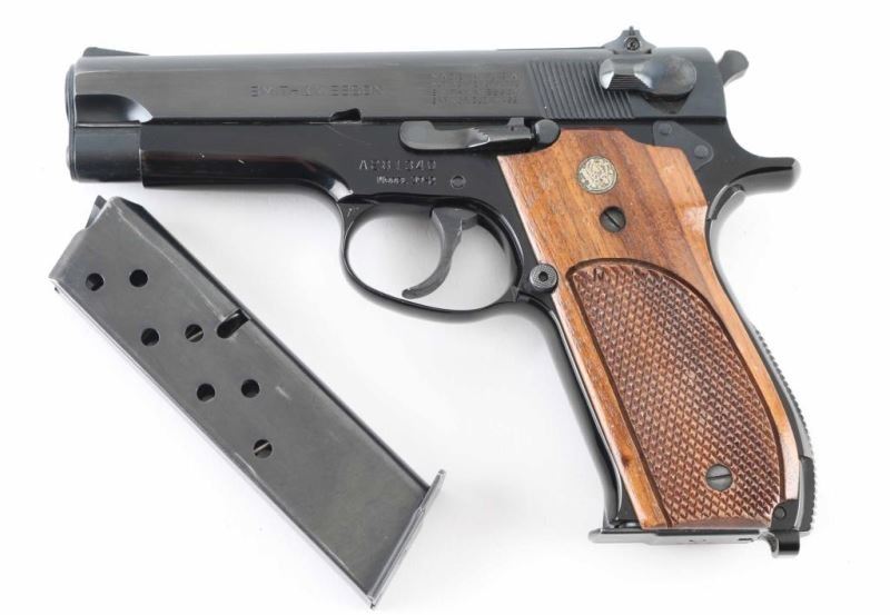American made double action semi-automatic pistol chambered in 9x19mm, manufactured circa 1971-1982. The model 39 was the first double action semi-automatic 9mm pistol manufactured in the United States. Features blued finish (black color finish on alloy frame), carbon steel slide, 4" barrel, full-length steel guide rod, serrated ramp front sight, windage adjustable micrometer click rear sight, smooth trigger, serrated round hammer spur, thumb safety/decocking lever on the left side of the slide, magazine disconnect safety, push button magazine release, factory 8 round magazine, knurled alloy backstrap w/ lanyard loop and two-piece checkered walnut grips w/ silver S&W medallions. Bore is very good condition. Retains 90& finish with scattered handling marks and rubbing wear to front edge of dust cover. Grips are very good condition with several dings and small dents. Includes spare magazine (2 mags total). Condition is NRA Very Good++ *** Modern Firearm ***