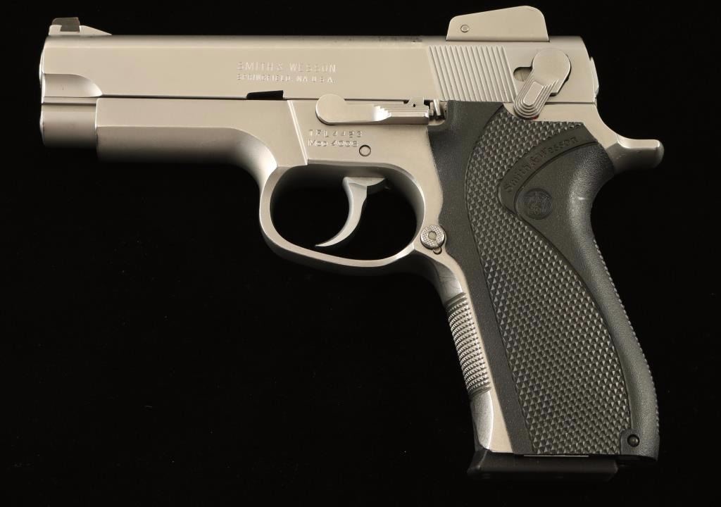 Stainless steel double-action semi-automatic pistol chambered in .40 Smith & Wesson, circa 1990-1999. Features a satin finish, 4" barrel, dovetailed patridge front sight, shrouded adjustable rear window sight, ambidextrous safety/decocker, .304" smooth trigger, bobbed hammer, push button magazine release, 10 round factory magazine, checkered front strap, and checkered one-piece black Delrin wrap-around grips with S&W insignias. Pistol exhibits a moderated amount of handling marks/bright scuffs and shows a small dent on the right side of the slide near the muzzle. Action is strong, bore is excellent, and grips are fine. Condition is very good+. ***Modern Firearm***
