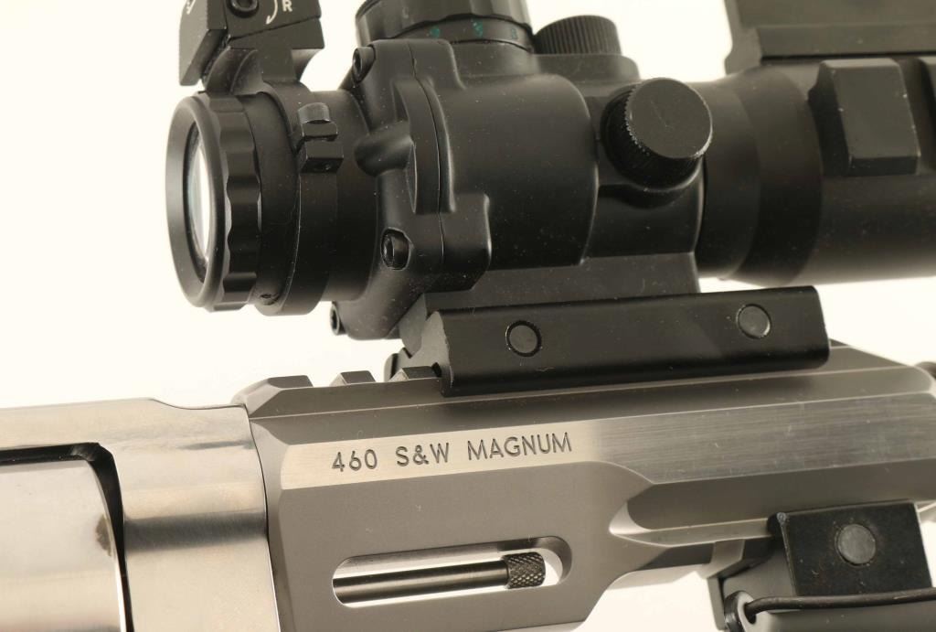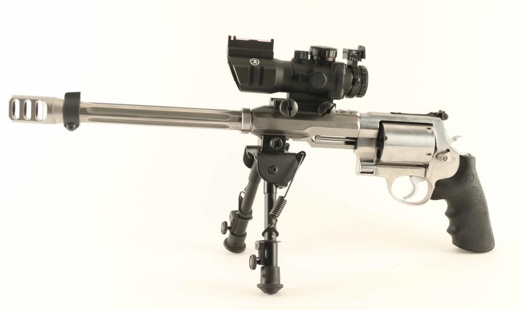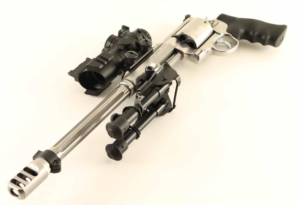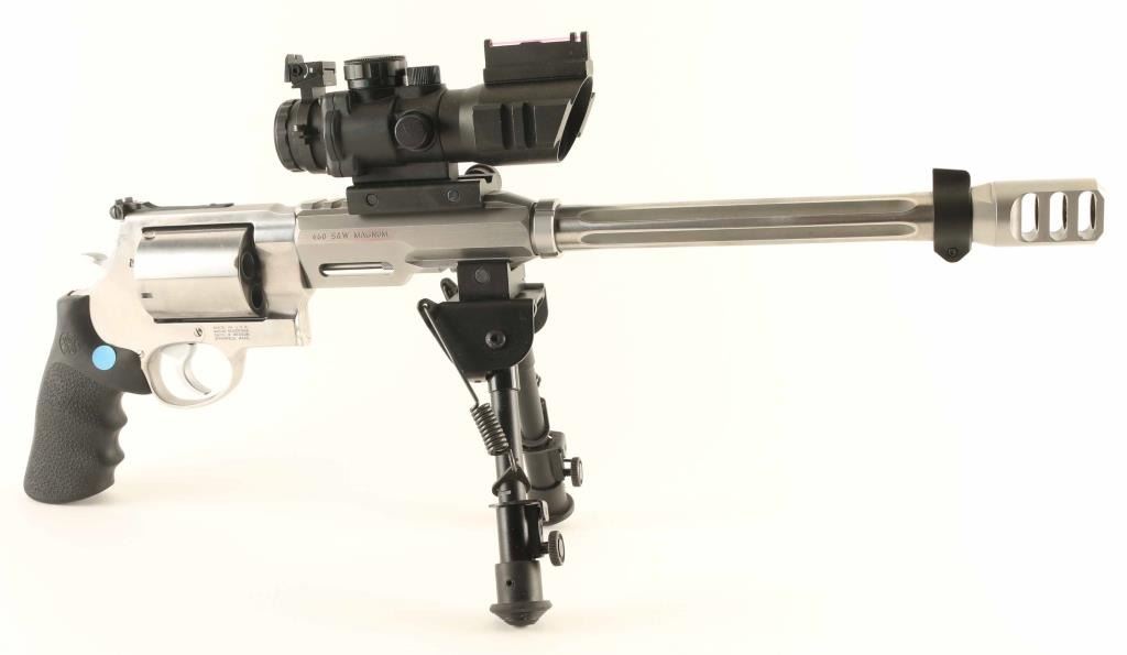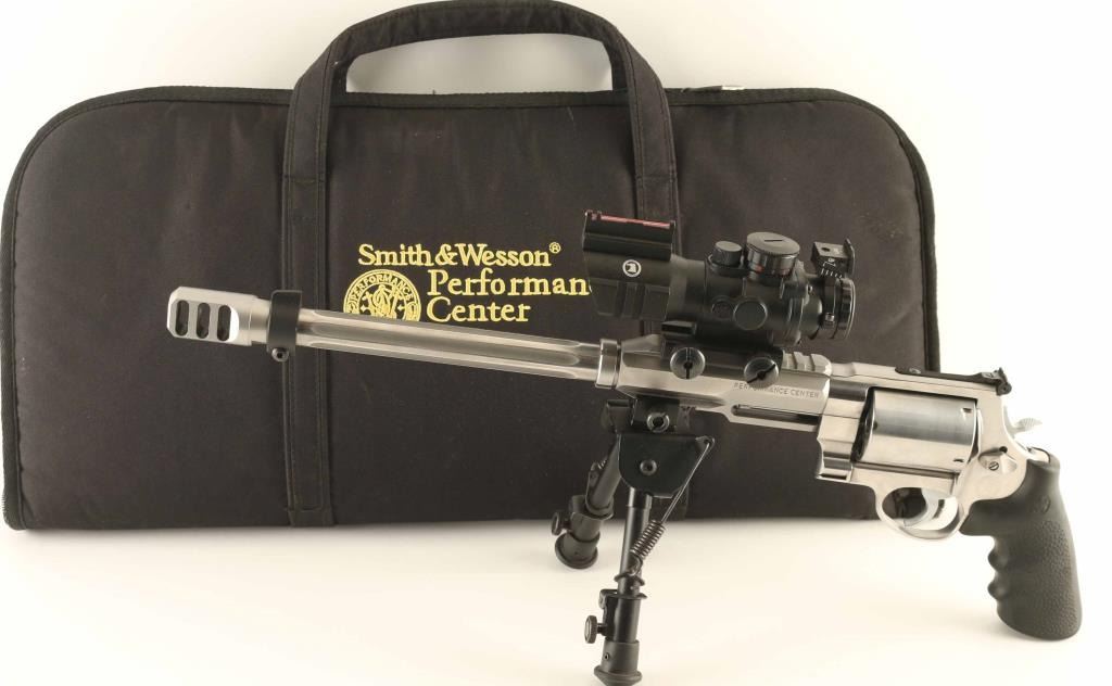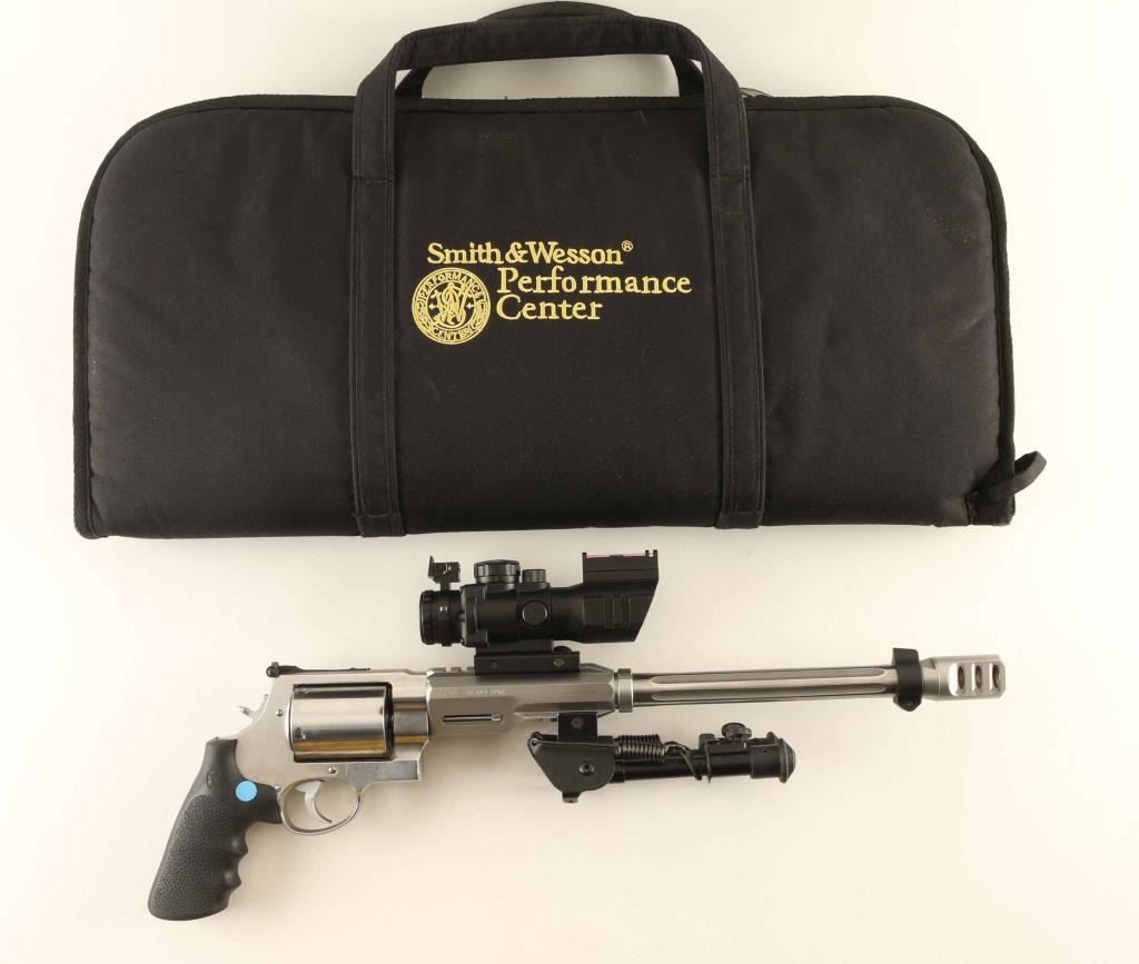 'Performance Center, 170280' Double action revolver chambered for 460 Smith & Wesson Magnum. Features stainless steel construction, 5 shot swing-out unfluted cylinder, adjustable sights, pebble texture rubber grip with finger grooves and S&W logo, 14" barrel with Picatinny type rail section, accessory rail under barrel, muzzle brake. Bore is excellent condition. Stainless finish is excellent with minor handling wear. Grips are in excellent condition. Includes a S&W Performance Center soft sided carry case, Harris style adjustable bipod, Osprey Global rifle scope with integrated adjustable sights and accessory rail sections. The rifle scope does not feature long eye relief. Condition is NRA Excellent ***Modern Firearm***