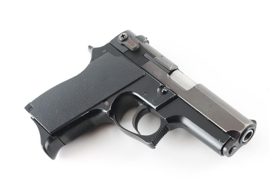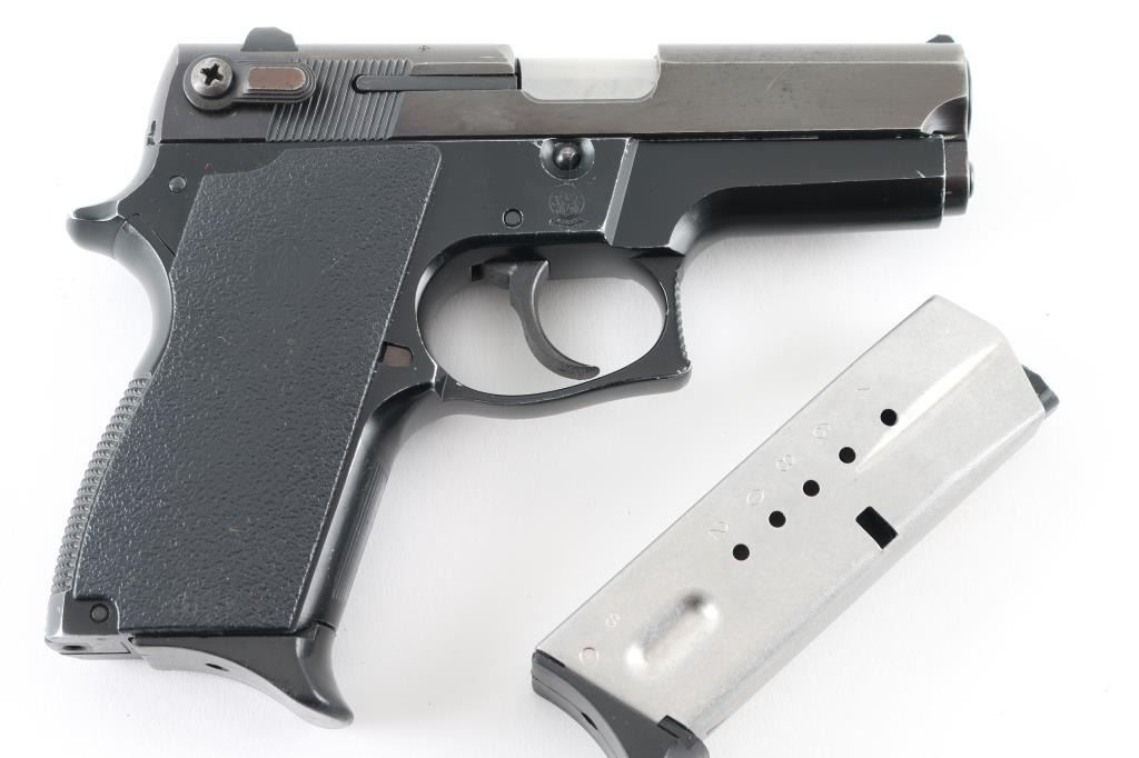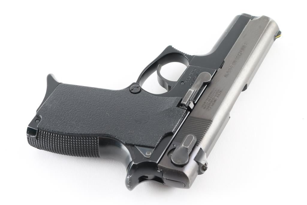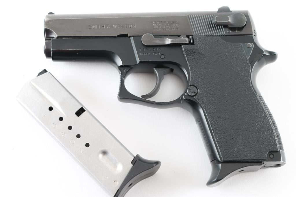 American made DA/SA semi-auto pistol chambered for 9mm Parabellum ammunition. It has a 3.25" barrel, steel slide, alloy frame, tiny serrated fixed front sight with yellow high lite, dovetailed notch rear sight, smooth trigger, bobbed hammer with serrations, ambidextrous thumb safety, knurled back strap and front of trigger guard with front strap serrations and textured black plastic S&W logo grips. Metal finish looks good but does show signs of use and handling with a few scuffs and loss of finish toward the muzzle and on the stubby beavertail. Grips are fine. Bore looks great, bright. Comes with two magazines. Condition is NRA Good+ *Modern Firearm*