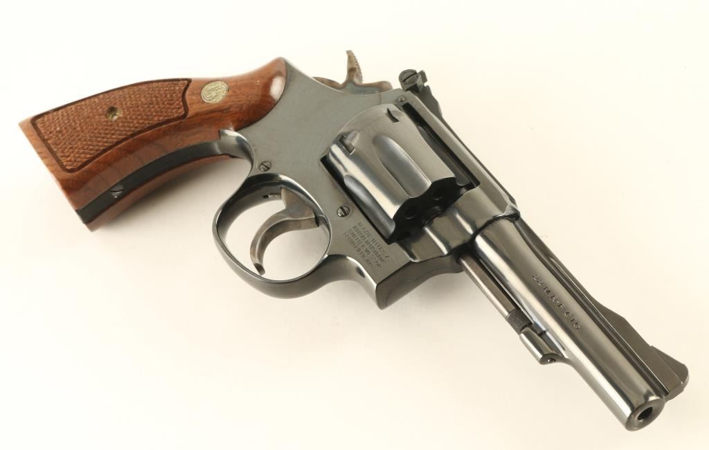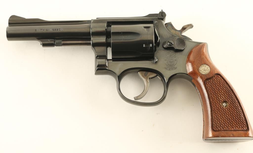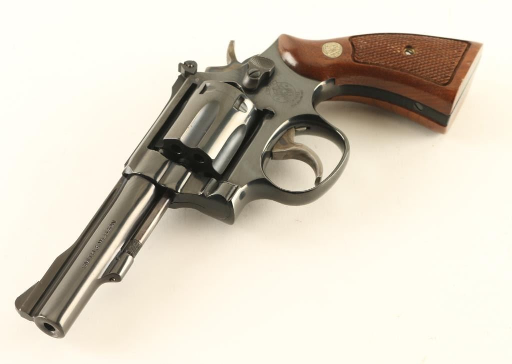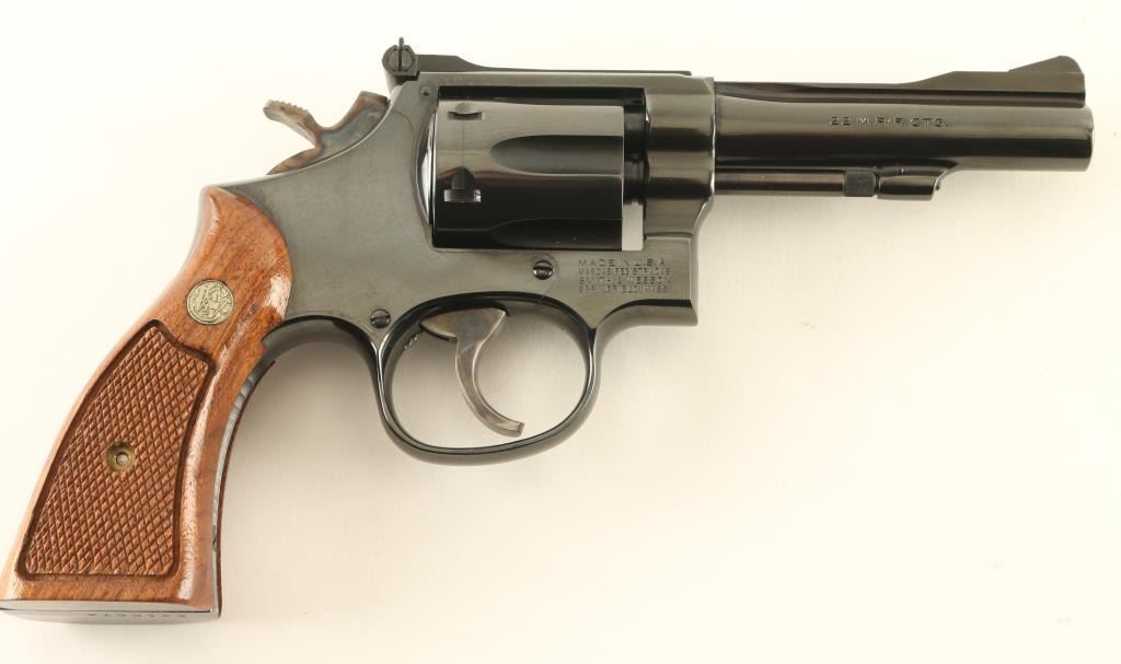 Double/single action rimfire revolver manufactured circa 1982. Features blued finish, checkered wood "magna" style grips with S&W medallions, 4" barrel, adjustable sights, 6 shot cylinder, narrow smooth case colored trigger, checkered medium width spur case color hammer. Bore and charge holes are excellent. Retains 95% blue with some thinning or bare metal at drag line, near muzzle, sharp edges, ejector rod. Grips are excellent. Action is smooth with tight lock-up. Condition is NRA Excellent *** Modern Firearm ***