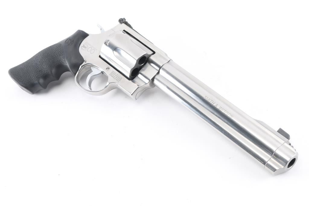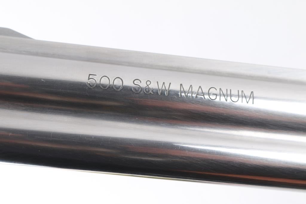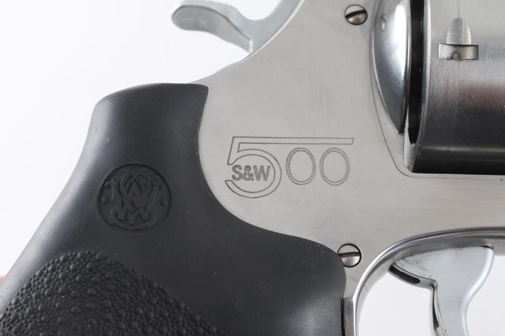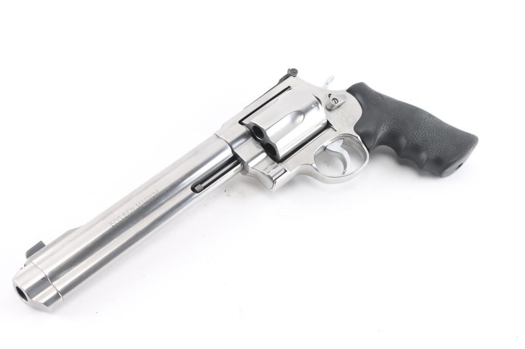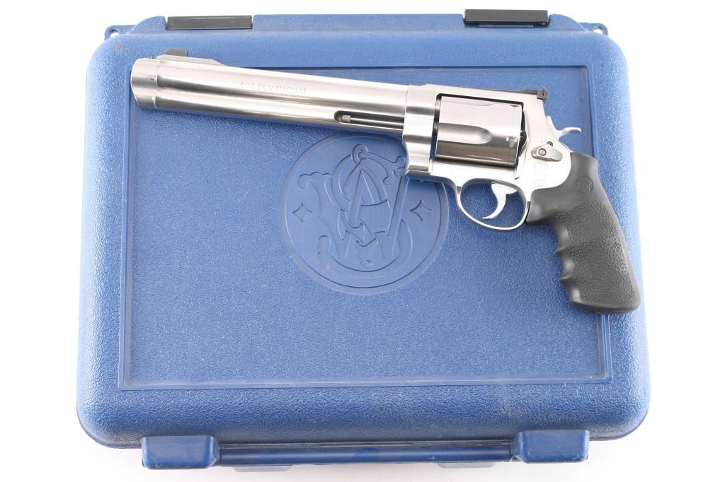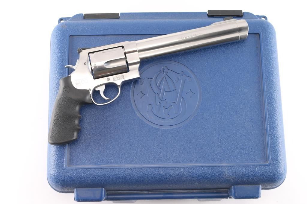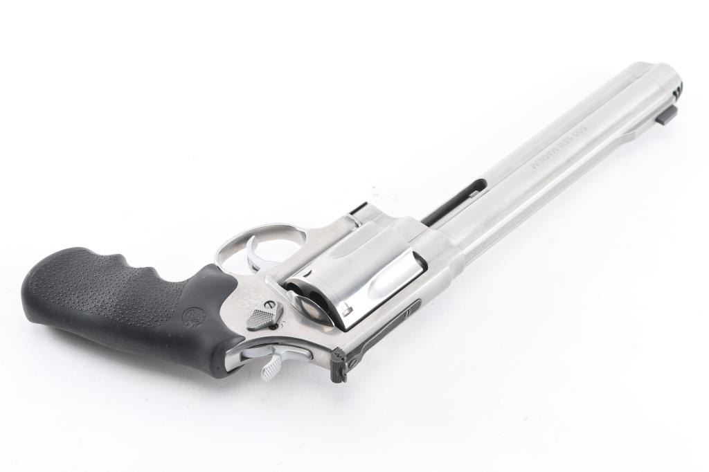 Large X Framed double action revolver in 500 S&W Magnum. Features stainless steel construction, pebble texture black rubber finger groove grips with S&W motifs, raised blade front, adjustable rear sights, 9" full lug barrel, 5 rd fluted cylinder. S&W internal lock system. Bore is pristine. Bright stainless finish is excellent with minor scuffs and tiny scratches from handling. Grips are excellent, action is crisp with tight lock-up. Includes factory S&W blue hard case, lock and manual.Condition is NRA Excellent. Modern Firearm
