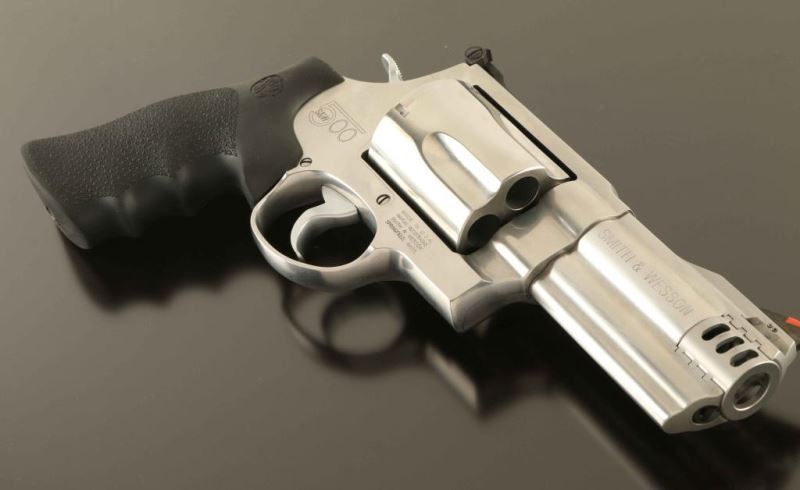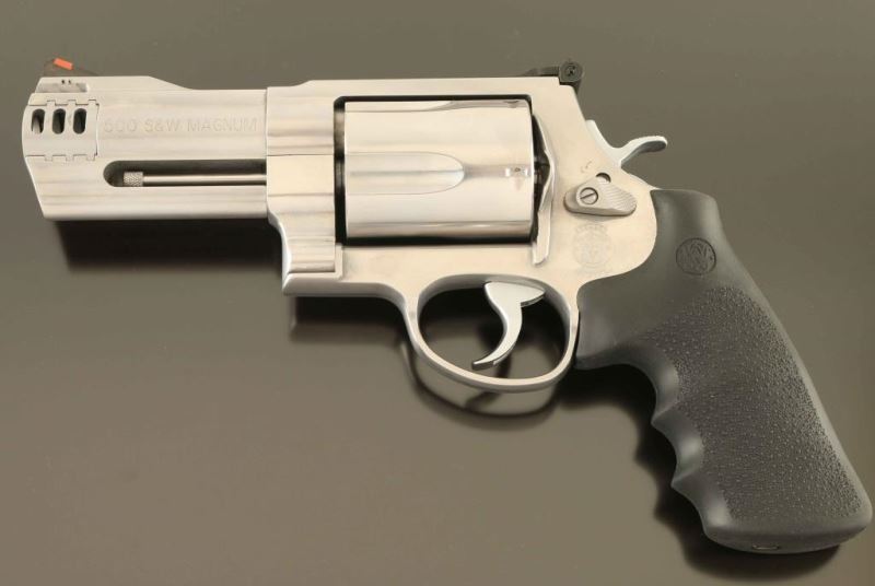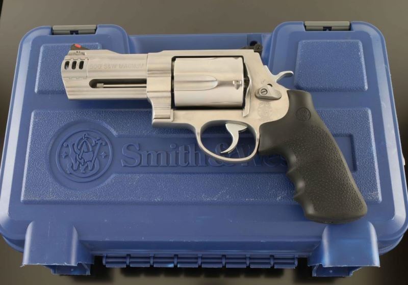 Stainless steel extra large frame double-action revolver chambered in .500 Smith & Wesson Magnum, manufactured circa 2012. Features a brushed finish, ribbed 4" barrel with an integral 1" compensator, ports & full underlug, raised ramp front sight with red insert, adjustable micrometer click rear sight with white outlined square notch, fluted five-shot cylinder, MIM .400" smooth combat trigger, .430" semi-target hammer, internal key lock safety, four screw round butt X frame and one-piece pebble black rubber Hogue Monogrip with S&W monograms. Includes the original factory hard case with spent case, keys and additional compensator. Revolver exhibits a semi-polished cylinder and shows no major wear. Action is smooth with very good lock up, the bore is excellent and the rubber grip is fine. Condition is NRA Excellent in box ***Modern Firearm***