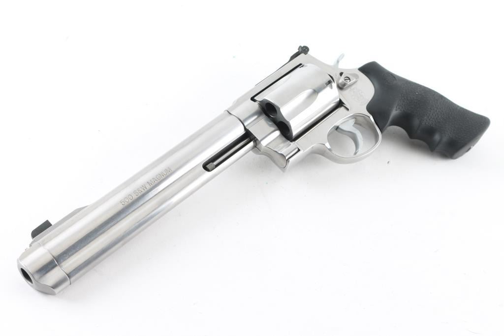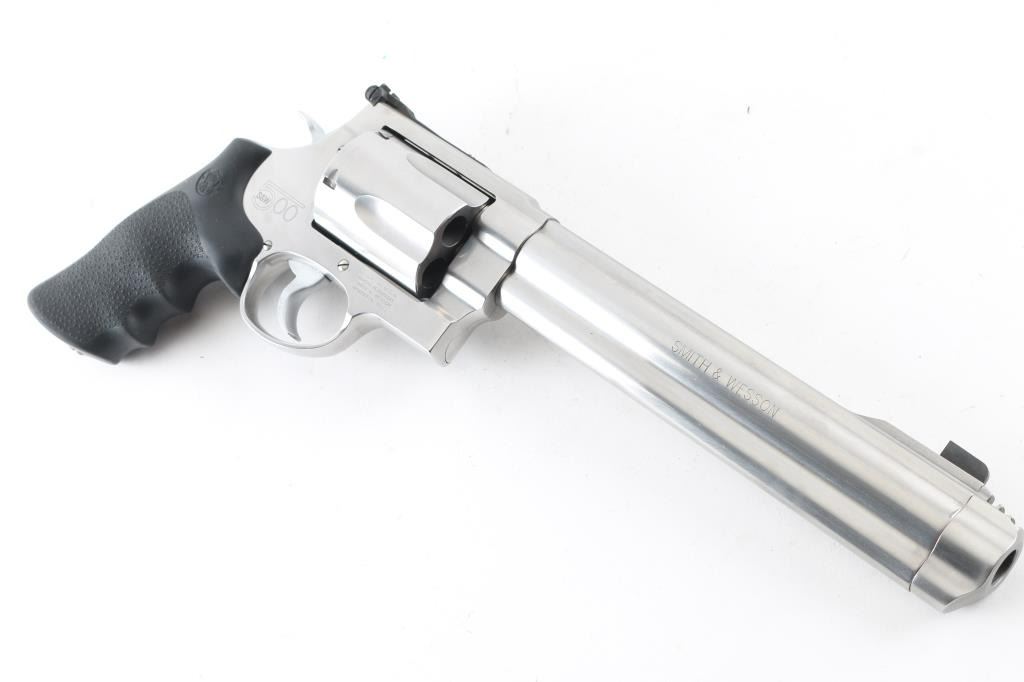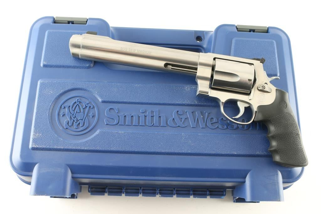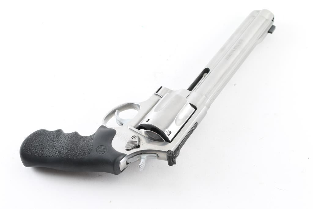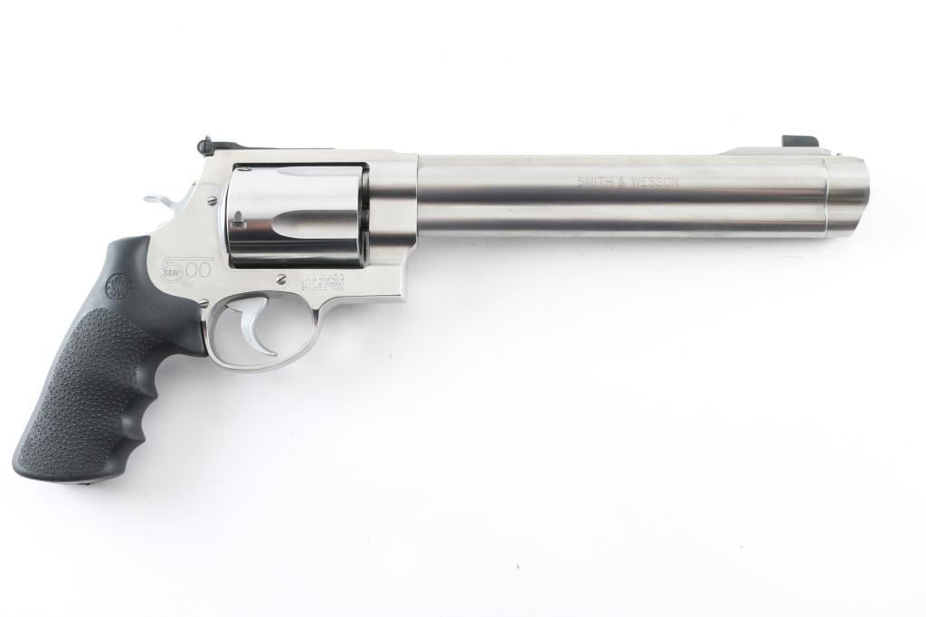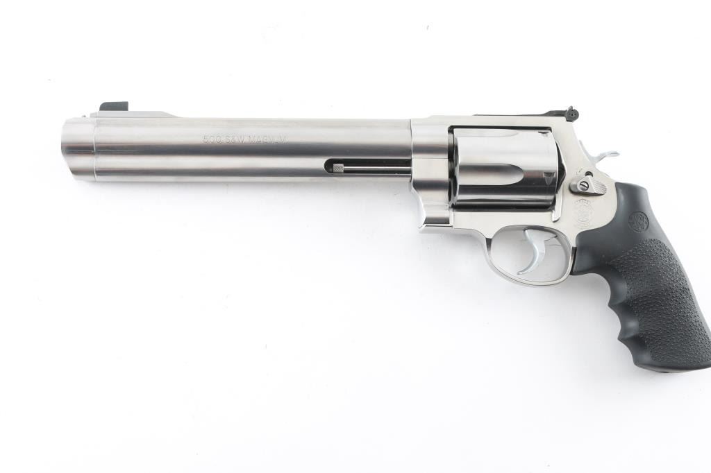 Made in America, this is a Smith & Wesson 5 Shot double action revolver chambered for .500 S&W Magnum cartridges. This hand cannon features a 9" stainless barrel and frame with full under lug, compensator cuts at top of muzzle, fluted cylinder, raised blade front sight, adjustable white outline notch rear sight, smooth trigger, serrated hammer spur and one piece wrap around rubber S&W pebbled grips with finger grooves. Metal finish looks great with some minor signs of use and handling and a drag line on the cylinder. Grips are great. Bore looks very good but needs cleaned. Comes with original blue plastic factory case, owners manual, key for internal trigger lock and compact cleaning kit. Condition is NRA Excellent **Modern Firearm**