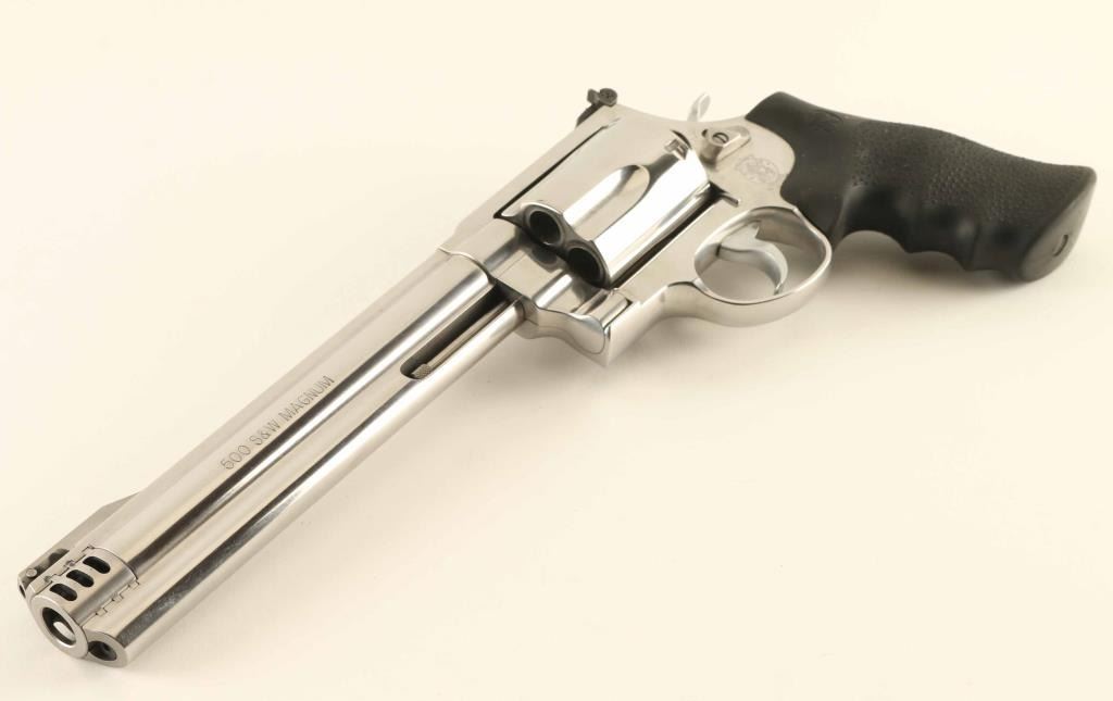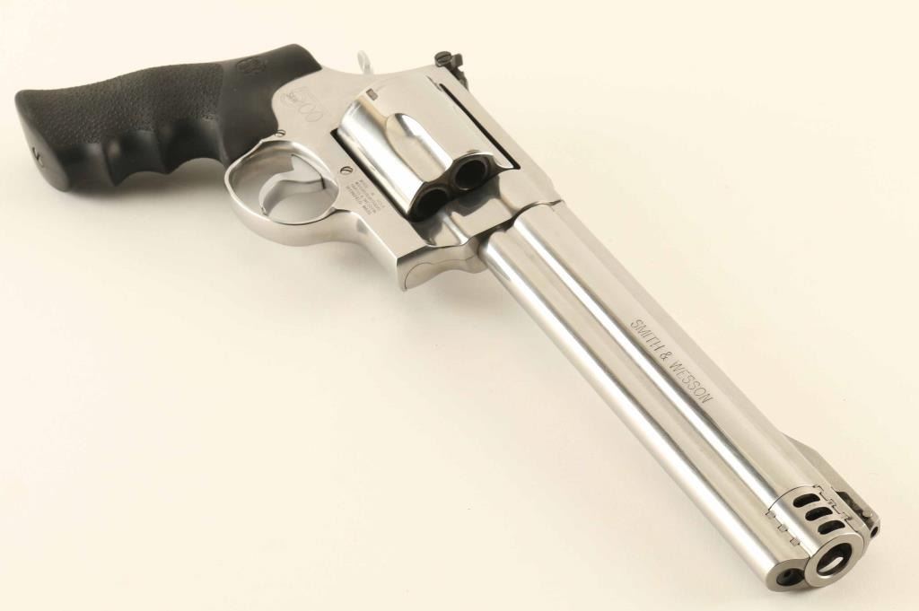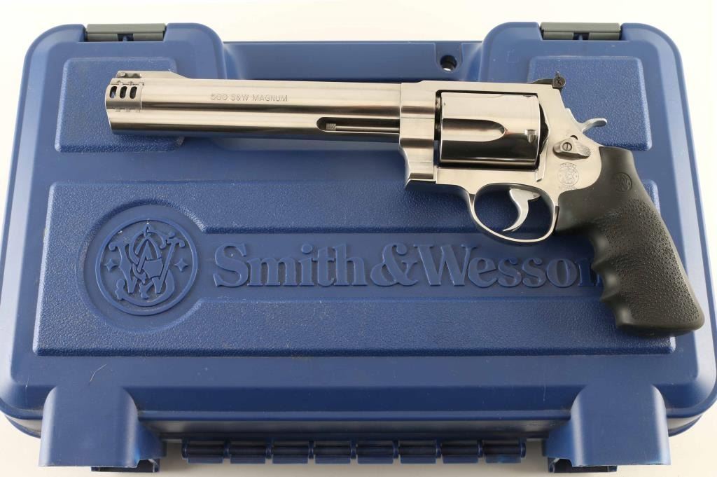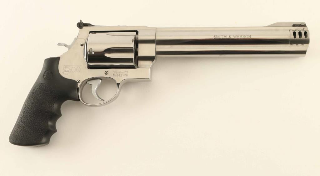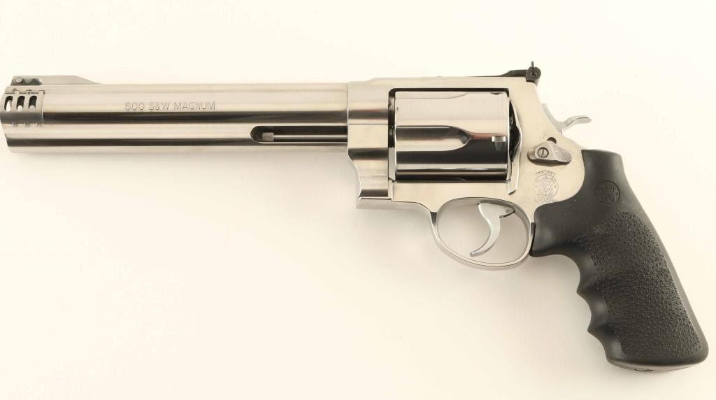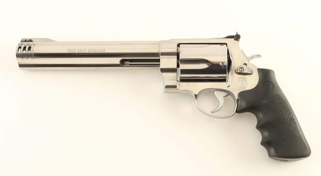 Double or single action revolver in 500 S&W Magnum. Features stainless steel construction, pebble texture black rubber finger groove grips, adjustable sights, 8-3/8" barrel with integral muzzle brake, S&W lock system. Bore is excellent condition. Bright stainless finish is very good condition with scuffs and tiny scratches from handling. Front sight blade is missing. Includes cable lock, additional muzzle brake insert with tool, keys for revolver internal lock, hard sided S&W plastic carry case with foam lining. Condition is NRA Excellent ***Modern Firearm***
