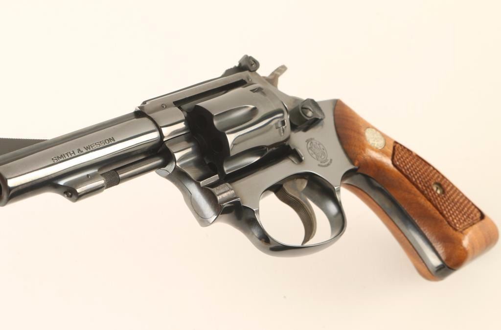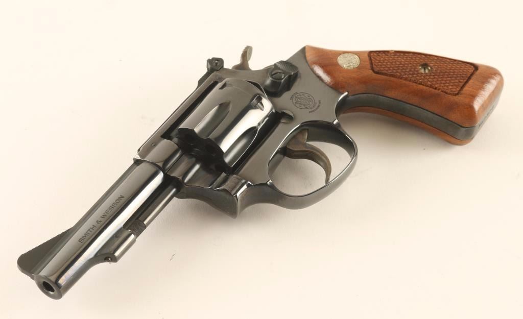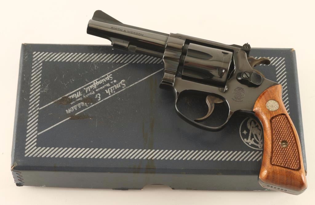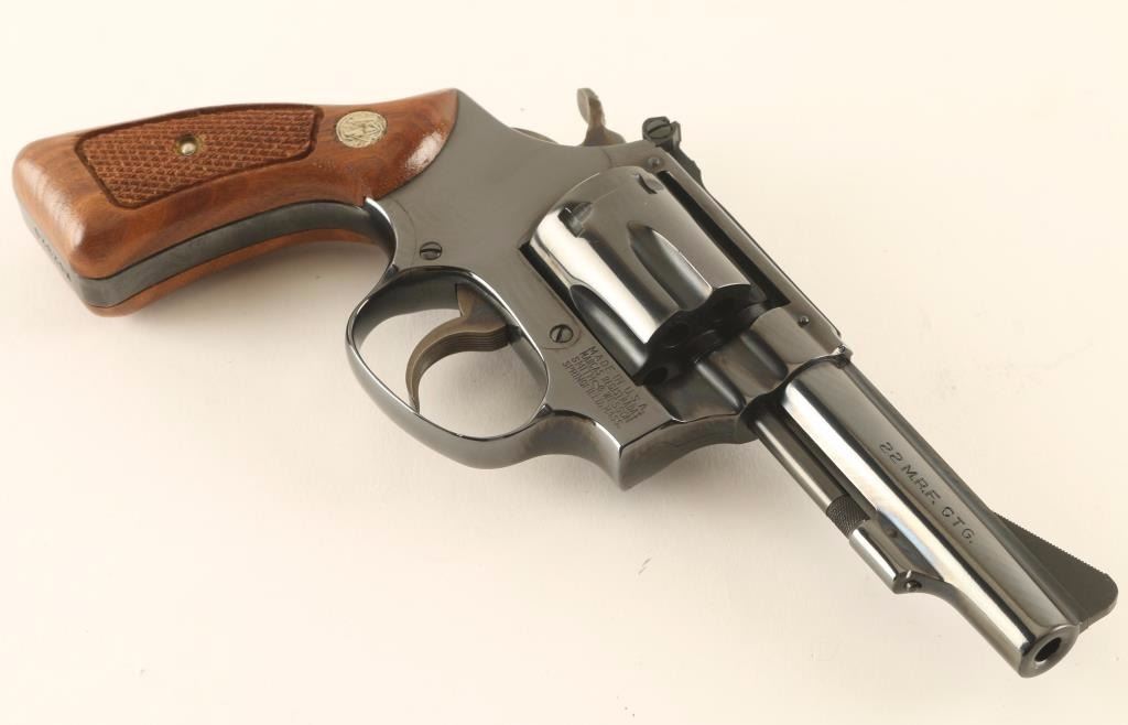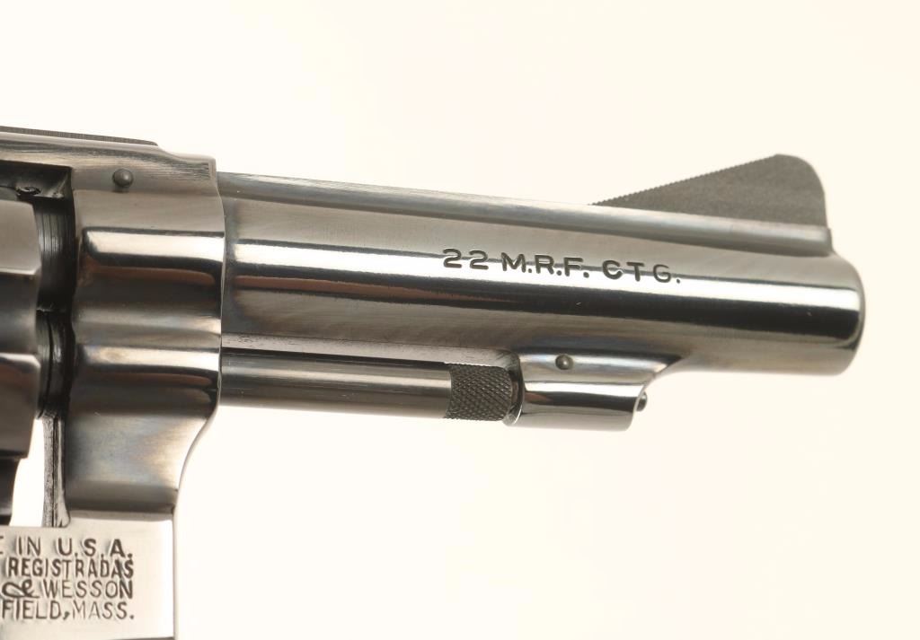 '1960 Kit Gun Magnum' Small frame double-action revolver chambered in .22 Winchester Magnum Rimfire, circa 1969-1974. Features a blued finish, pinned 3 1/2" barrel with narrow rib, non-shrouded ejector rod, ramp front sight, micrometer click adjustable rear window sight, fluted six-shot cylinder with recessed chambers, .240" serrated trigger, .375" semi-target hammer, round-butt J target frame and two-piece checkered walnut Magna grips with S&W medallions. Includes the original factory cardboard box with documents and cleaning tools. Revolver exhibits approximately 99% of it's original blued finish showing minimal wear and a faint drag line on the cylinder. Action is smooth with tight lock-up, bore is excellent and matching wood grips are fine with a single small dent on th left panel. Condition is near new in box. ***Modern Firearm***