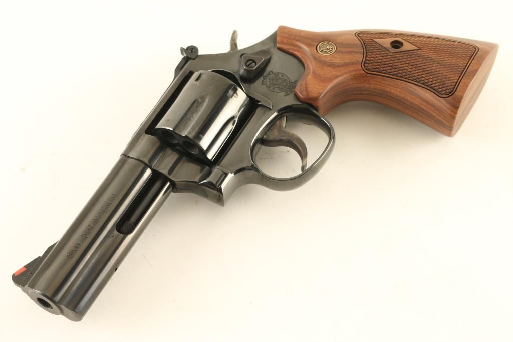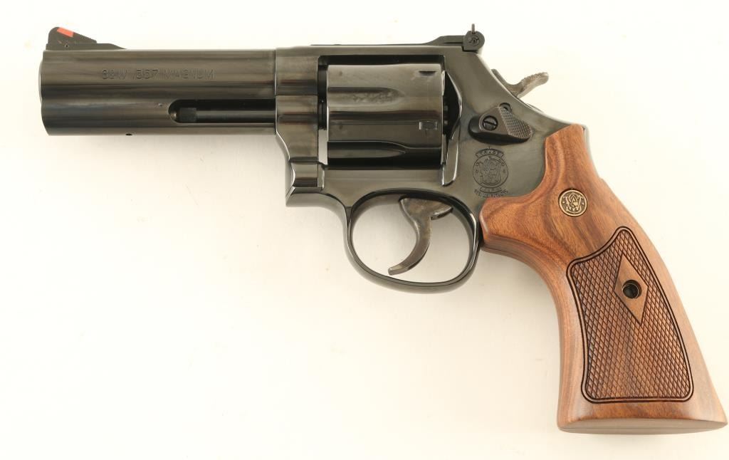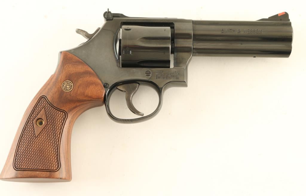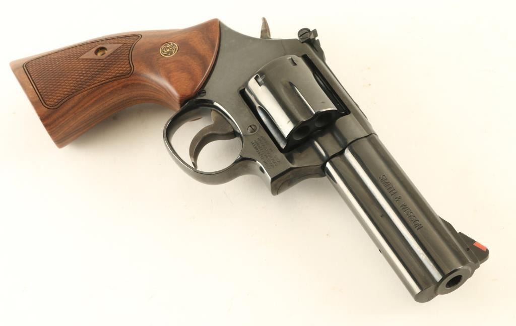 Double/single action revolver built on the "L" frame, features blued finish, checkered wood target style grips with S&W medallions, 4" barrel with full length underlug, adjustable sights with orange ramp and white outline rear, key lock safety in frame. Bore is excellent. Overall condition is almost like new with few handling marks. Smooth action & tight lock-up. Condition is NRA Excellent *** Modern Firearm ***