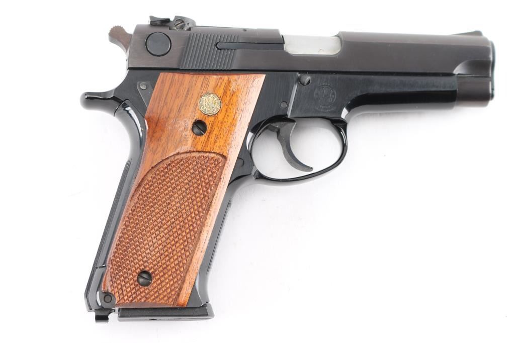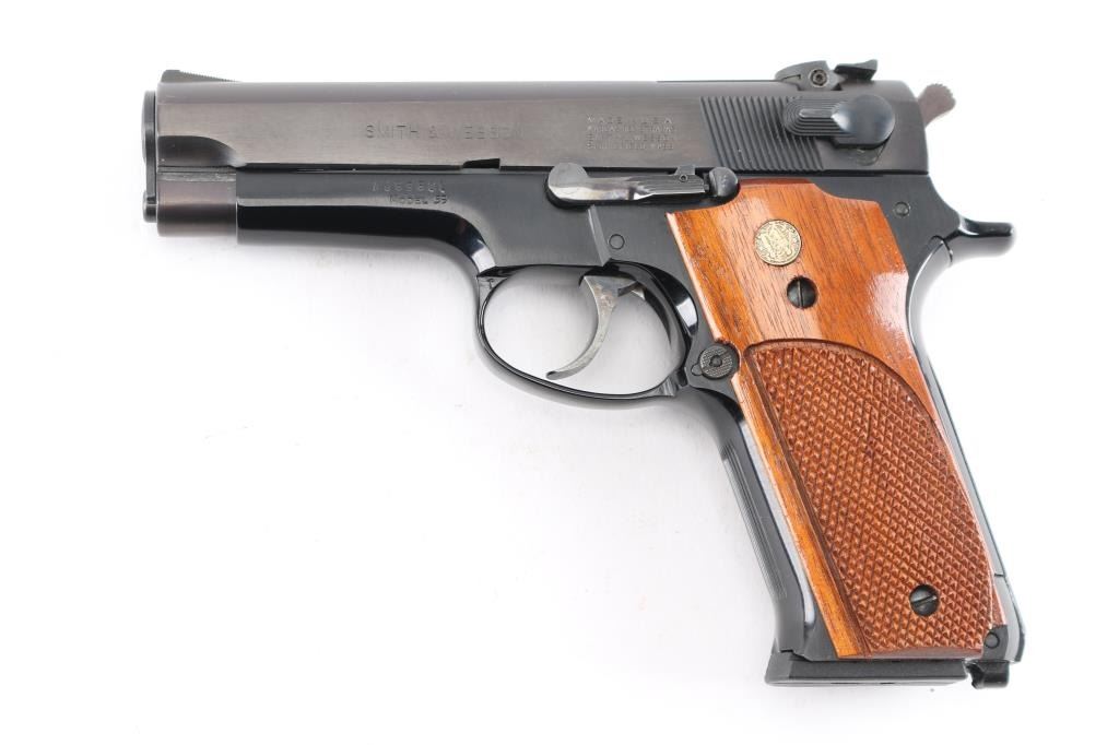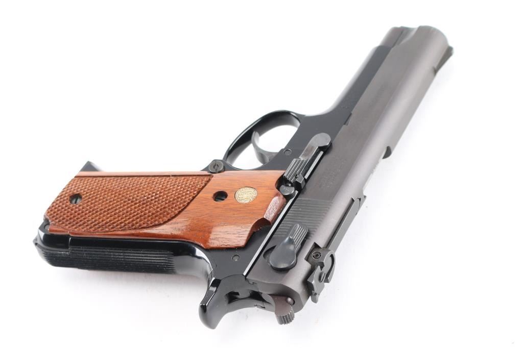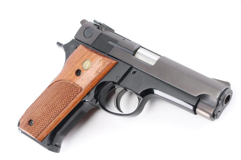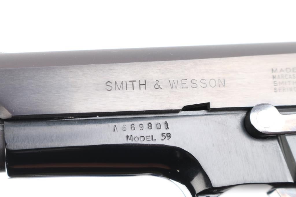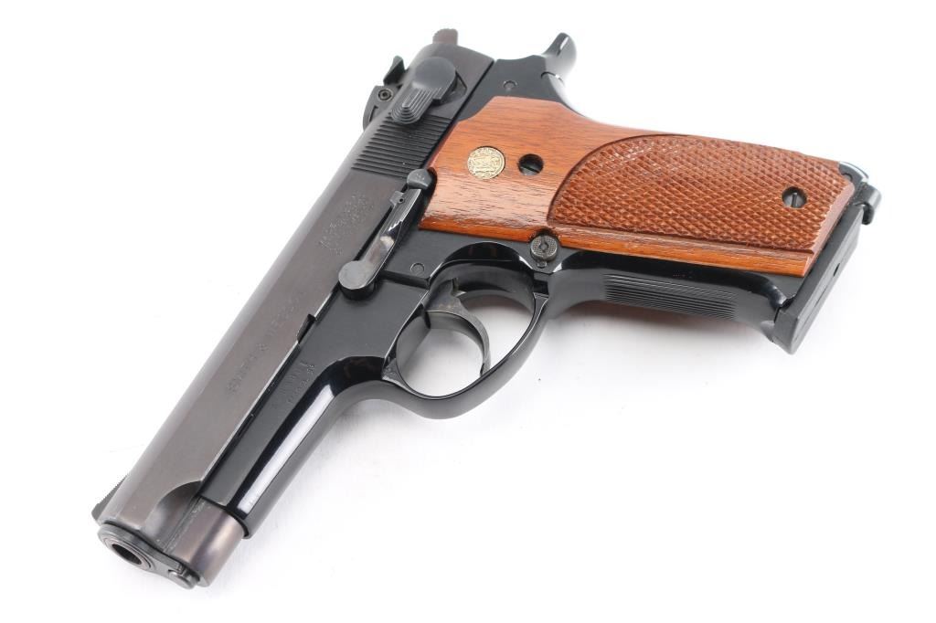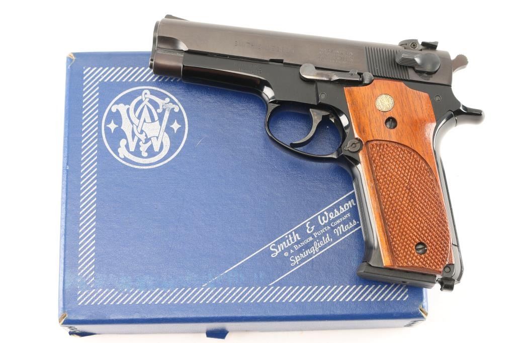 Double action semi-automatic ‘wonder-nine’ pistol chambered in 9x19mm, manufactured in Springfield, MA circa 1971-1982. Features a blued steel slide, 4" barrel, full-length steel guide rod, serrated ramp front sight, windage adjustable micrometer click rear sight, smooth wide trigger, serrated round hammer spur, manual safety/decocking lever on the left side of the frame, magazine disconnect safety, push button magazine release, 14 round magazine, black anodized alloy frame with serrated front strap, serrated alloy mainspring housing with lanyard loop, and checkered wood grips with silver S&W medallions. Pistol retains approximately 98% of its original finish showing light handling marks and wear. Action is crisp, the bore is pristine and thick wood grips are fine. Comes in original blue factory cardboard box with matching serial number