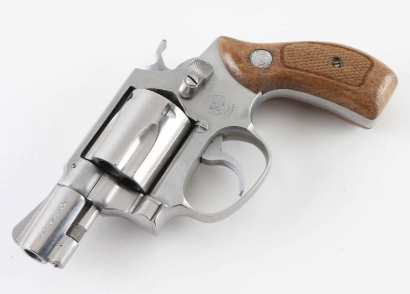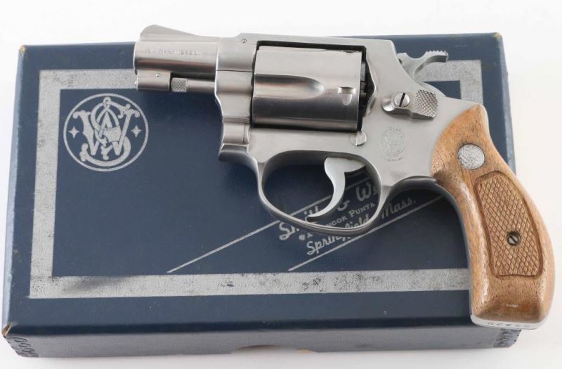 Pinned - No Dash. Double action revolver features stainless steel construction, checkered wood "magna" grips with S&W medallions, 1-7/8" barrel, fixed sights, round butt, "J" frame, 5 shot fluted cylinder. Overall condition is very good to excellent with smooth operation and tight lock-up, minor handling marks, very good bore. Grips are good serviceable condition, showing light wear near butt, some finish loss. Includes factory box numbered to gun, with instruction sheet & cleaning rod. Condition is NRA Very Good++ *** Modern Firearm ***