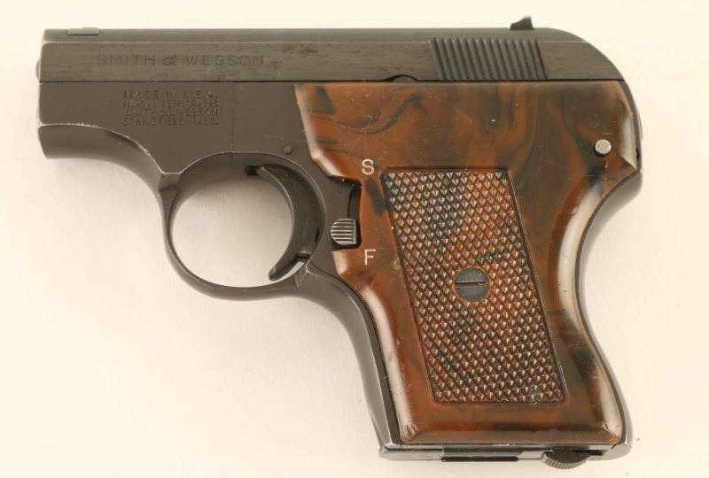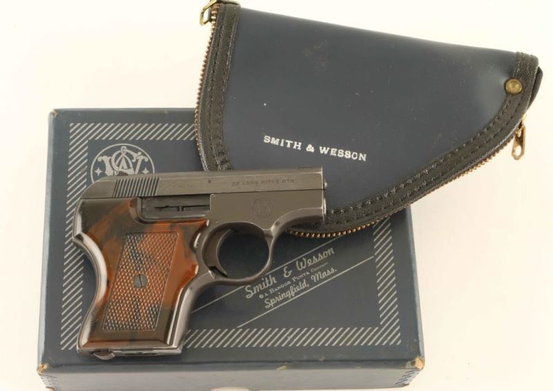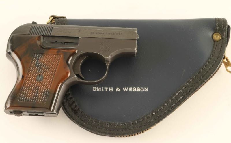 'Pocket Escort' Single action semi-automatic concealed hammer pocket pistol chambered in .22 Long Rifle, manufactured circa 1970. Features a blued slide, 2 1/8" barrel, blade front sight, dovetailed rear sight with square notch, cocked indicator, forged aluminum frame finished in dark grey, heel magazine release, factory 5 round magazine, smooth trigger, manual safety and two-piece checkered faux wood plastic grips. Includes a factory two-piece blue cardboard box & zippered soft case. Pistol exhibits approximately 85% of it's original finish showing edge wear, handling marks and a small amount of emerging surface rust on the slide. Action is smooth, bore is excellent and the plastic grips are good with numerous scratches. Condition is NRA Good in box. ***Modern Firearm***