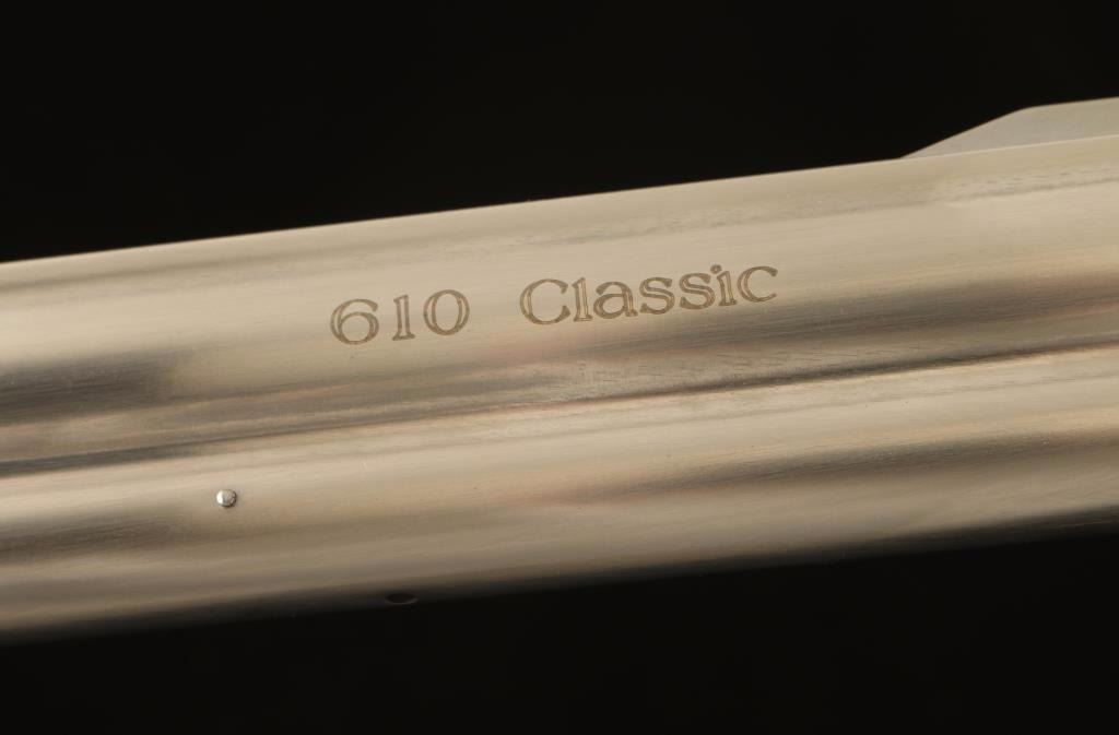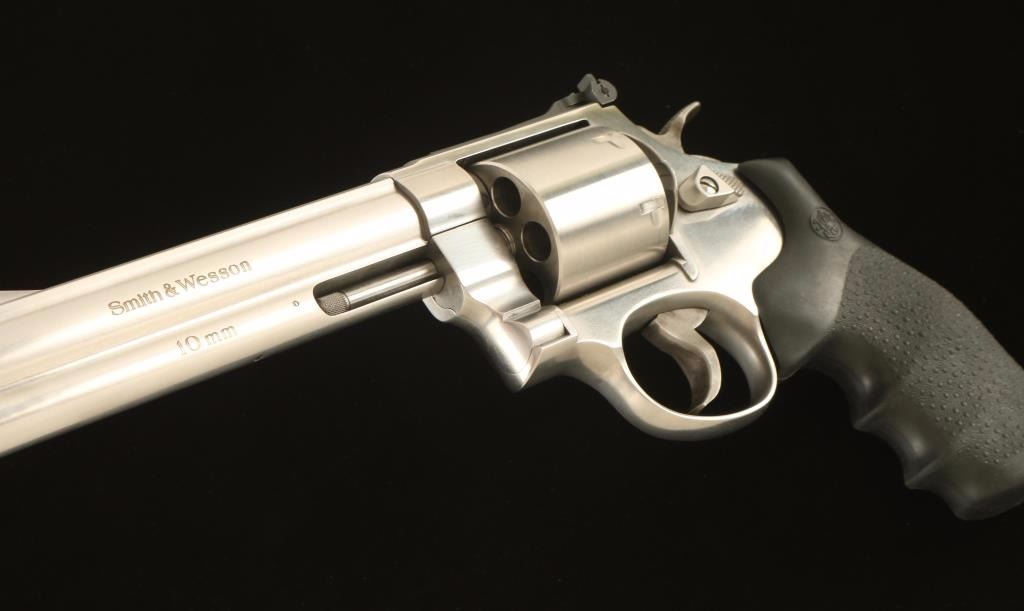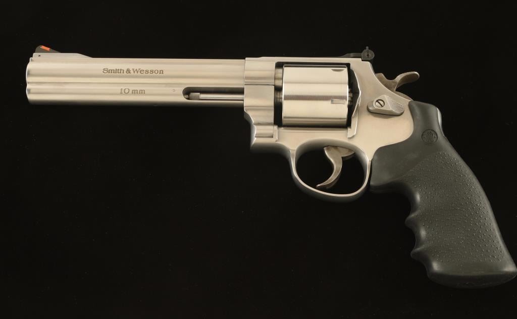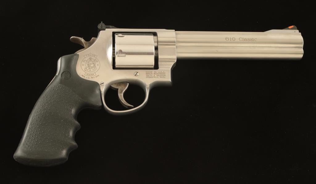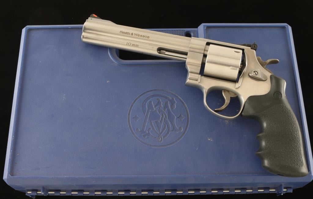 'Classic Hunter' Large frame stainless steel double-action revolver chambered in 10mm, circa 1998-2001. Features a brushed finish, 6 1/2" full-lug barrel with serrated top rib, raised ramp front sight with orange insert, micrometer click adjustable rear window sight with white outline, non-fluted six-shot cylinder, .400" smooth target trigger, .500" target hammer, round butt N target frame and one-piece pebbled black rubber Hogue Monogrip with S&W insignias. Includes the original factory hard case with documents, lock and moon clips. Revolver exhibits only modest handling marks and a light drag line on the cylinder with no major wear observed. Action is smooth with tight lock-up, bore is pristine and rubber grips are fine. Condition is near excellent in case. ***Modern Firearm***