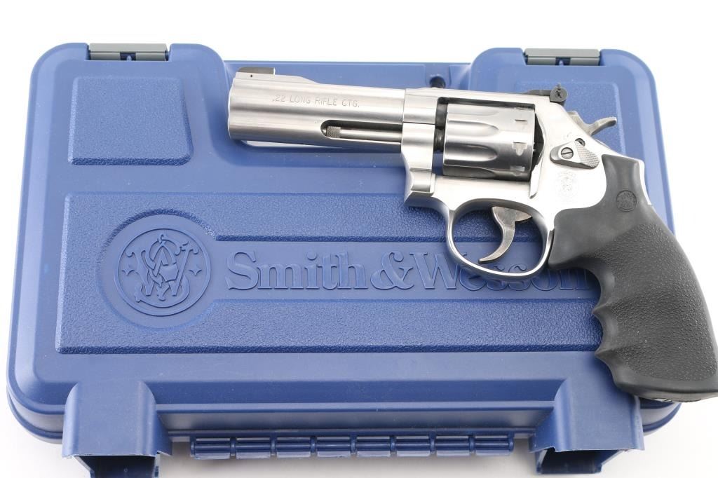 The "K-22 Masterpiece". Stainless steel and color case-hardened double-action 6-shot revolver with a 4" full underlug ribbed barrel, adjustable rear sight, target front sight, matte topstrap/rib and Hogue Monogrip rubber grips. Metal finish shows a drag line and a few small rubs. The case hardening on hammer and trigger have faded. Bore is excellent/bright. Grips are very good. Action is smooth with good lock-up. Comes in original blue factory hard case with security lock keys, manual, and lock. NRA Condition-Very Good+. Modern firearm.