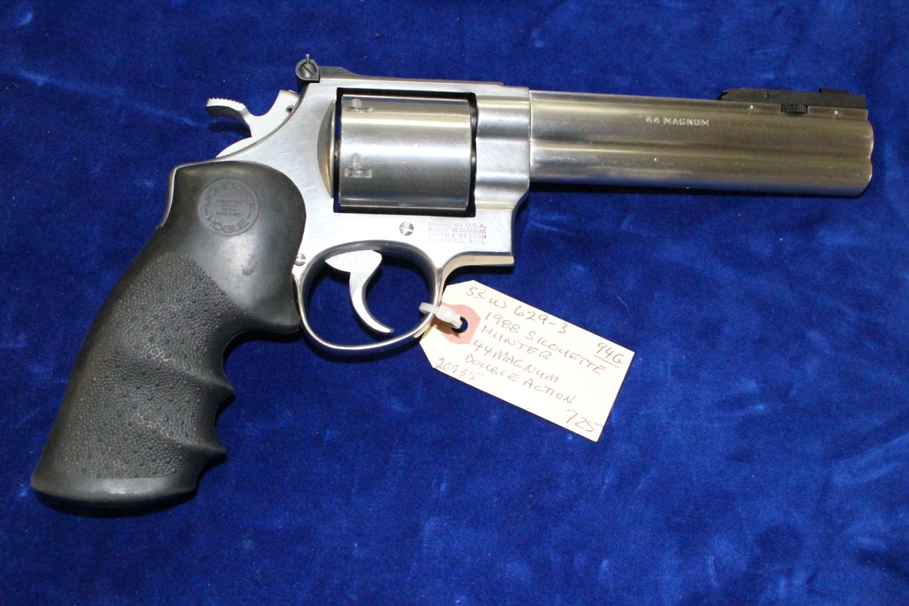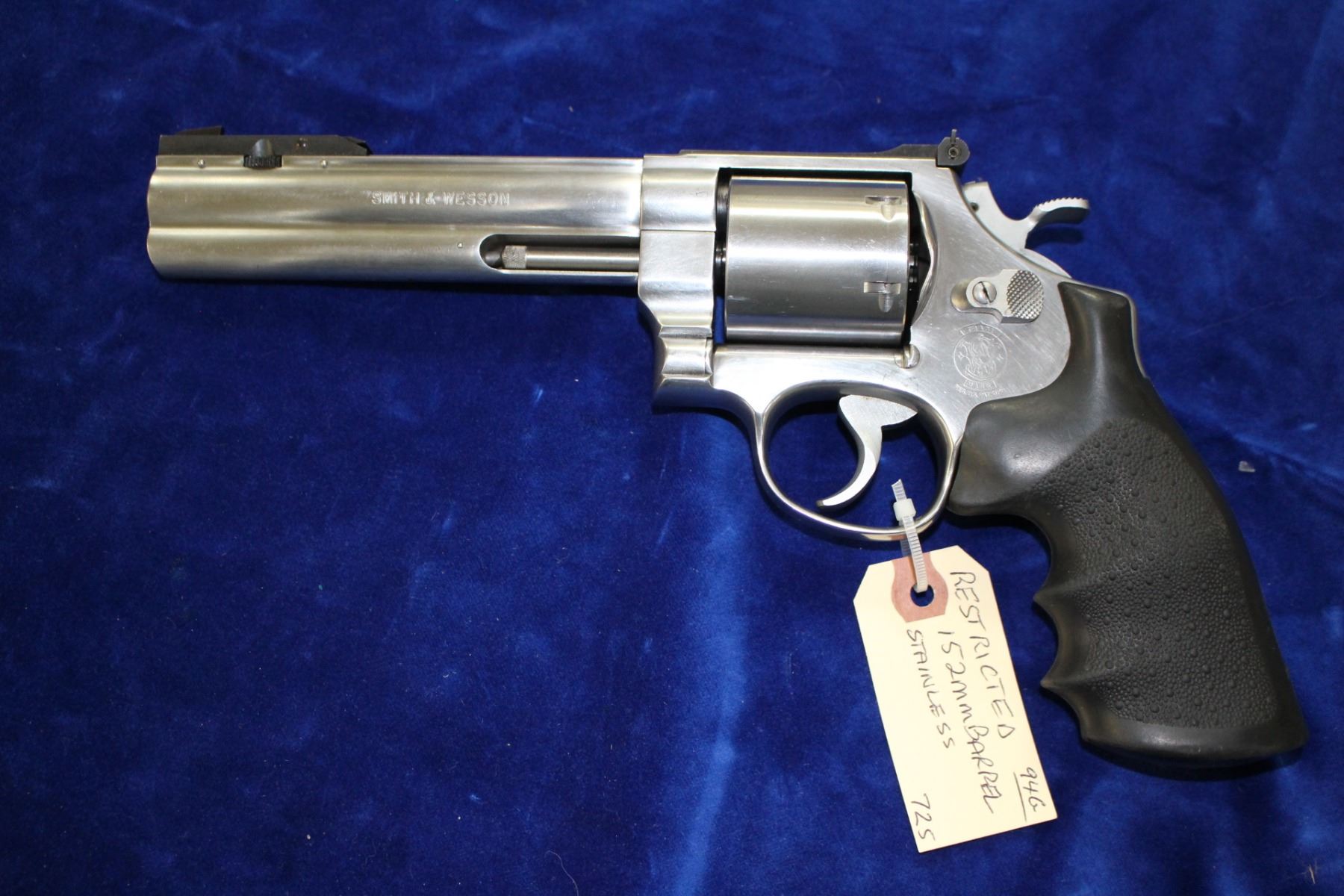 44 Magnum; Unfluted; Dbl Action; Stainless; Front & Rear Sight; 152mm Barrel; Good, clean bore; Rubber Grips; Good Condition; S/N BEU5927