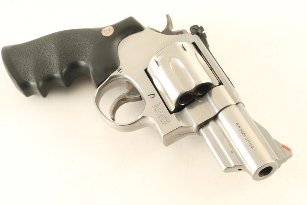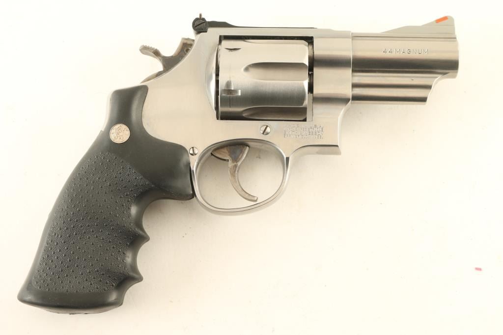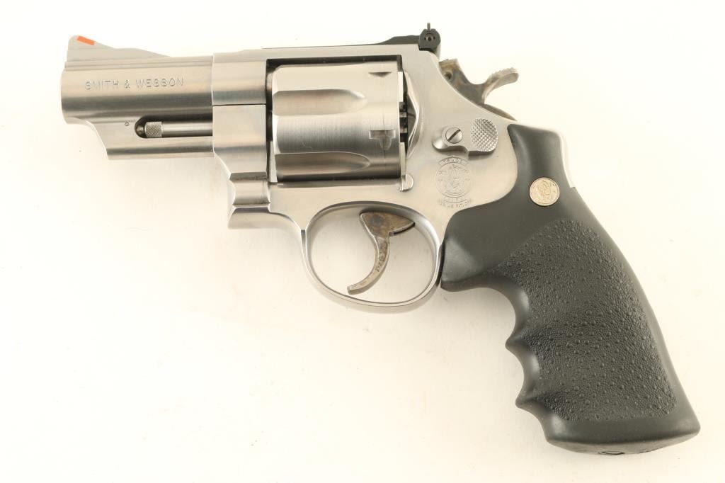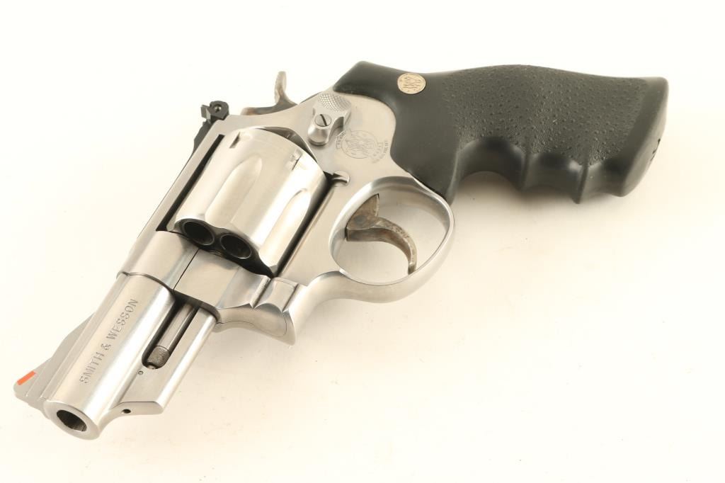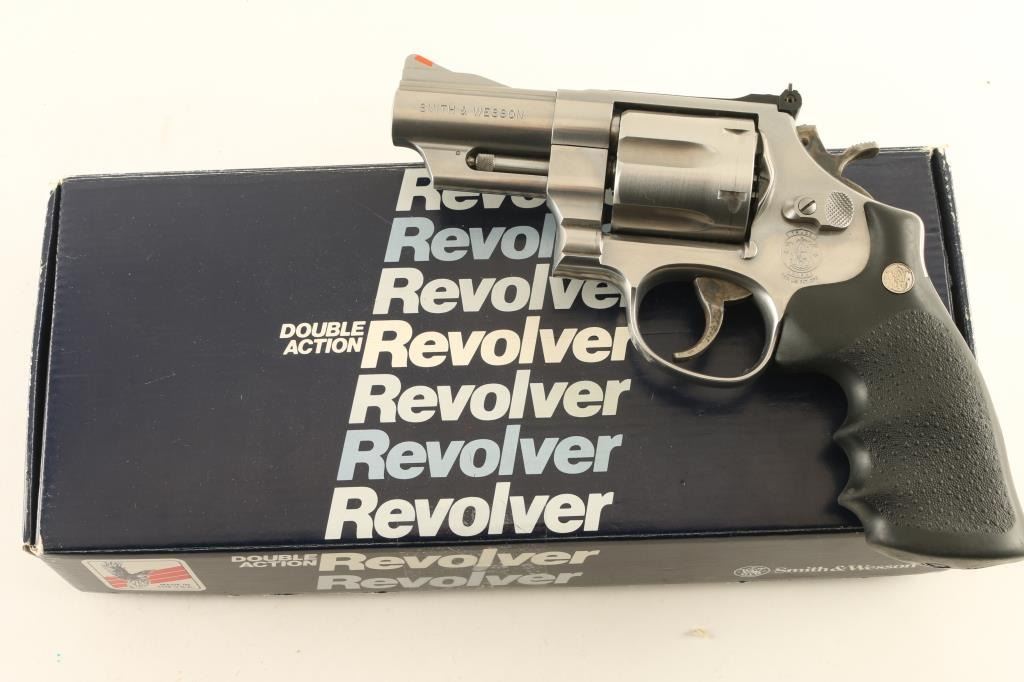 Revolver. Double-Action. 6-rd capacity. Built on the large N frame. 3" ribbed, heavy barrel, with red ramped front, and adjustable notch rear. Stainless steel finish, with case-hardened trigger, and hammer. Pebbled black synthetic Hogue grips with S&W medallions . Bore, and cylinders appear excellent/bright, but a little dirty. Action is crisp/tight. Grips are excellent. Metal finish is near excellent, with some tracking on the cylinder. Comes in original S&W box, with manual/paperwork. NRA Condition-Near Excellent. Modern Firearm.