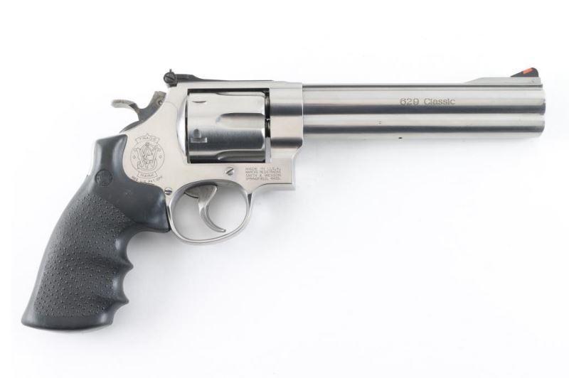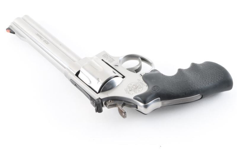 SN: CBH7443 Large frame stainless steel double-action revolver chambered in .44 Magnum. Features a brushed finish, 6" barrel with full length underlug & serrated sighting rib, raised serrated ramp front sight with orange insert, adjustable micrometer click rear sight with white outline, fluted six-shot cylinder, smooth trigger, knurled spur target hammer, hammer mounted firing pin, three screw round butt N target frame with grooved back strap, and one-piece pebbled black rubber wrap-around finger groove grip. Revolver exhibits only minor handling marks and a faint drag line on the cylinder with no major wear observed. Action is smooth with tight lock-up, the bore is pristine and the grip is near fine. Condition is NRA Excellent *** Modern Firearm ***